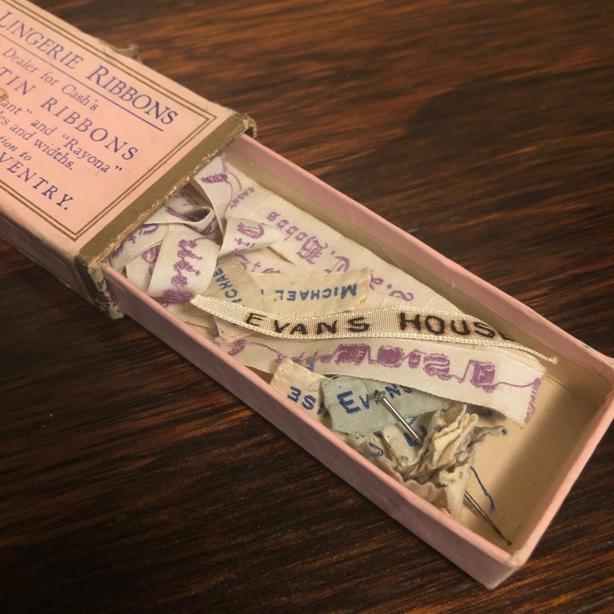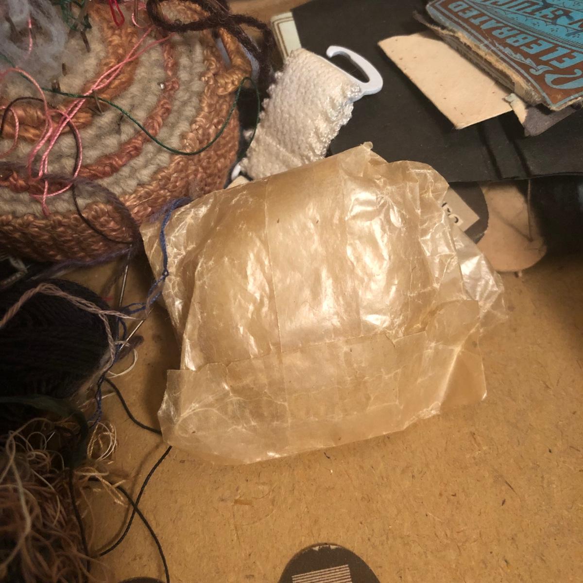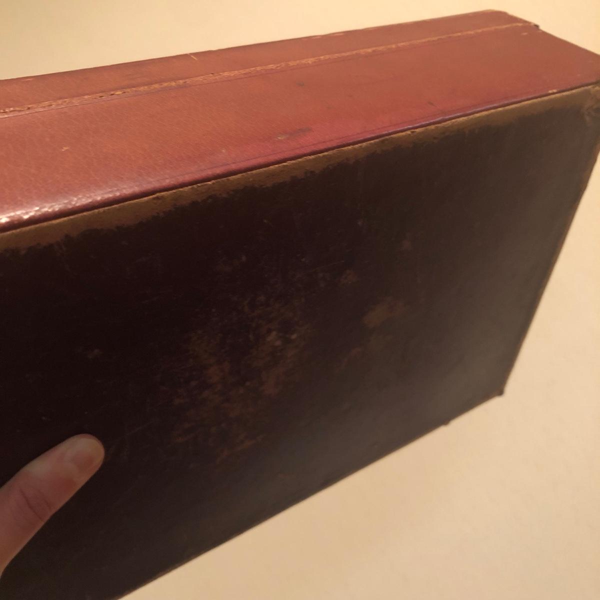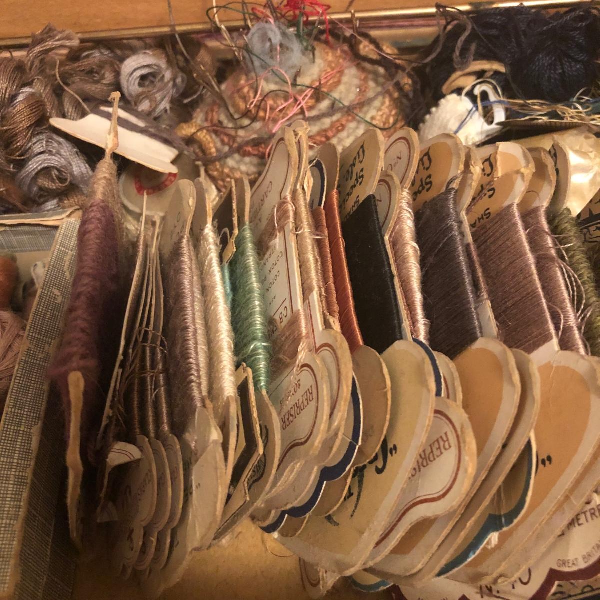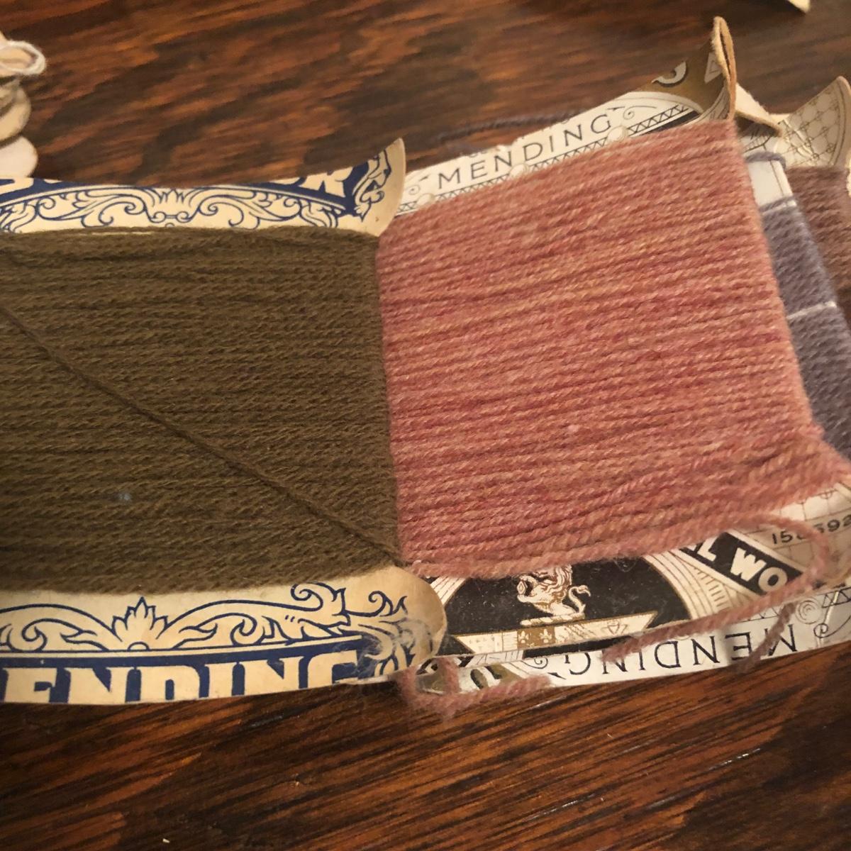 This red brown leather case opens with a skeleton key and contains antique scissors, needles, handmade pincushion, bees wax, Pringle cashmere thread, mending cotton, mending silk, and more. The lock on the box is marked Pat 137, 134 English Lever English Make.