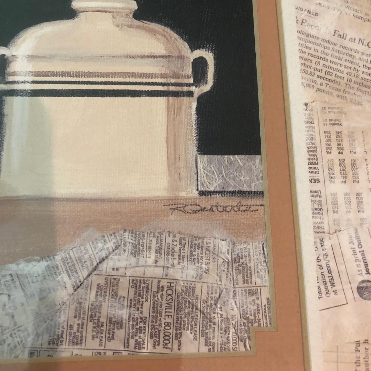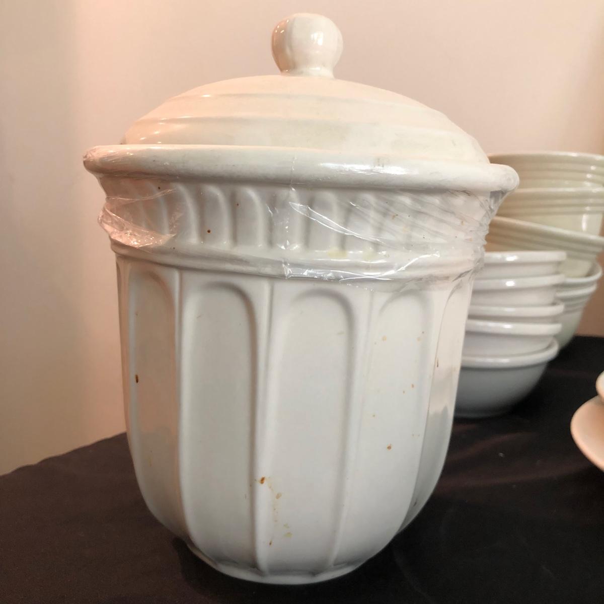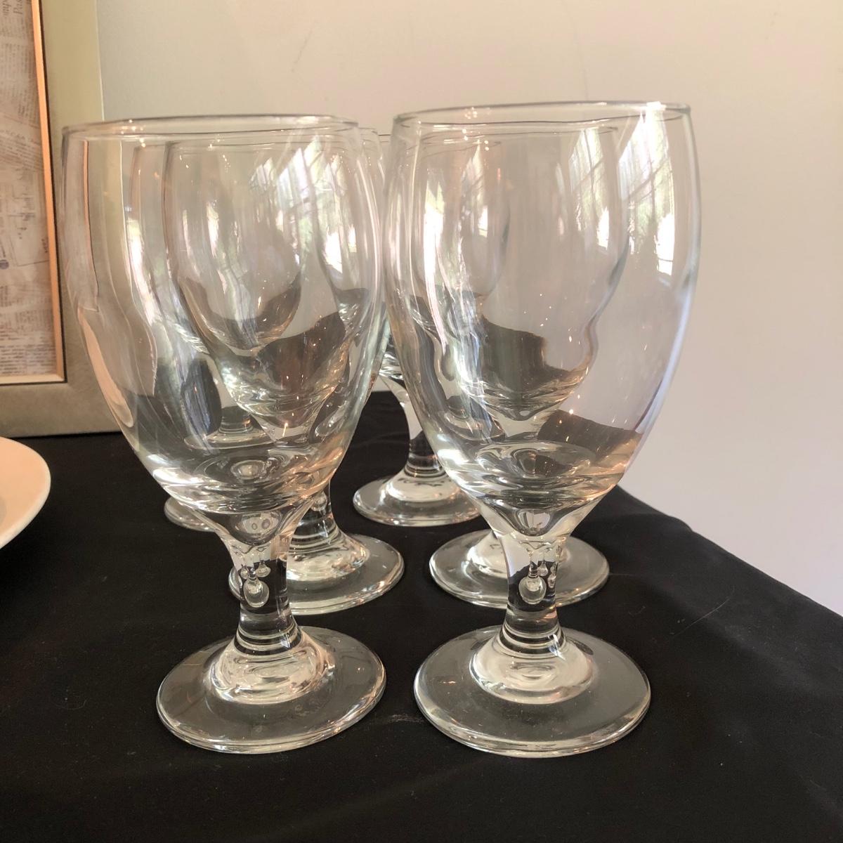 This white dishware collection includes 21 pieces of dishware, 6 glass goblets, and 1 signed print of a painting. The dishware includes 5 bowls and 1 platter by Pfaltzgraff USA, 8 saucers by Tuxton, 1 plate by Royal Norfolk, and a container with lid by Sonoma Home Goods. The print of a kitchen themed painting is framed in silver, matted, and signed. The six goblets are made of glass and measure 3.5” in diameter and about 7” tall. One of the 5 bowls with no marks on the base does have a crack in the base as pictured. Shipping available.