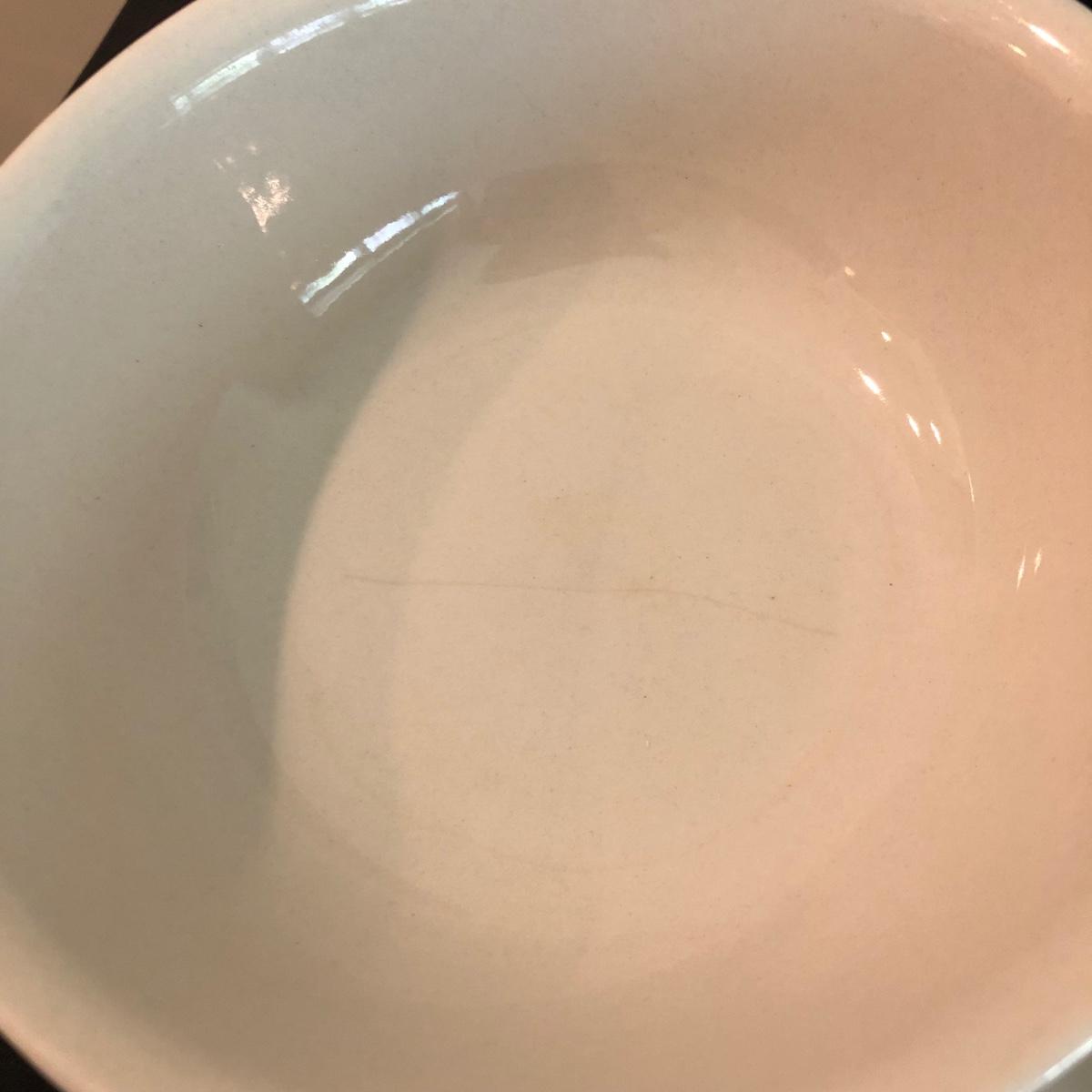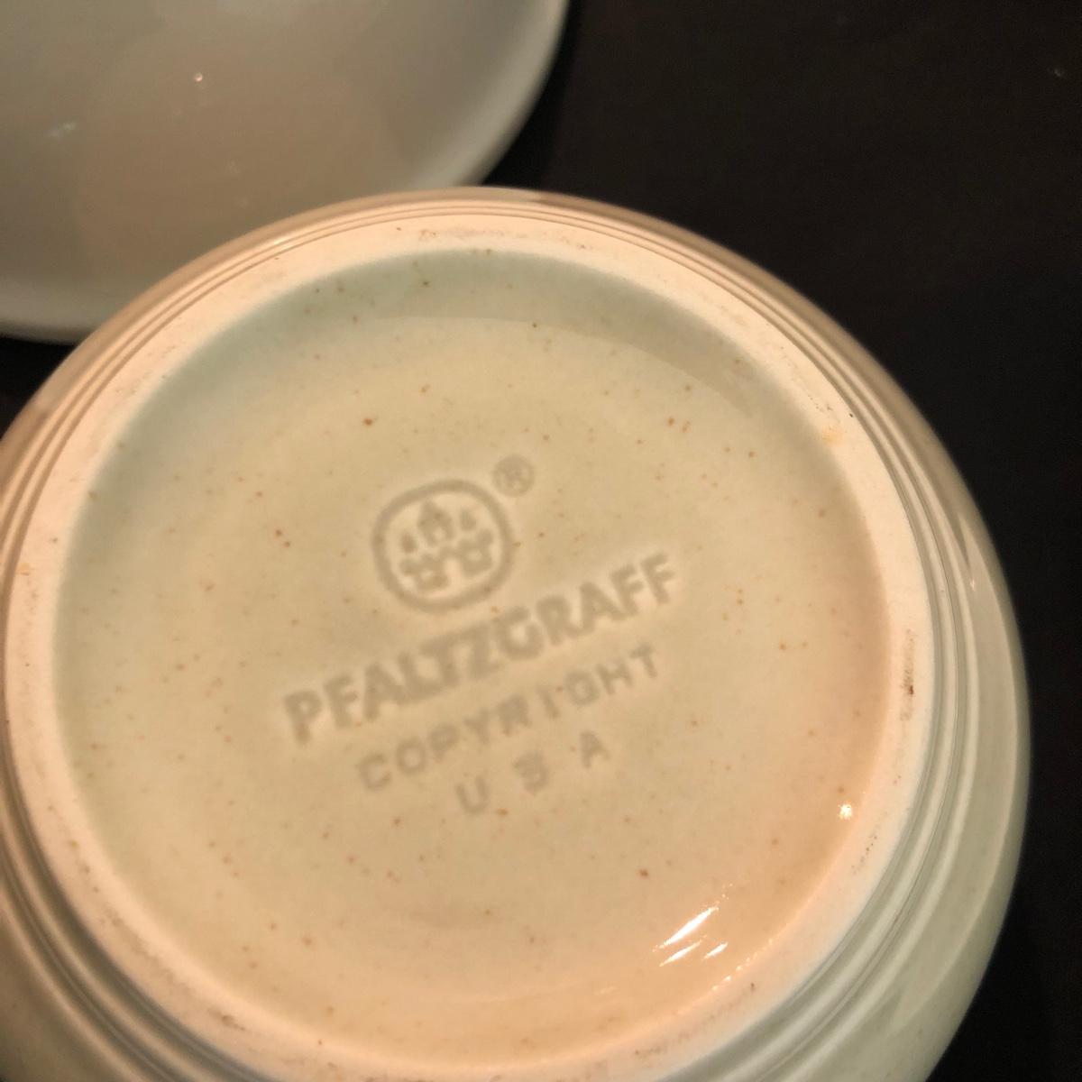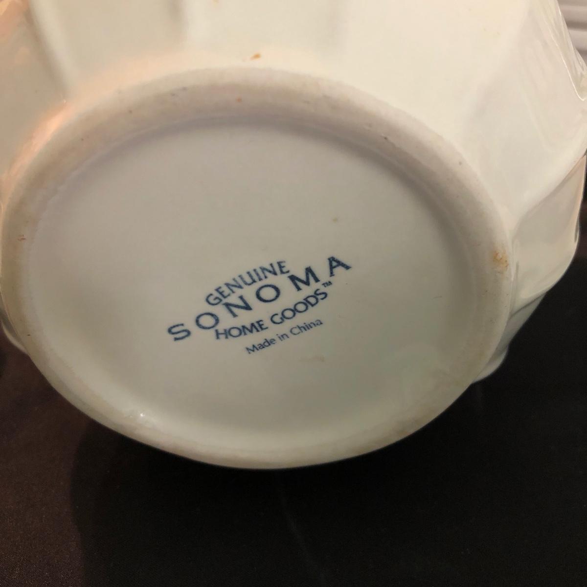 This white dishware collection includes 21 pieces of dishware, 6 glass goblets, and 1 signed print of a painting. The dishware includes 5 bowls and 1 platter by Pfaltzgraff USA, 8 saucers by Tuxton, 1 plate by Royal Norfolk, and a container with lid by Sonoma Home Goods. The print of a kitchen themed painting is framed in silver, matted, and signed. The six goblets are made of glass and measure 3.5” in diameter and about 7” tall. One of the 5 bowls with no marks on the base does have a crack in the base as pictured. Shipping available.