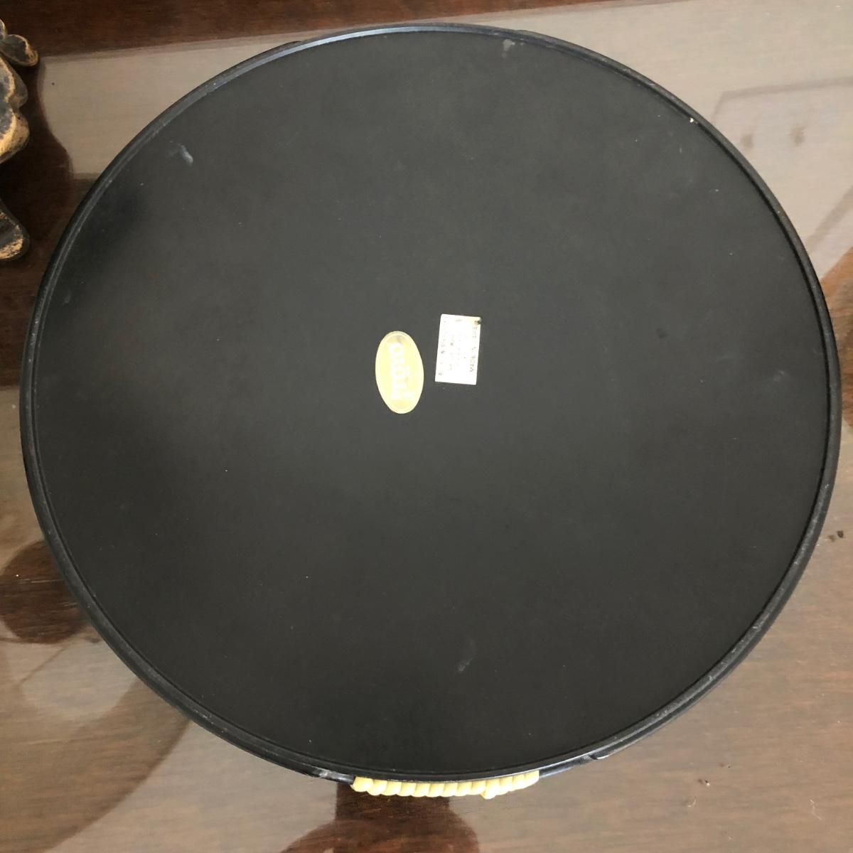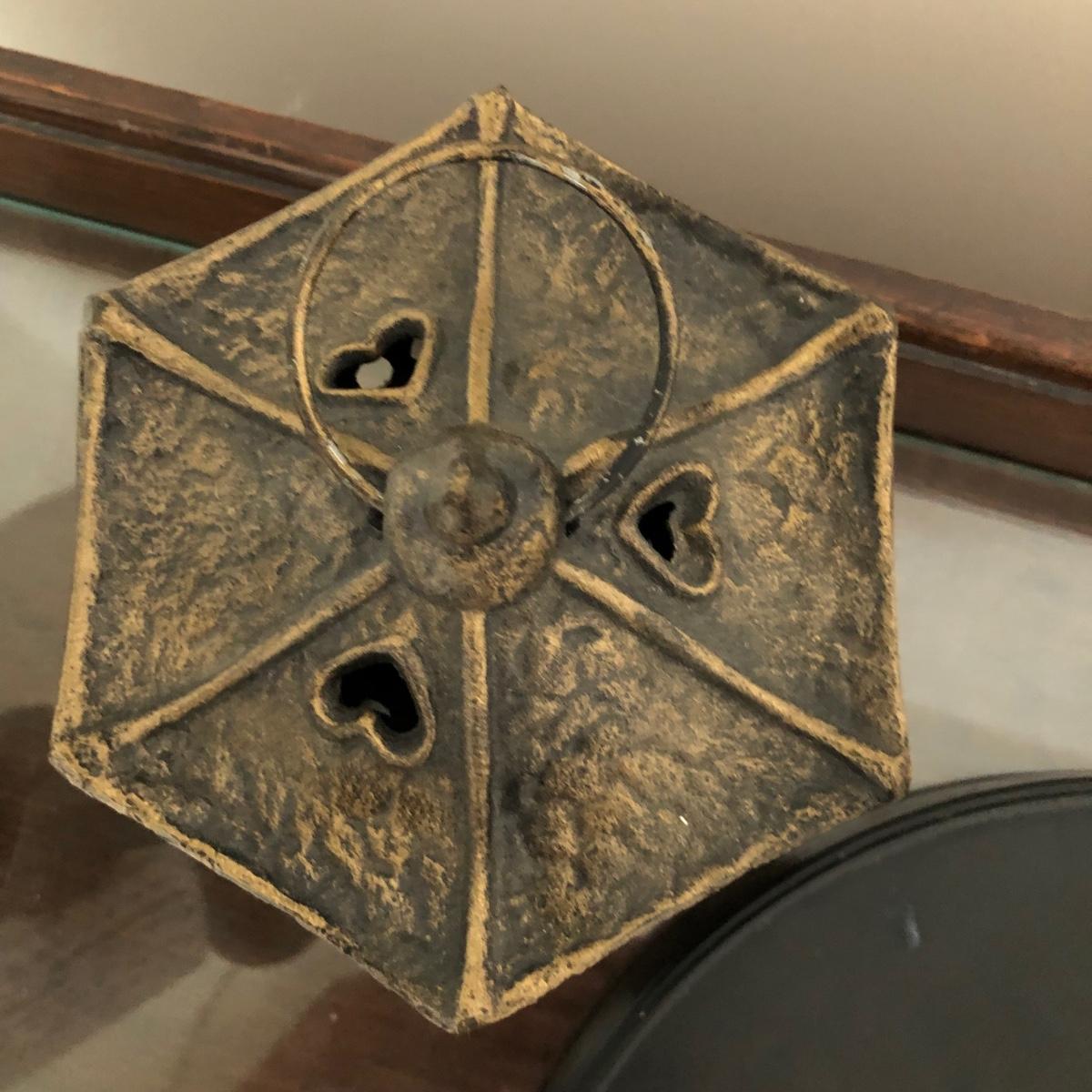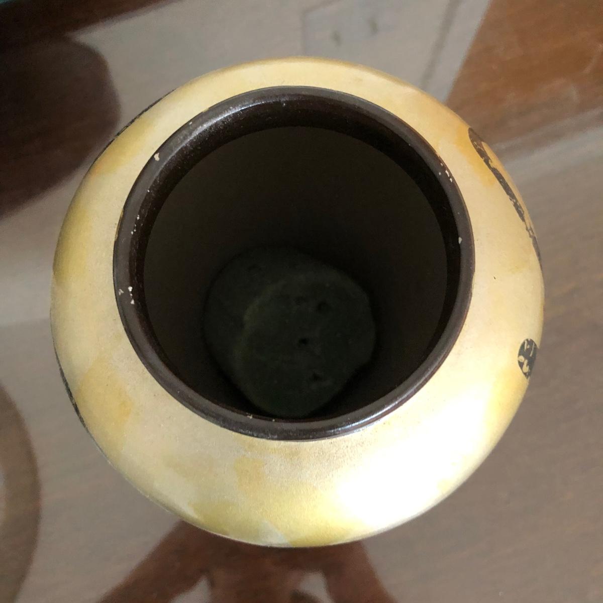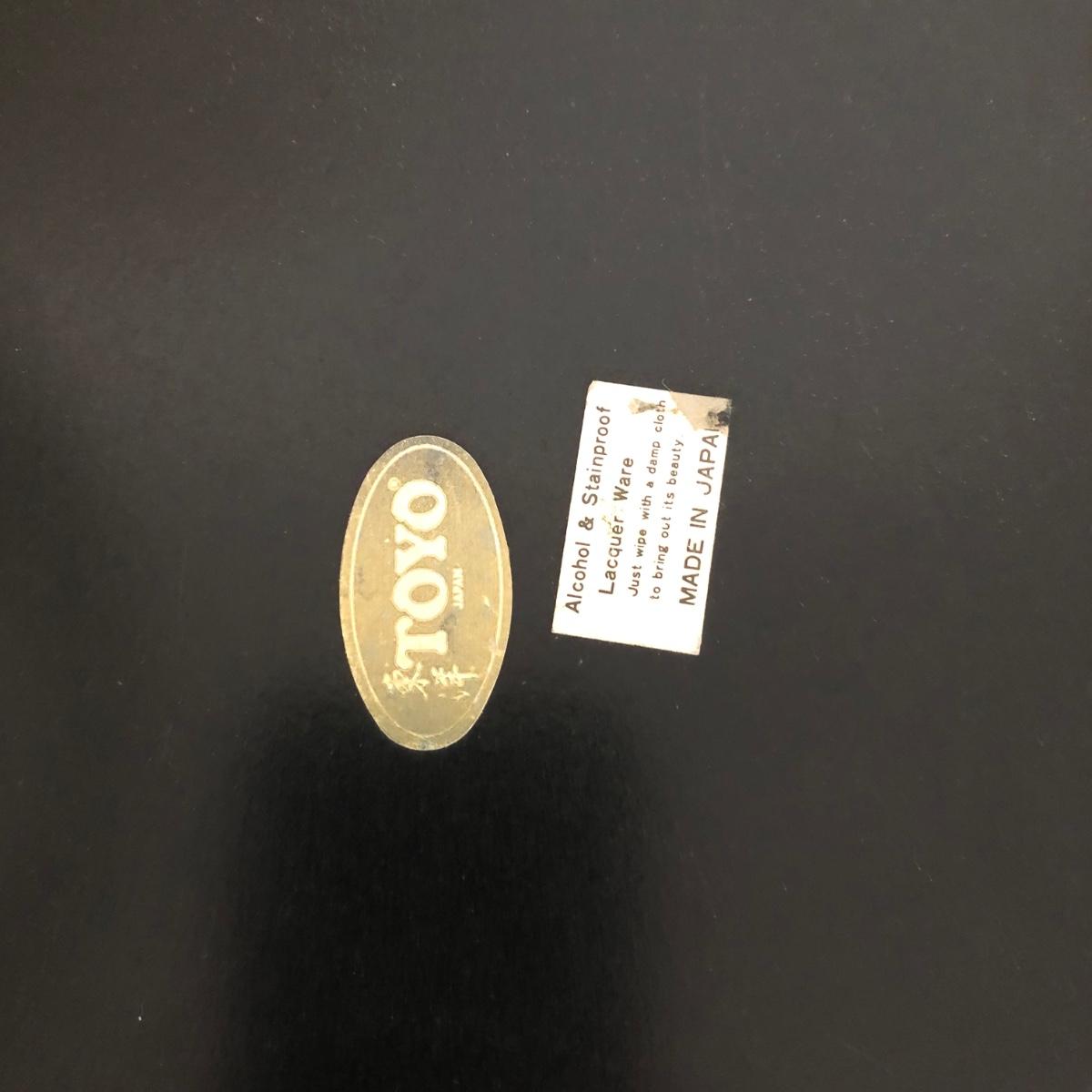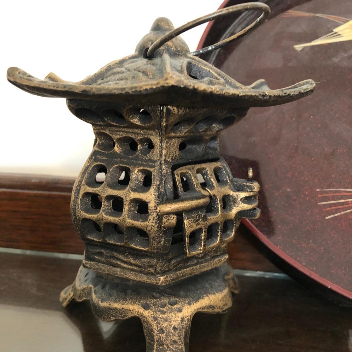 The gold tone metal pagoda candle holder has an opening door held tightly closed by a moveable spring. A tea candle can be placed inside the pagoda. The ceramic flower vase with Asian lettering is gold, black, and red and is 8.5" tall and 5" in diameter. A vintage lacquer ware tray has red sparkles and a painted gold fan with orange flowers. The tray has a sticker saying Toyo on the base. Shipping available.