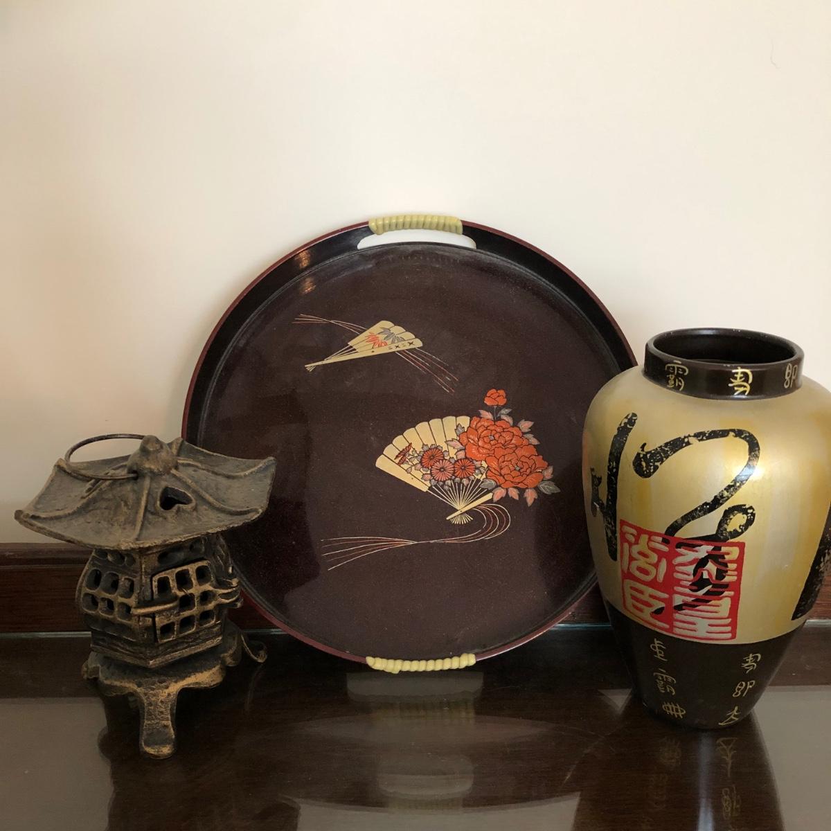 Metal Pagoda Candle Holder, Japanese Lacquer Ware Tray, and Vase with Asian Letters (UR-JF)