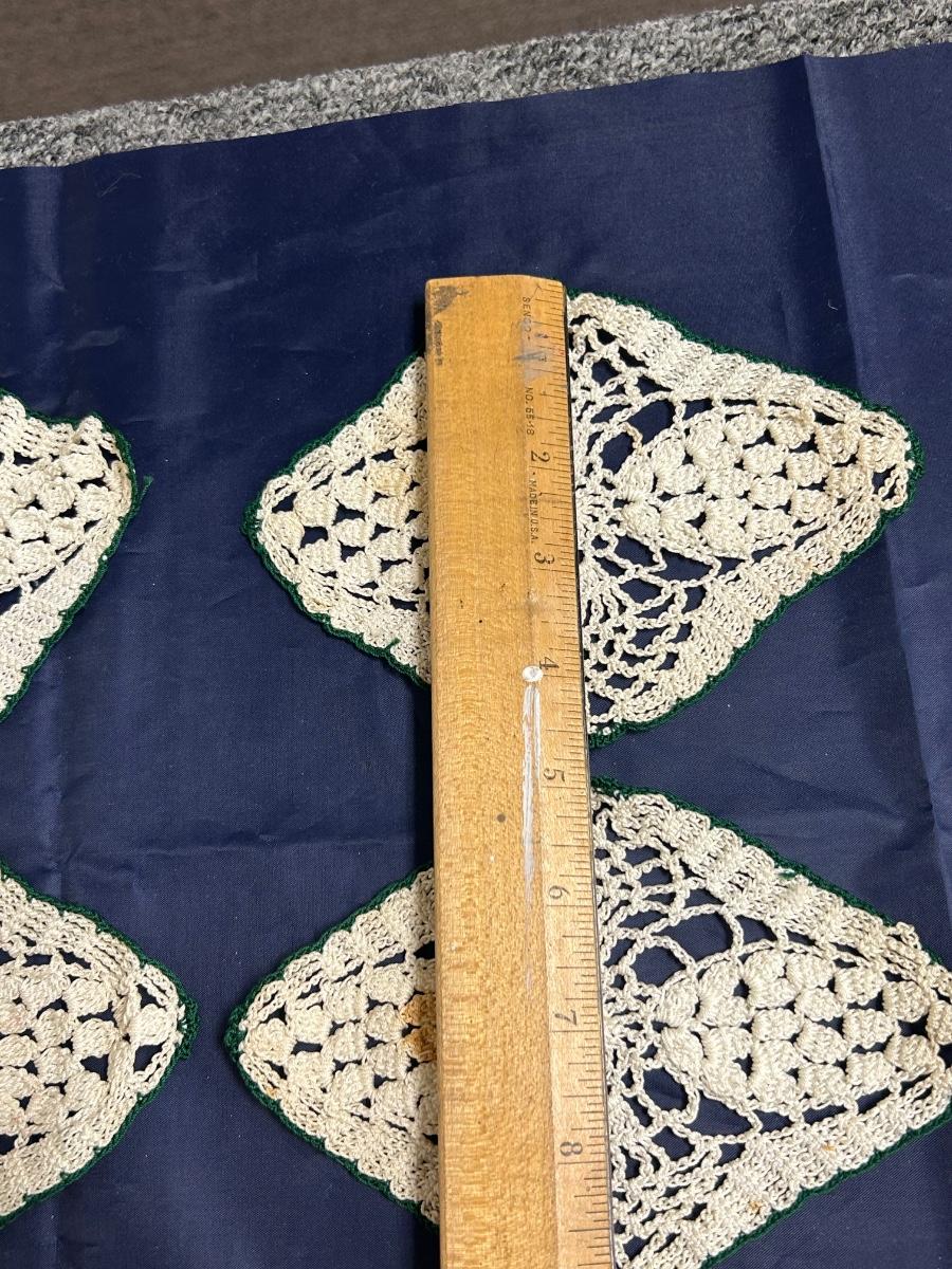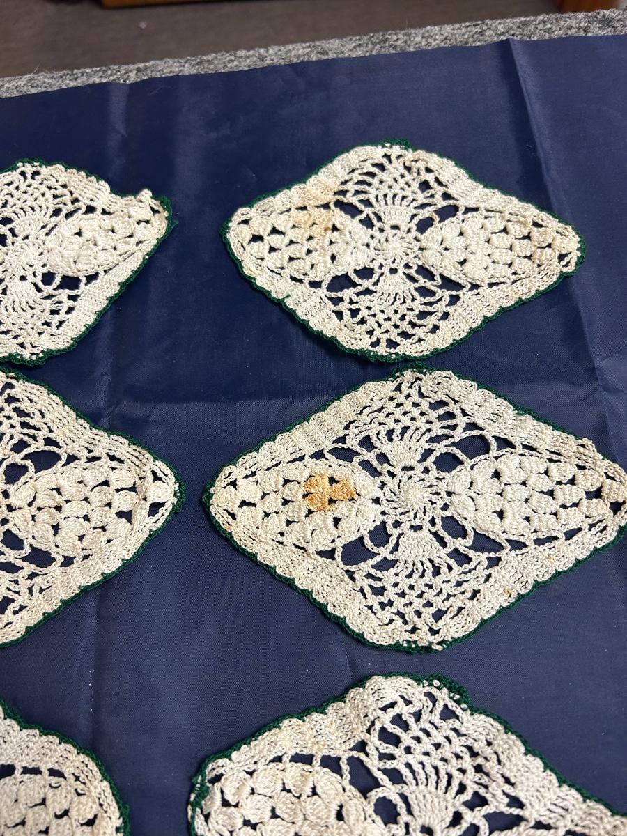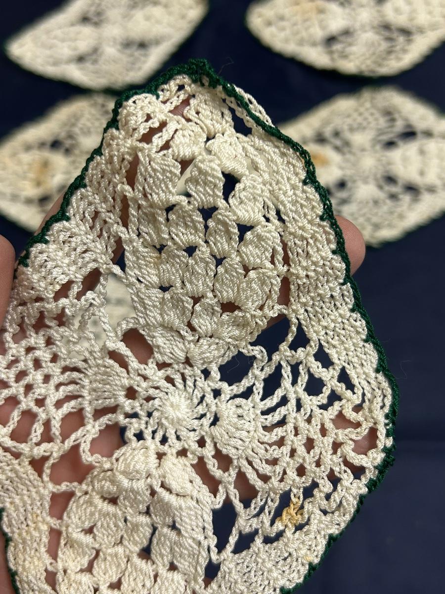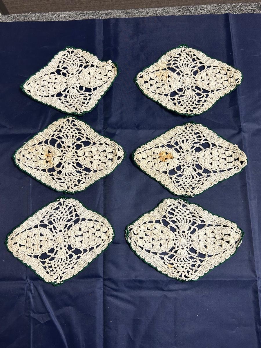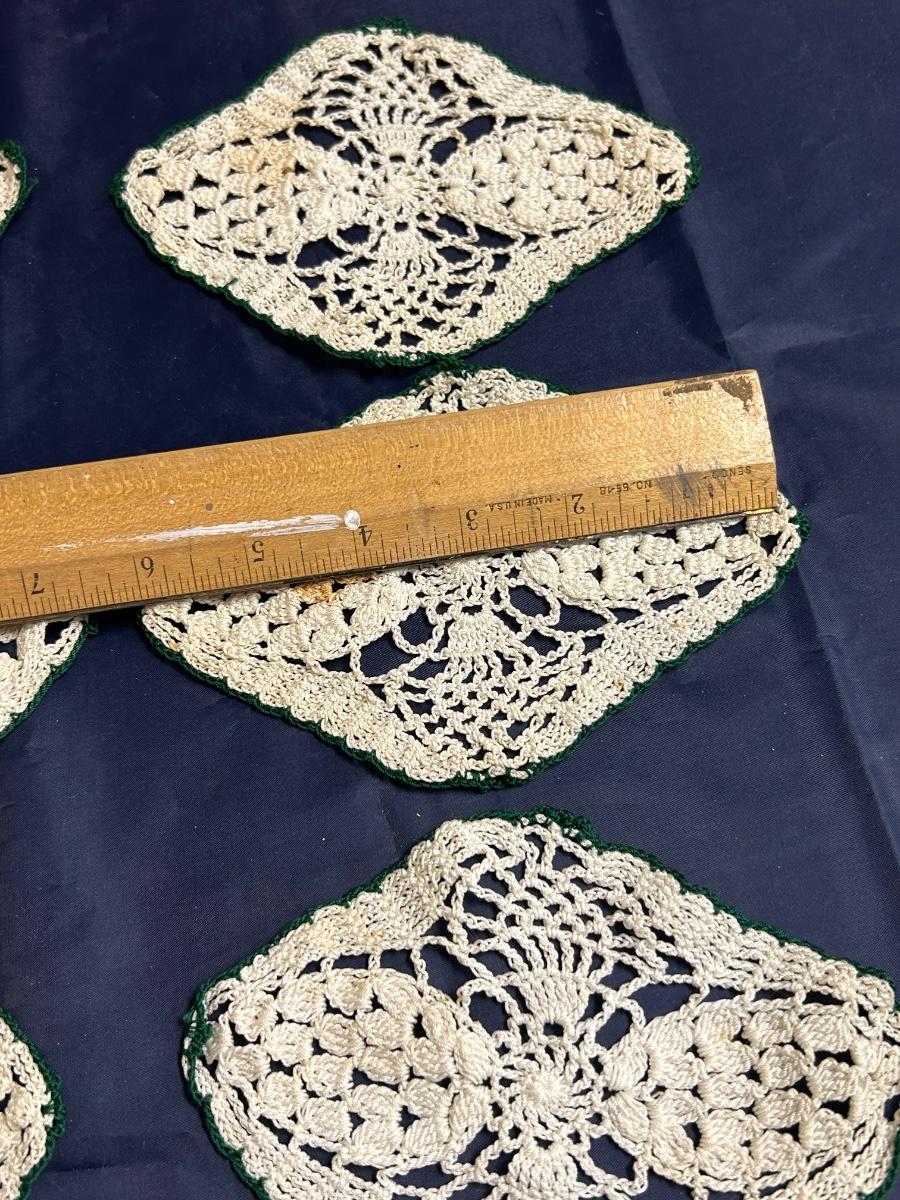 Lot of Six Diamond Shaped Coaster Sized Doilies White with Green Edge