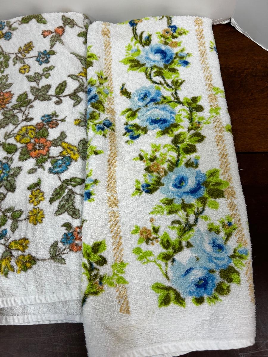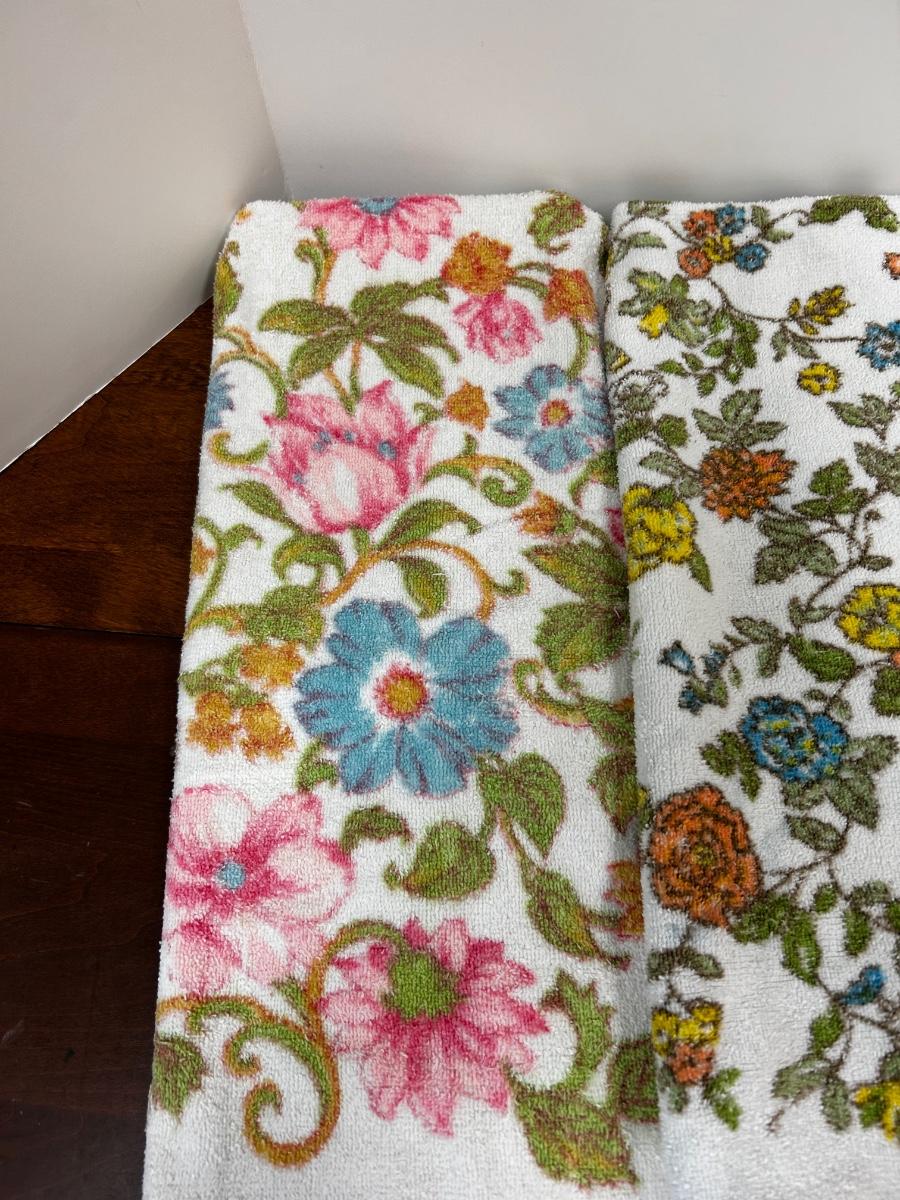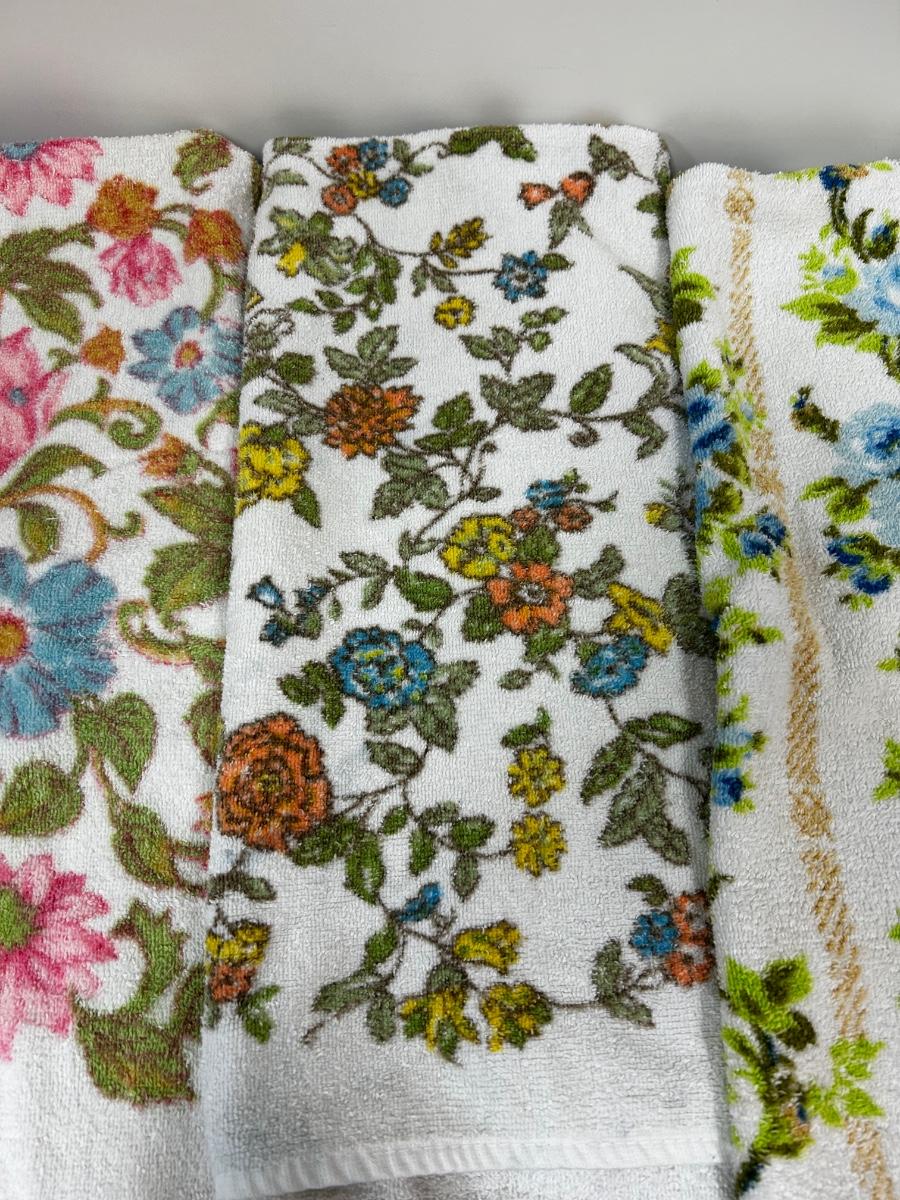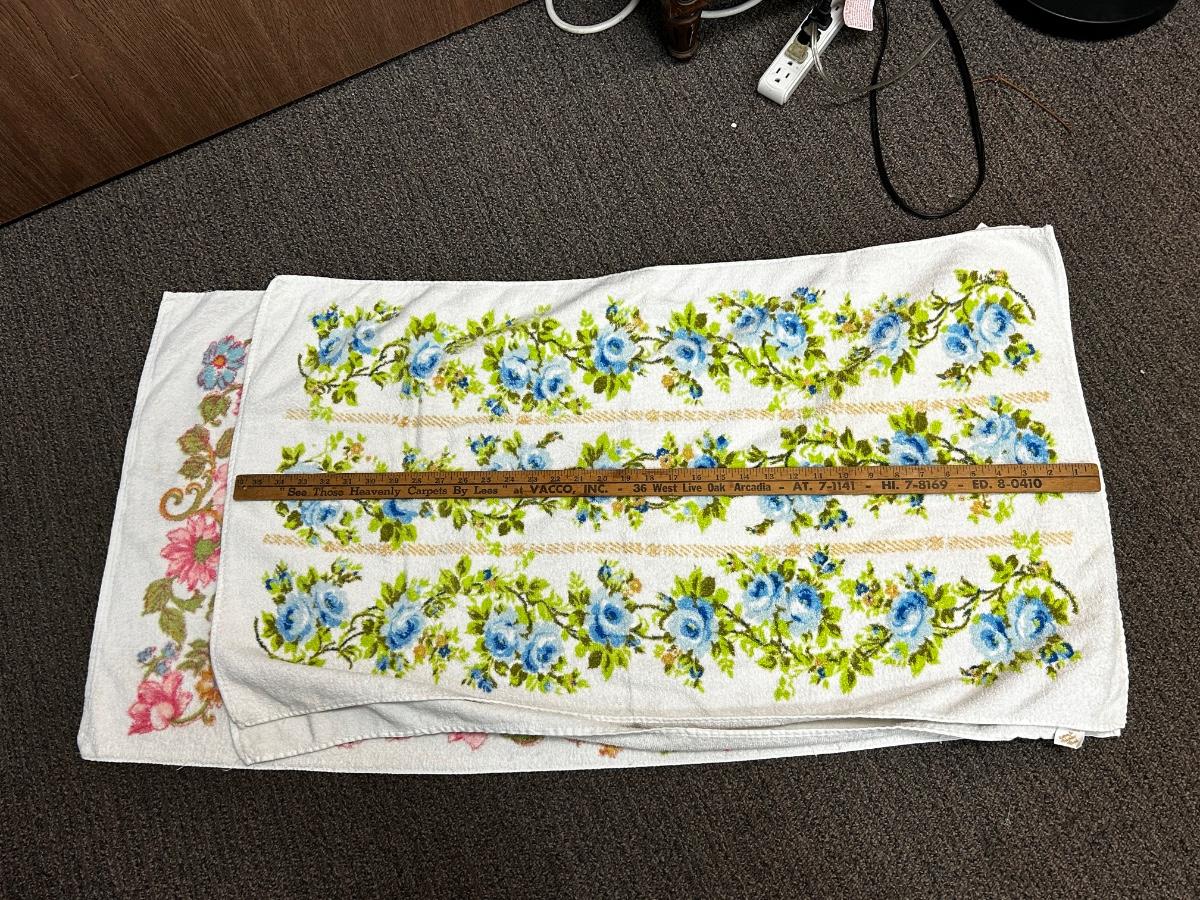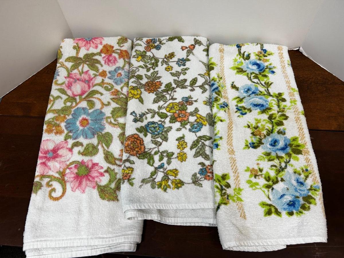 Lot of Three Vintage Floral Print Bath Towels. In vintage condition, no major spots or holes, may have a faint spot or two. Too big for hand towel but on the small side for a bath towel.