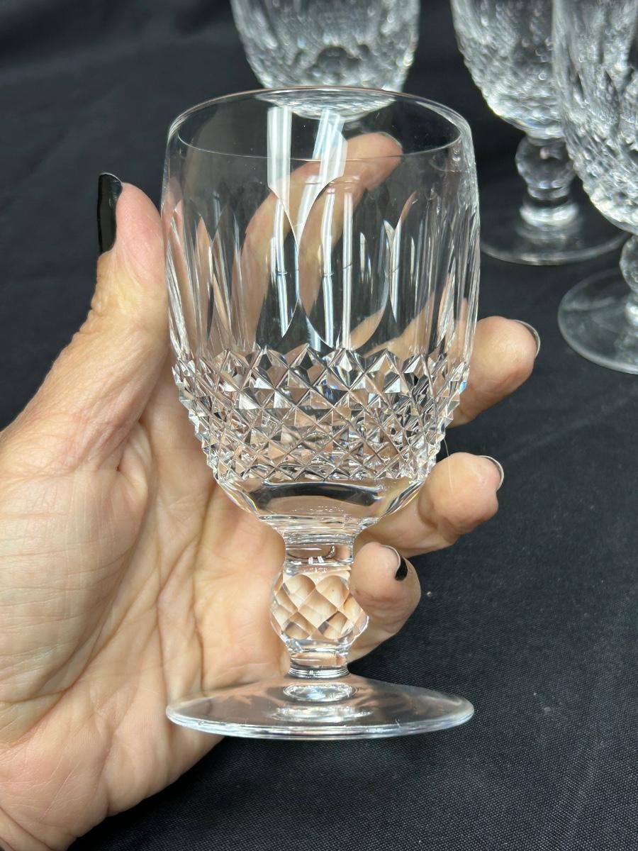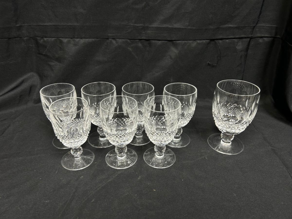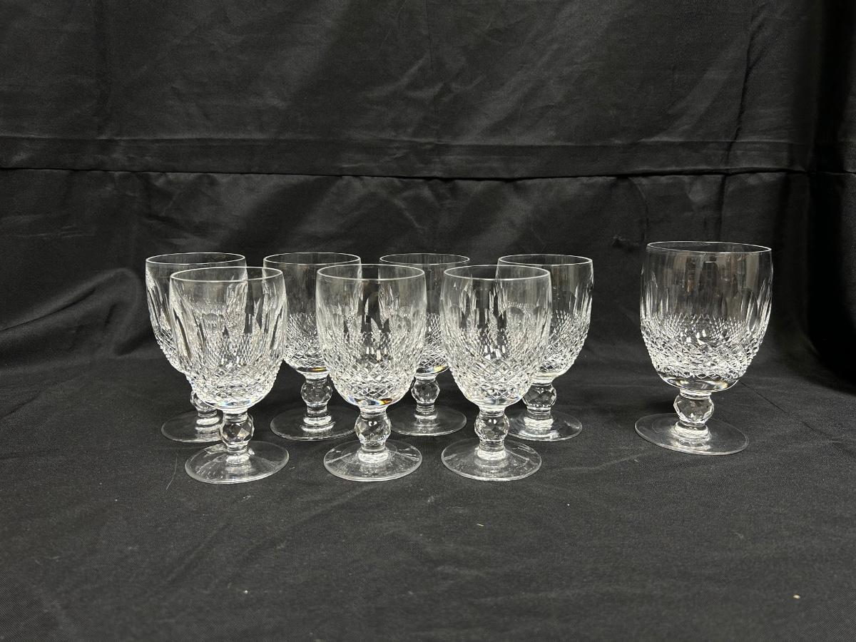 Vintage Waterford Crystal Small Wine Water Goblets Thumbprint and Diamond Cut. Set of 7 small and one large. In good condition, no chipped pieces.
