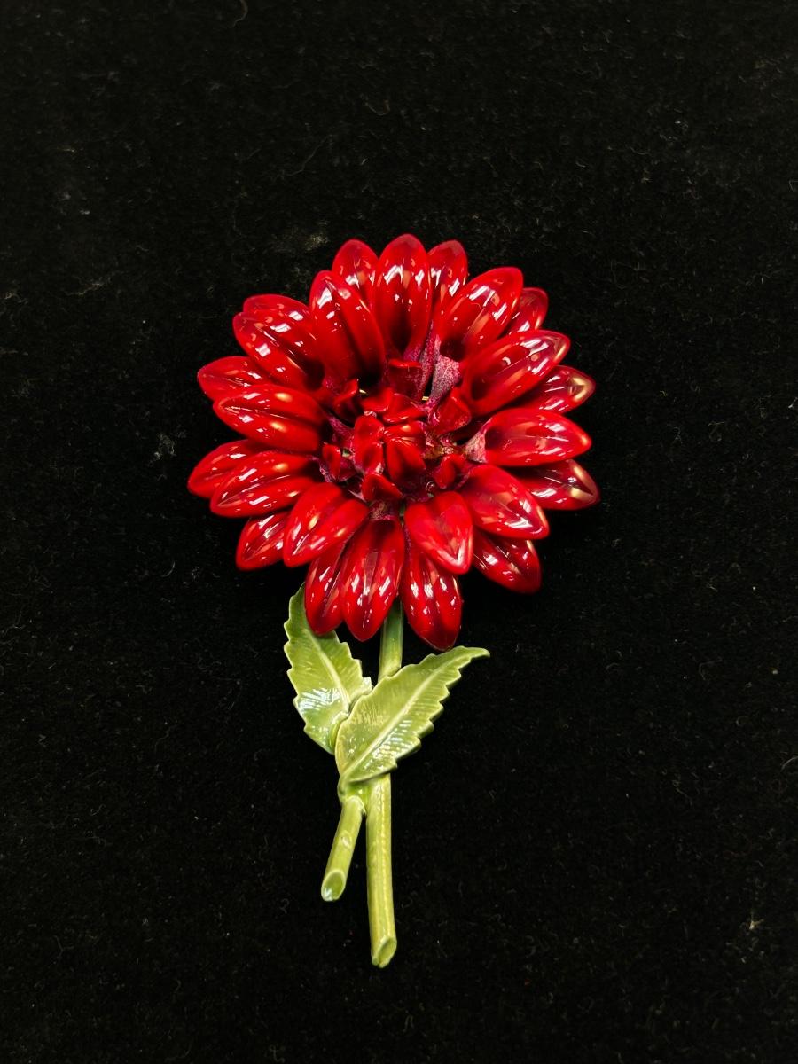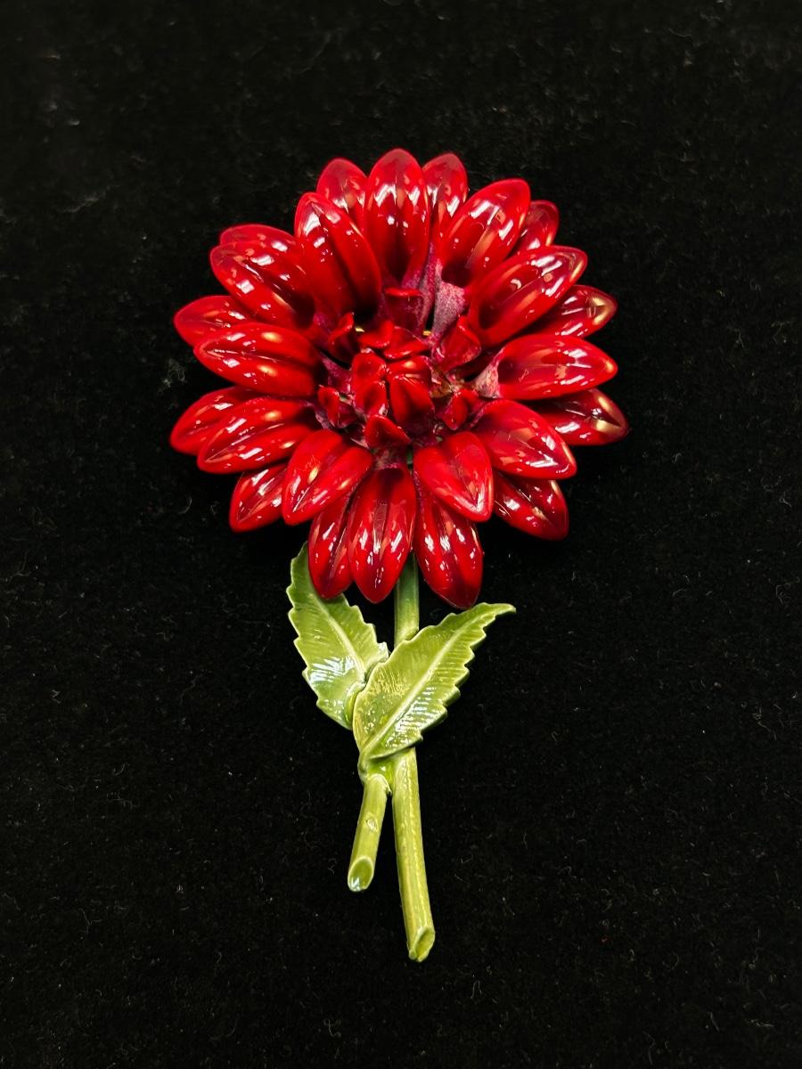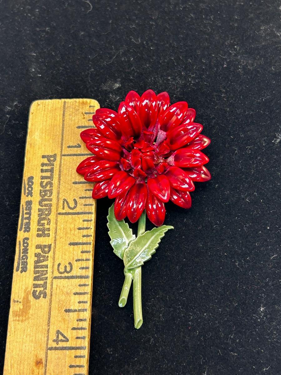 Red Enameled Metal Flower Pin Brooch. In good condition.
