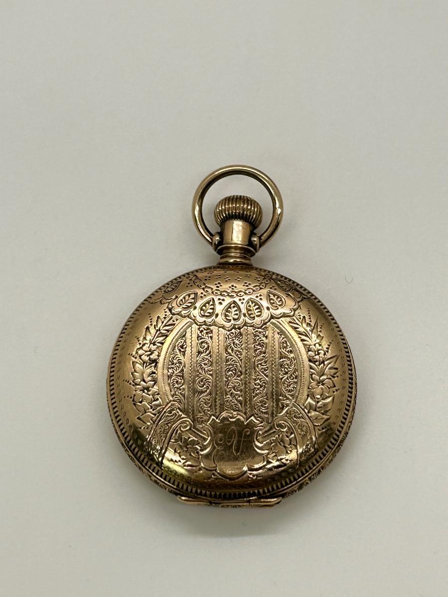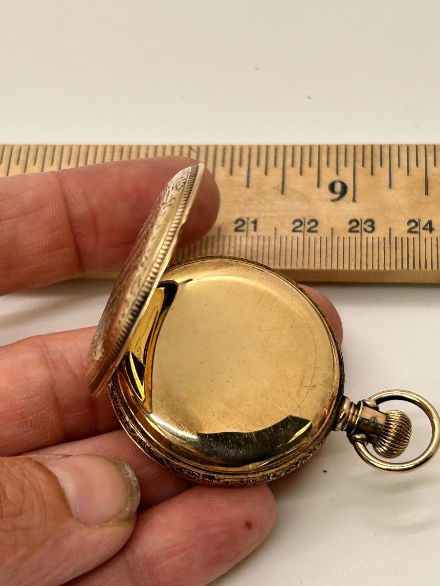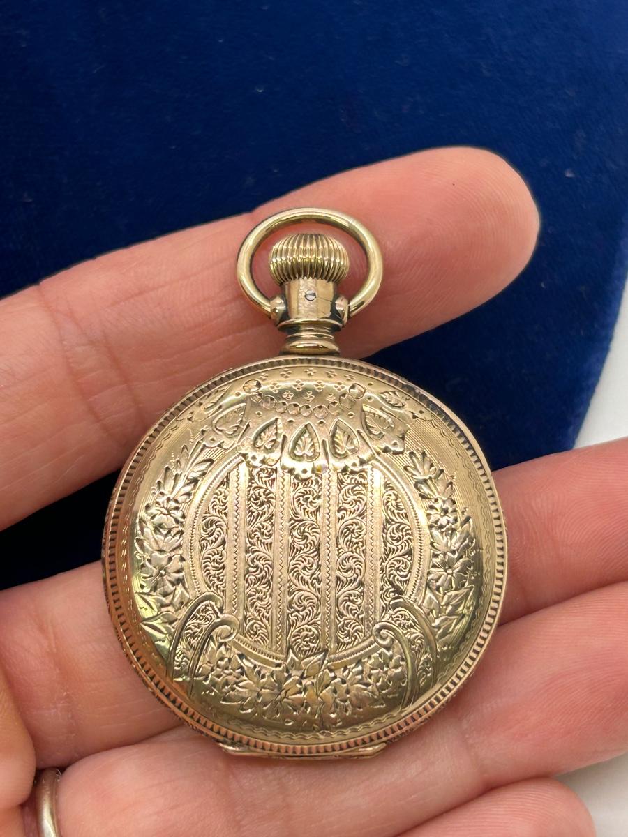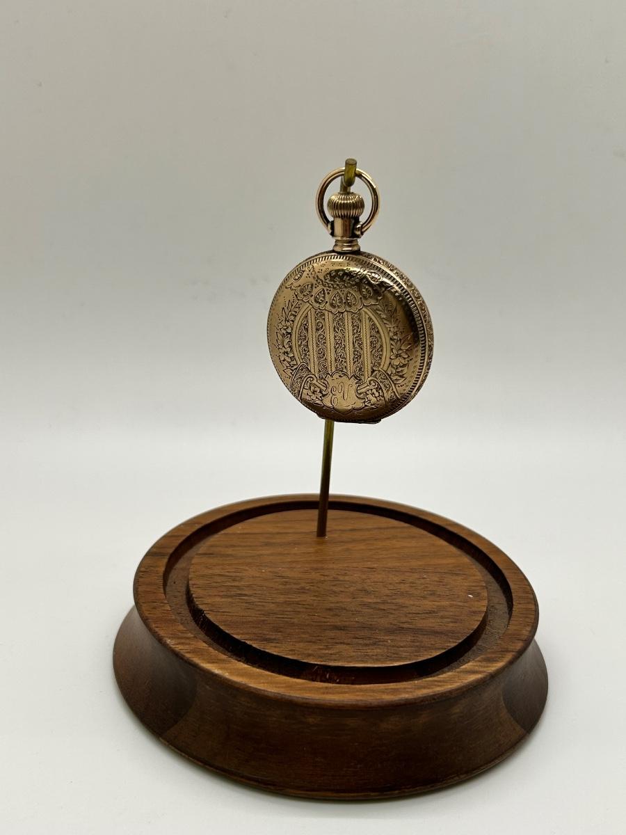 Antique Vintage Illinois Small Pocket Watch Numbered Running. In good condition, works, but face looks to have fine line cracks from age. No gold marks found but there is a serial number inside the back of case. Looks gold fill or plate. Comes with display hanger but no glass dome.