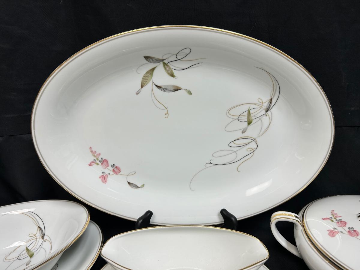 Vintage RC Royal China Noritake Japan Service for 12 China Set with Serving Pieces Pink Flower Black Swirl. 7-piece place setting includes dinner plate, salad plate, soup bowl, berry bowl, bread plate, cup, and saucer. Complete service for 12. Comes with serving pieces; lidded casserole, large platter, small platter, serving bowl, gravy/sauce boat with attached drip plate, creamer, and lidded sugar bowl. One dinner plate has a chip on the underside edge, may be flea bite chips but the one plate was the only noticeable chip.