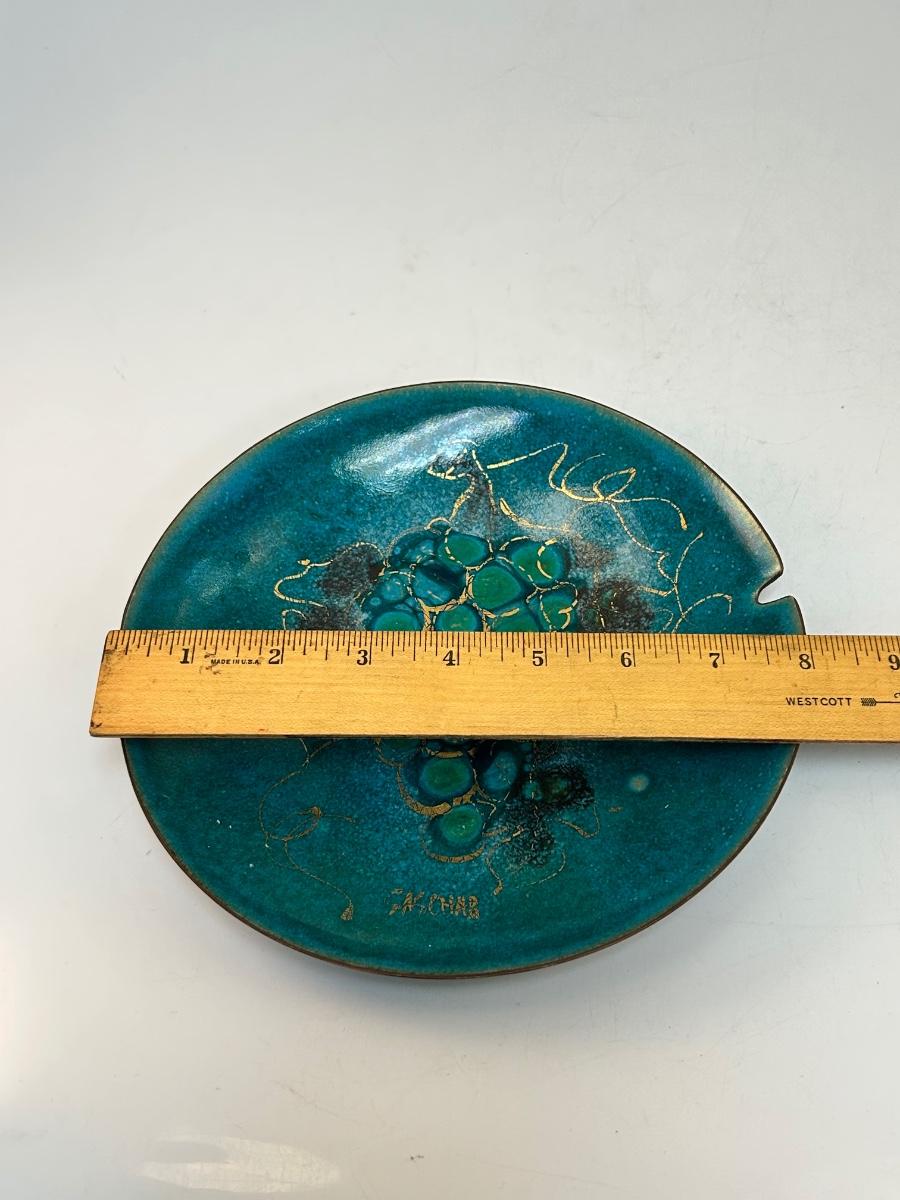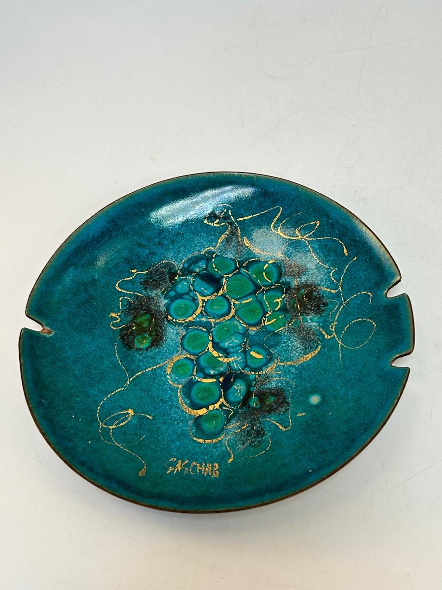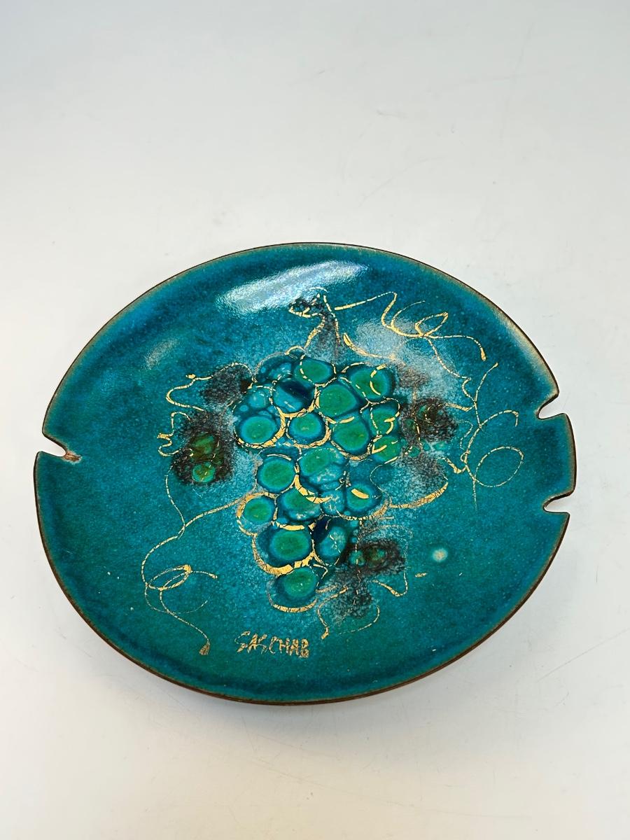 Vintage Mid-Century Enamel on Metal Sasha B Brastoff Grape Pattern Ashtray Trinket Dish. Deep turquois peacock blue color with gold accent. Signed Sasha B. 8" size.