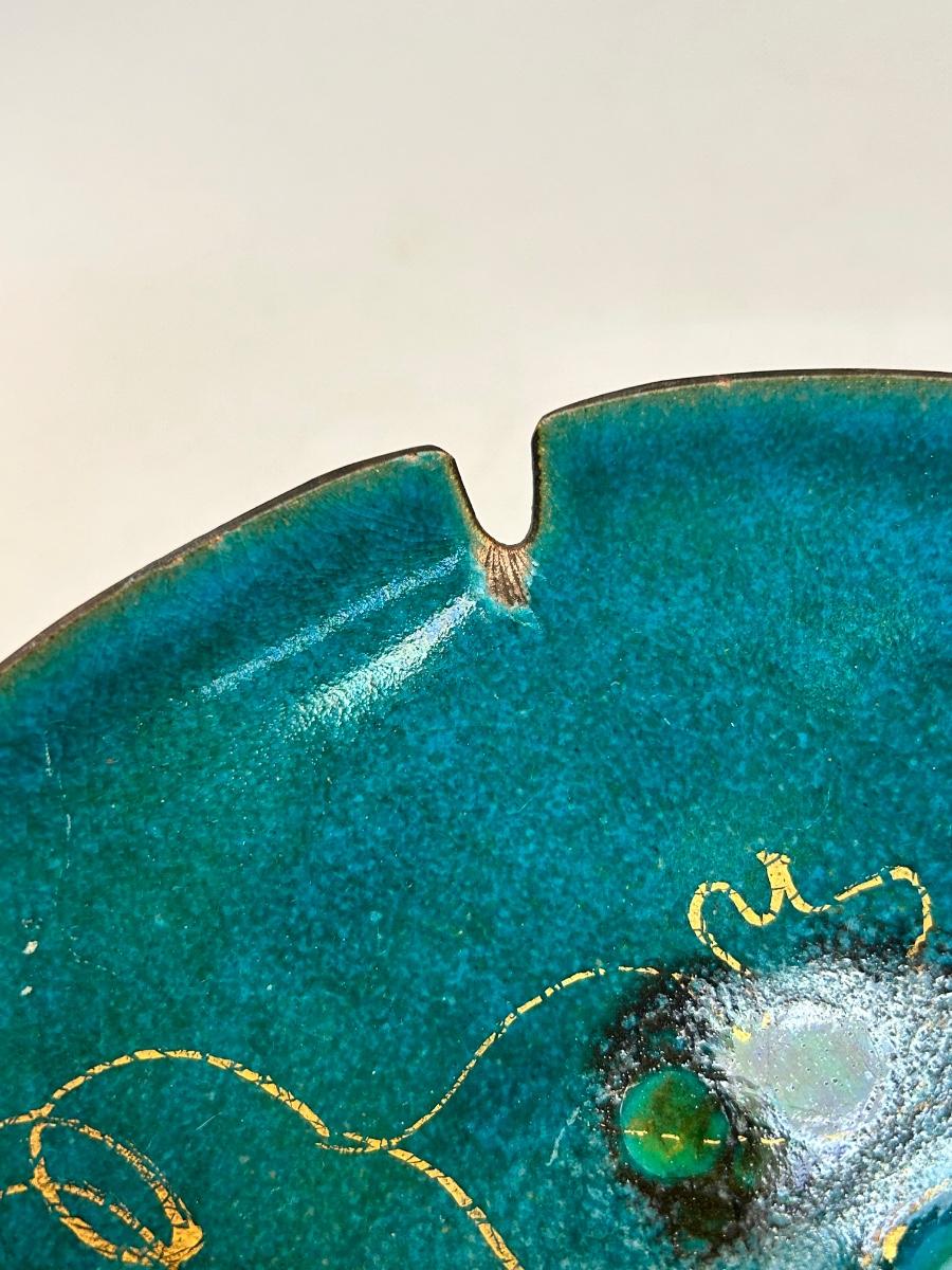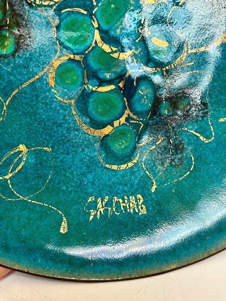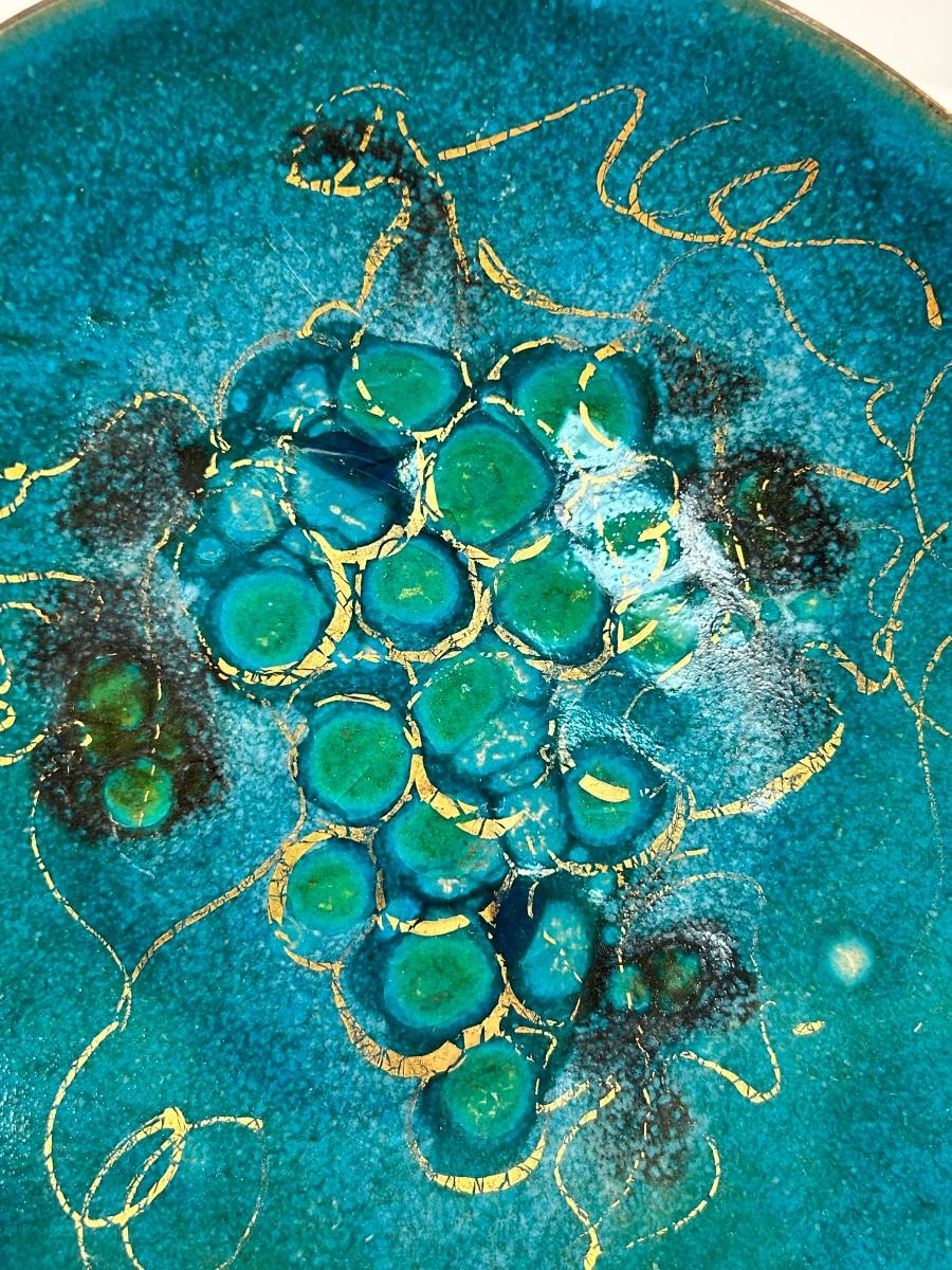 Vintage Mid-Century Enamel on Metal Sasha B Brastoff Grape Pattern Ashtray Trinket Dish. Deep turquois peacock blue color with gold accent. Signed Sasha B. 8" size.