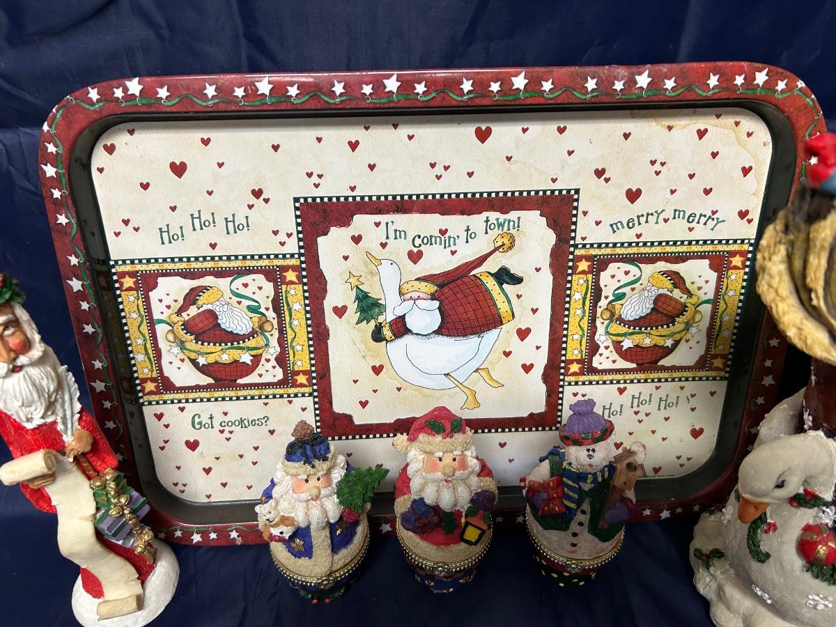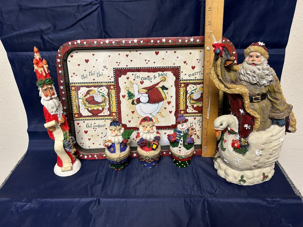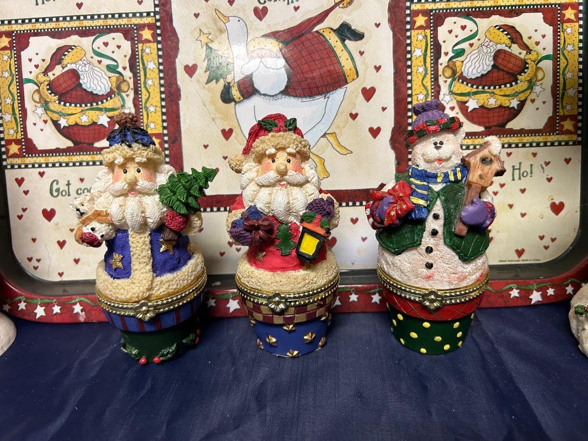 Folk Art Style Christmas Holiday Decor Lot Metal Tray Figurines Trinket Boxes. In previously displayed condition.