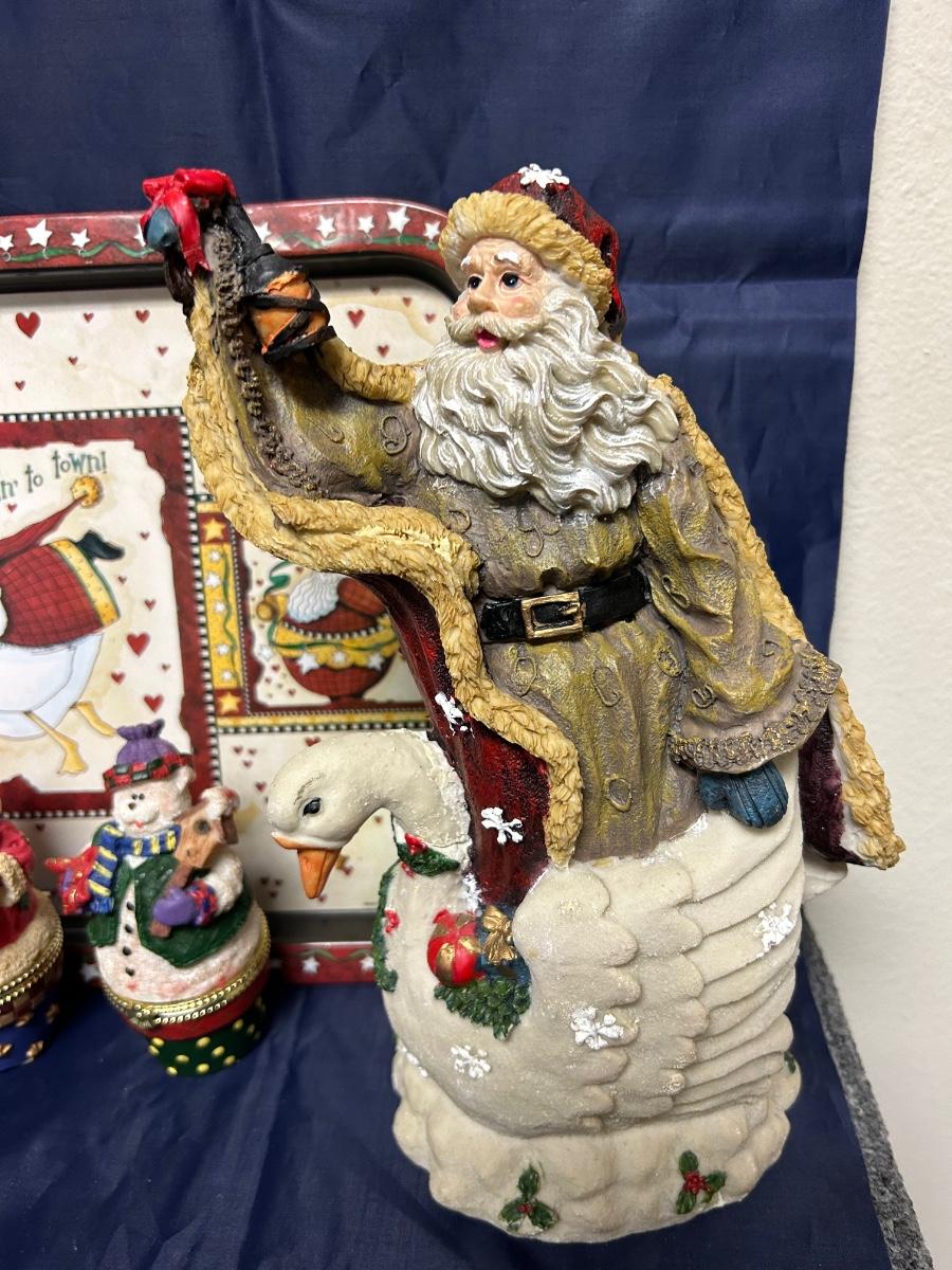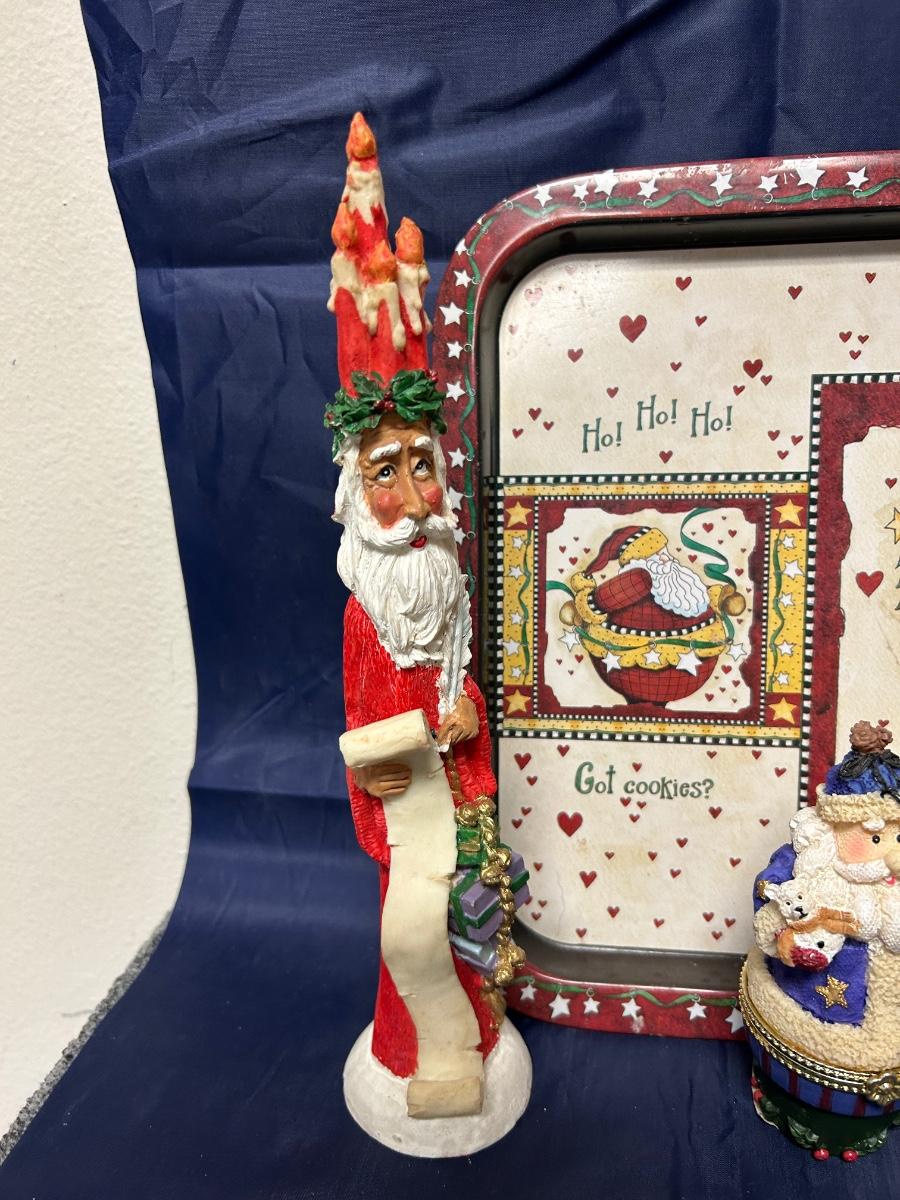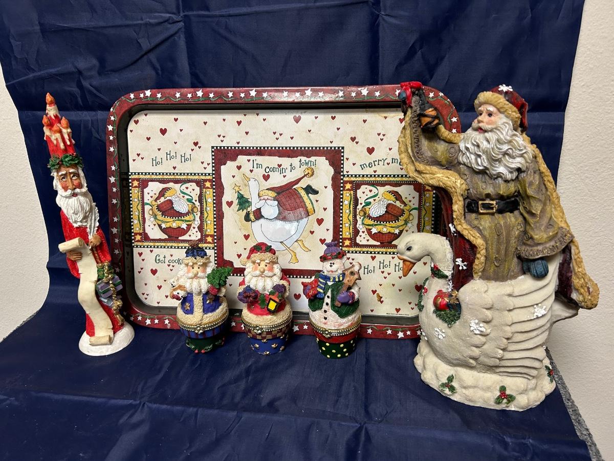 Folk Art Style Christmas Holiday Decor Lot Metal Tray Figurines Trinket Boxes. In previously displayed condition.
