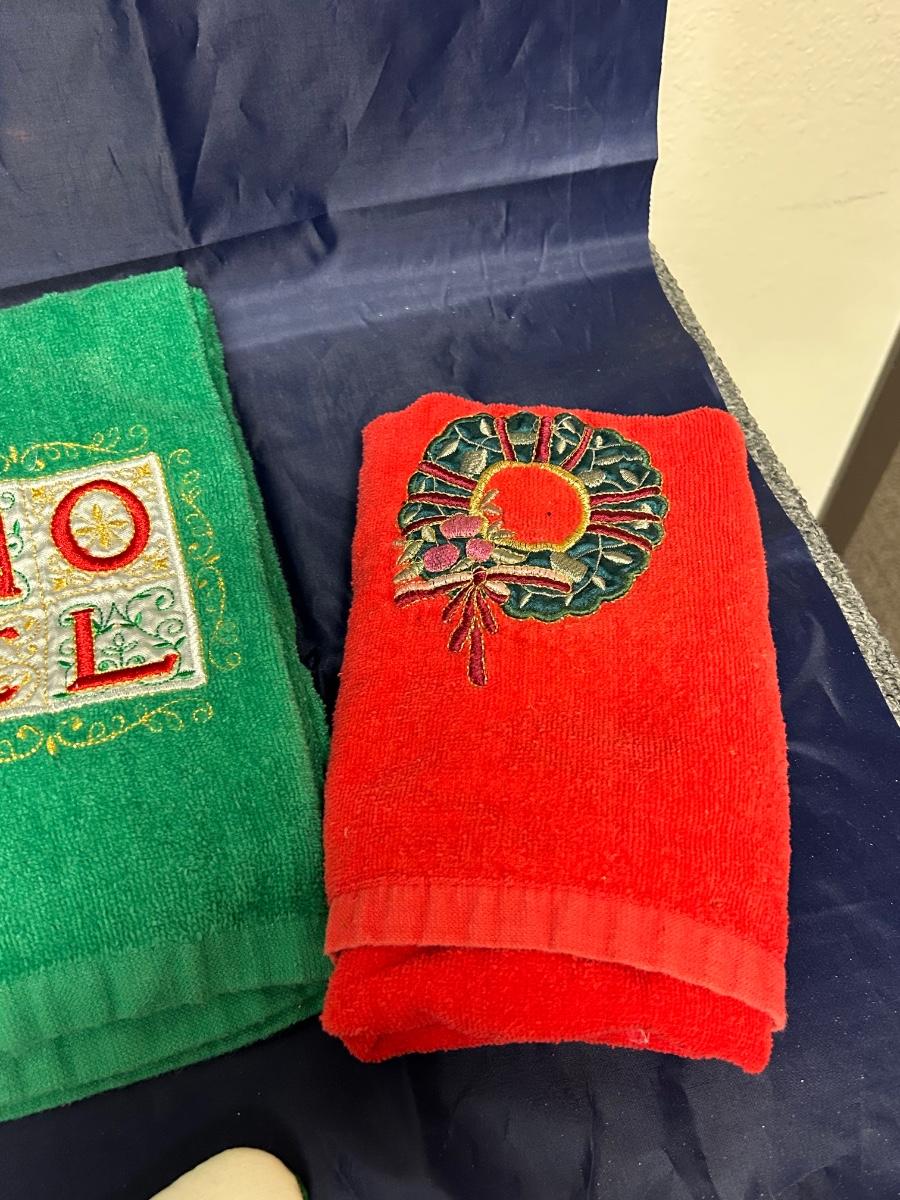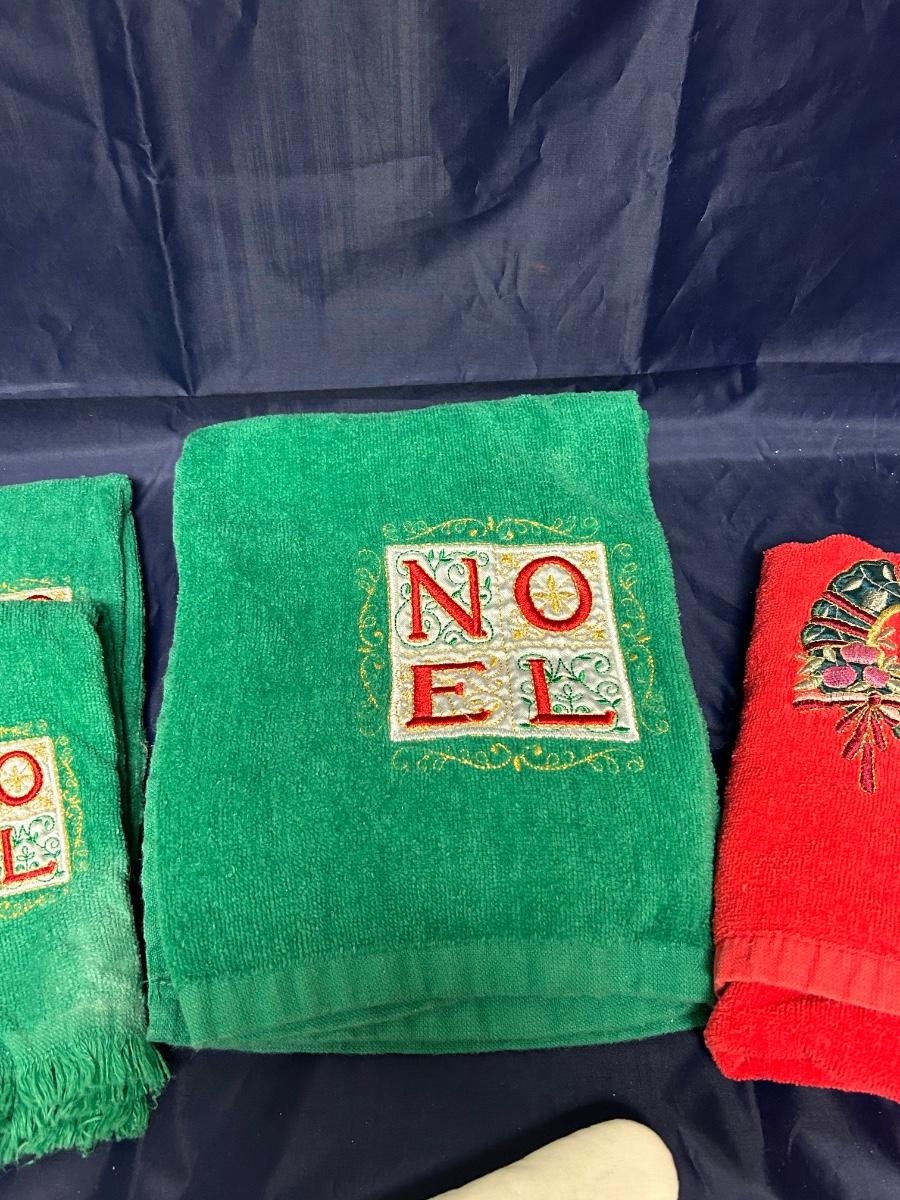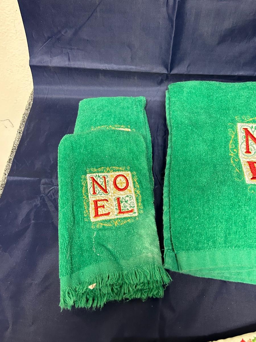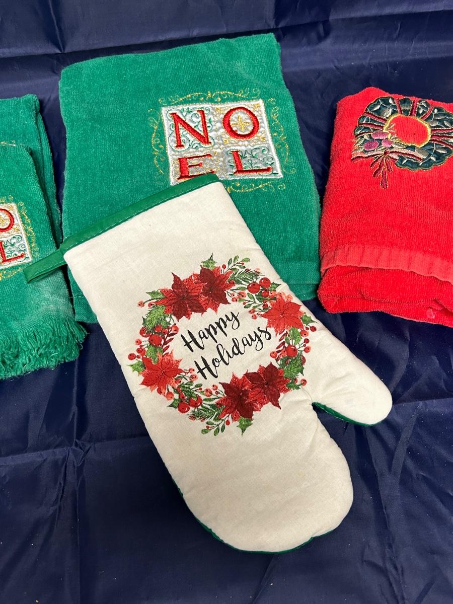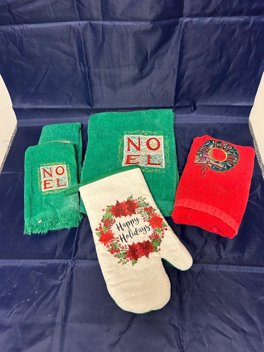 Christmas Holiday Noel & Wreath Towels and Oven Mitt. Previously used condition.