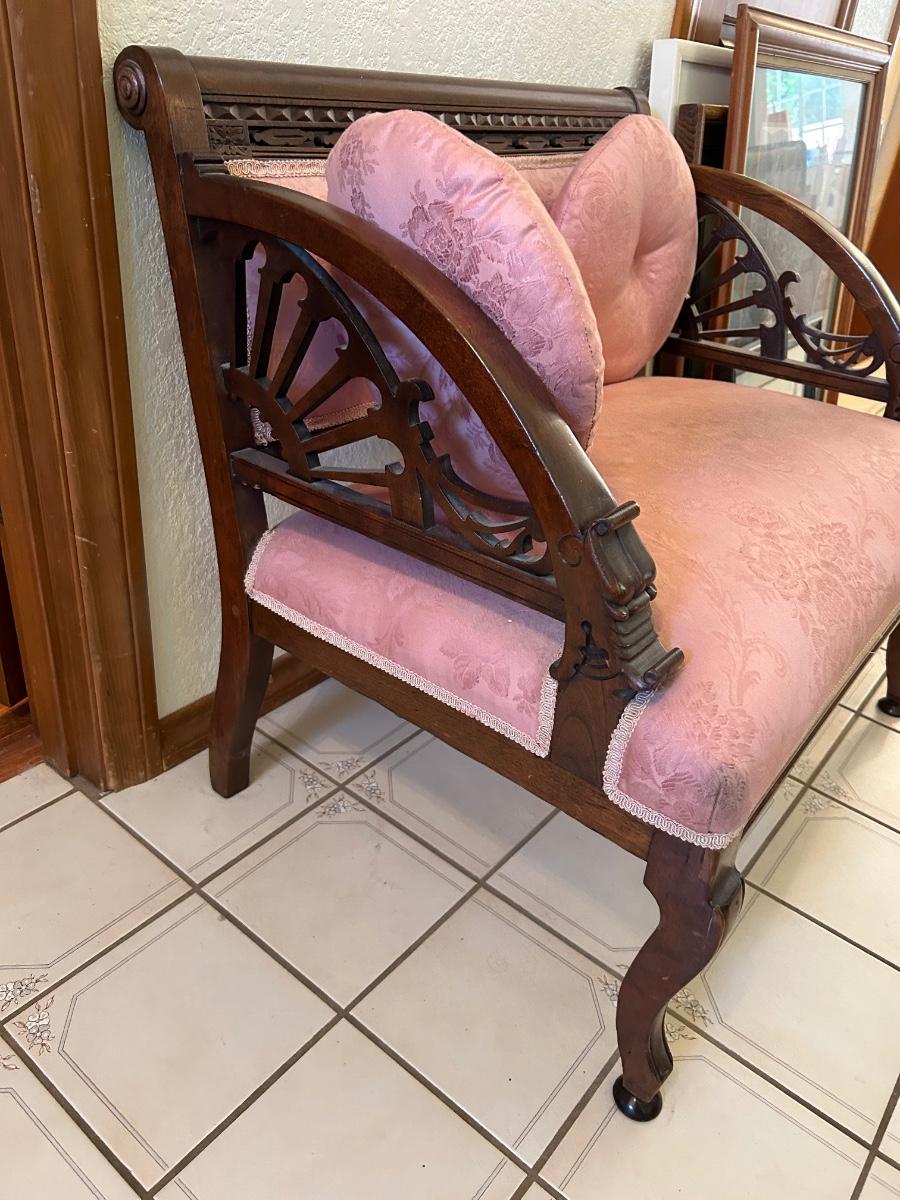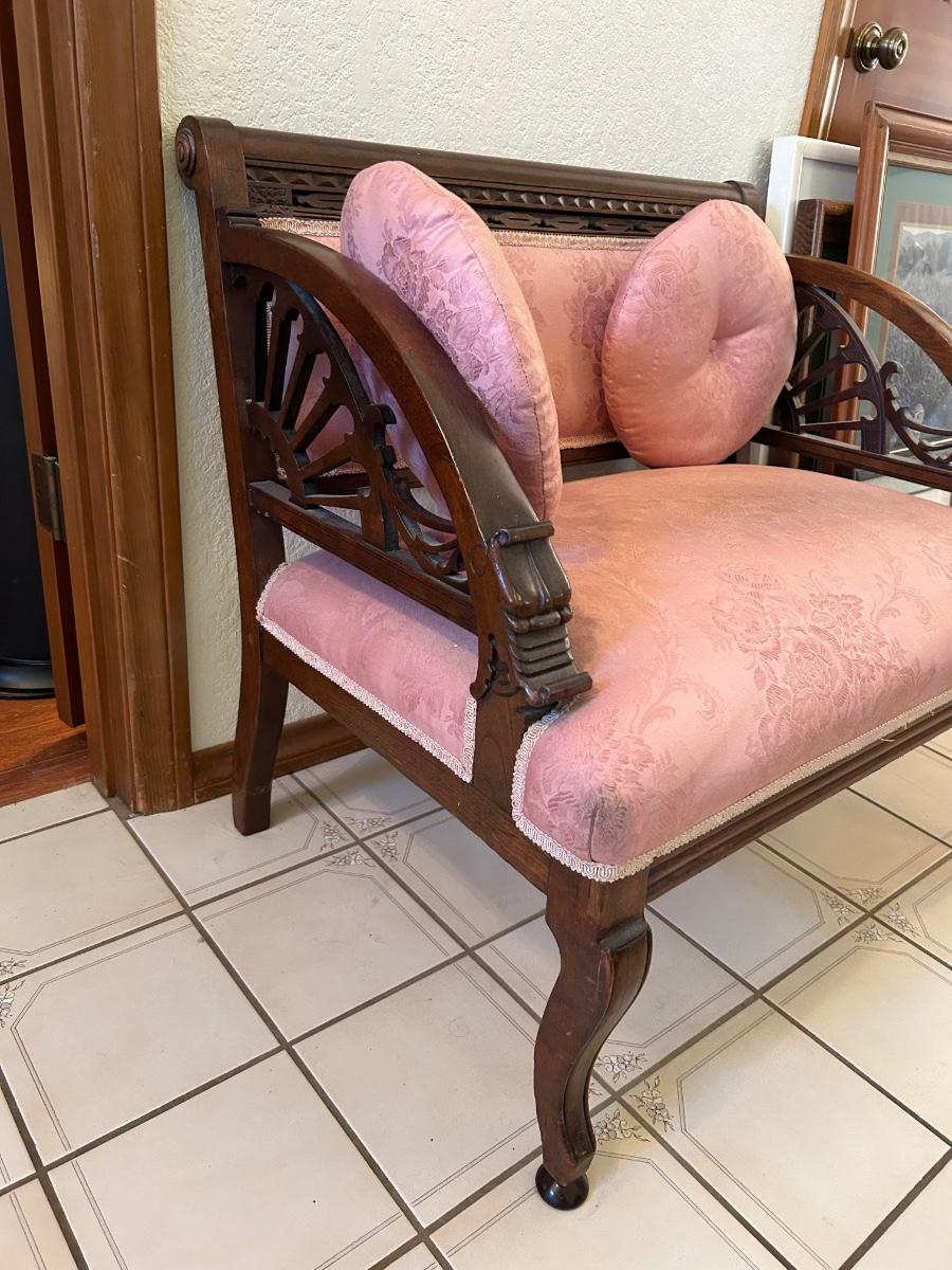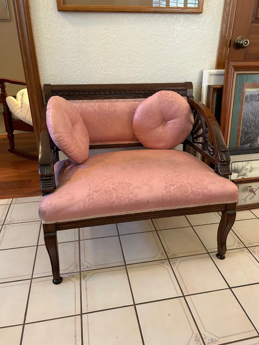Vintage Antique Victorian Pink Upholstery Wide Seat Chair Figural Arms