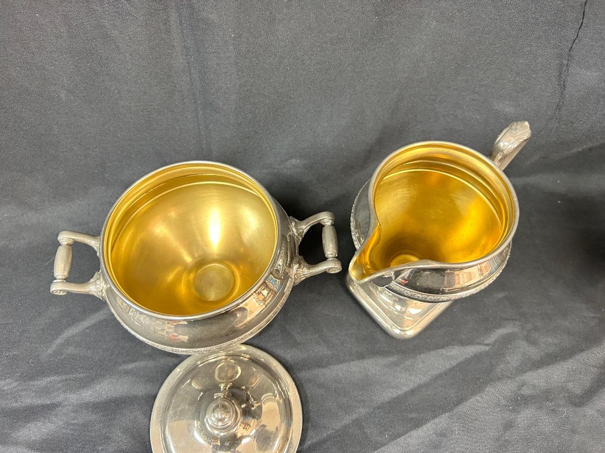 Vintage Manning Bowman Silver Plate Creamer and Sugar Bowl. In good vintage condition. Silver outer with gold tone inside.