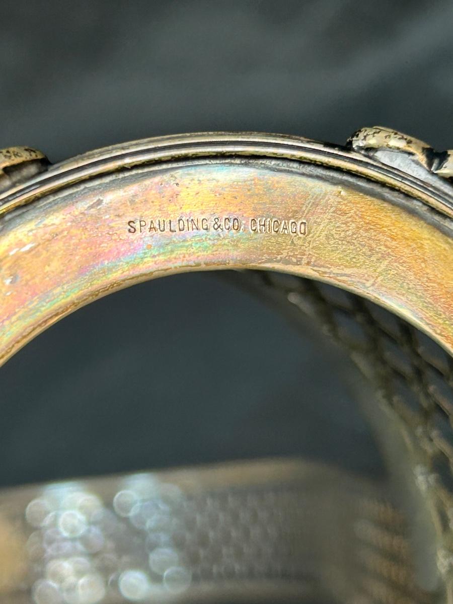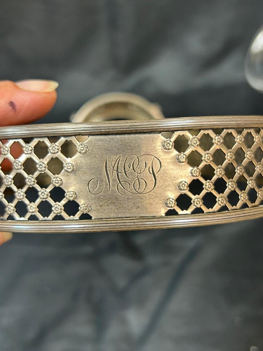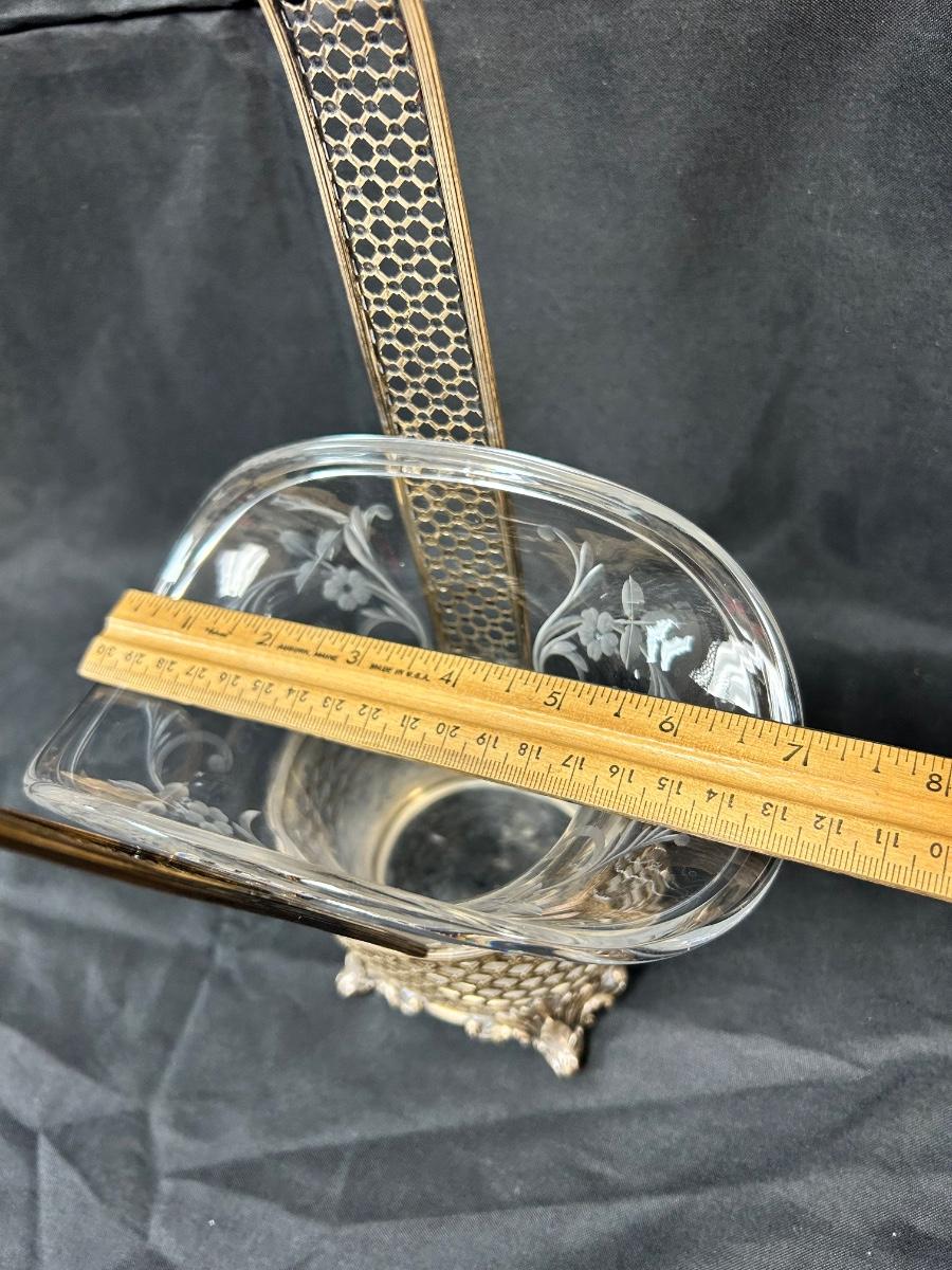 Vintage Spaulding & Co Sterling Silver Bridal Basket with Glass Insert. Beautiful sterling bridal basket. Monogrammed handle. Stamped Spaulding and sterling along the bottom. Glass basket piece does come out, beautifully flower etched design. Sterling piece without glass weighs 380g.