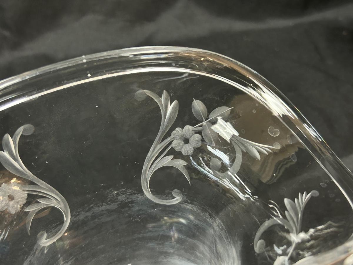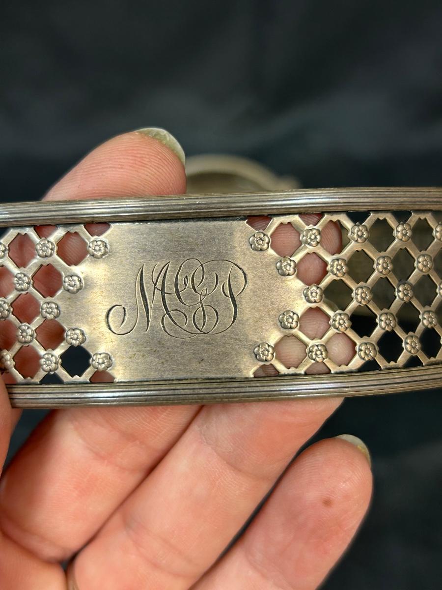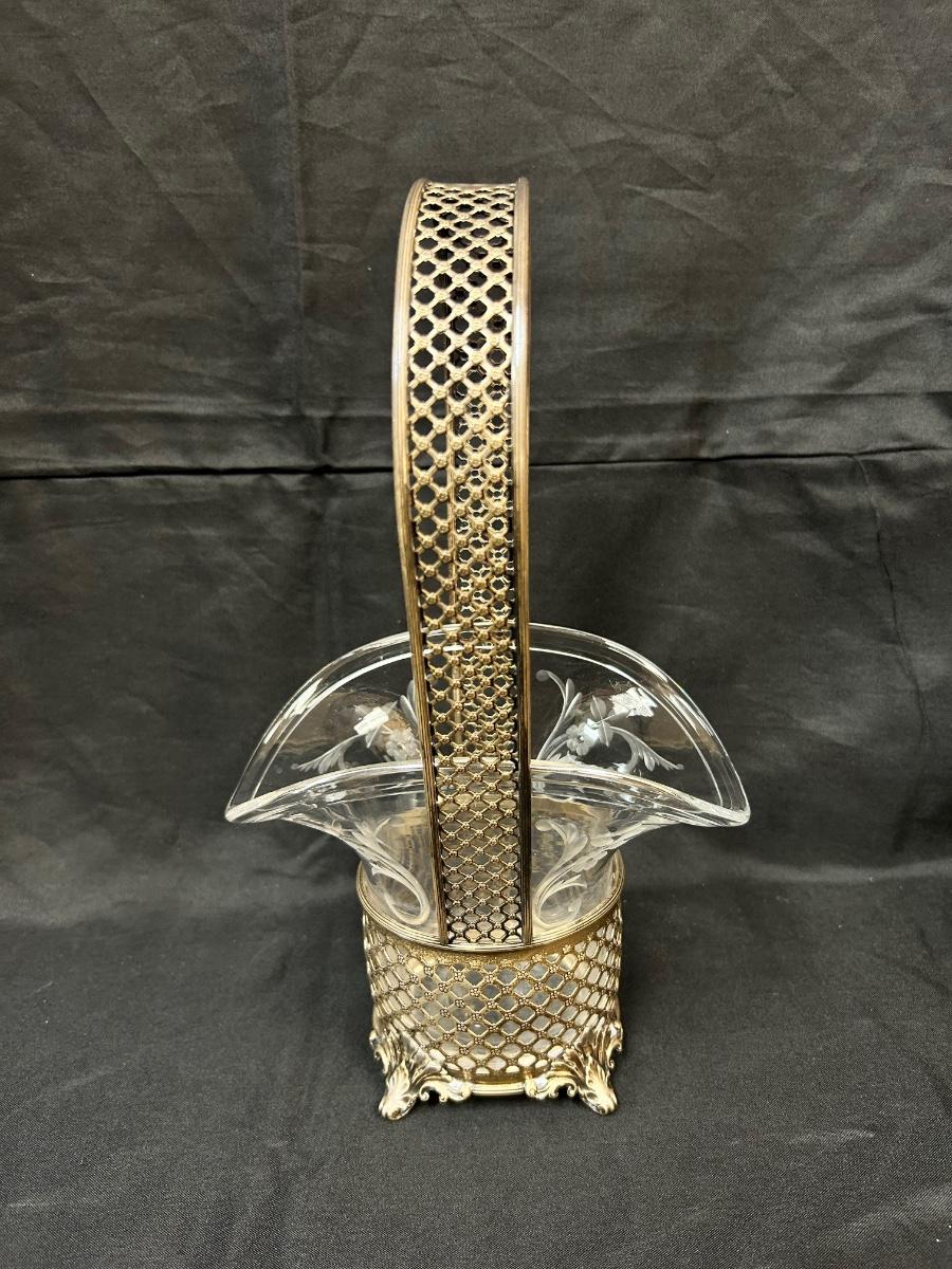 Vintage Spaulding & Co Sterling Silver Bridal Basket with Glass Insert. Beautiful sterling bridal basket. Monogrammed handle. Stamped Spaulding and sterling along the bottom. Glass basket piece does come out, beautifully flower etched design. Sterling piece without glass weighs 380g.