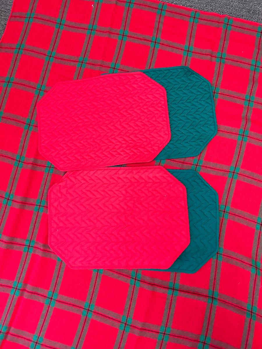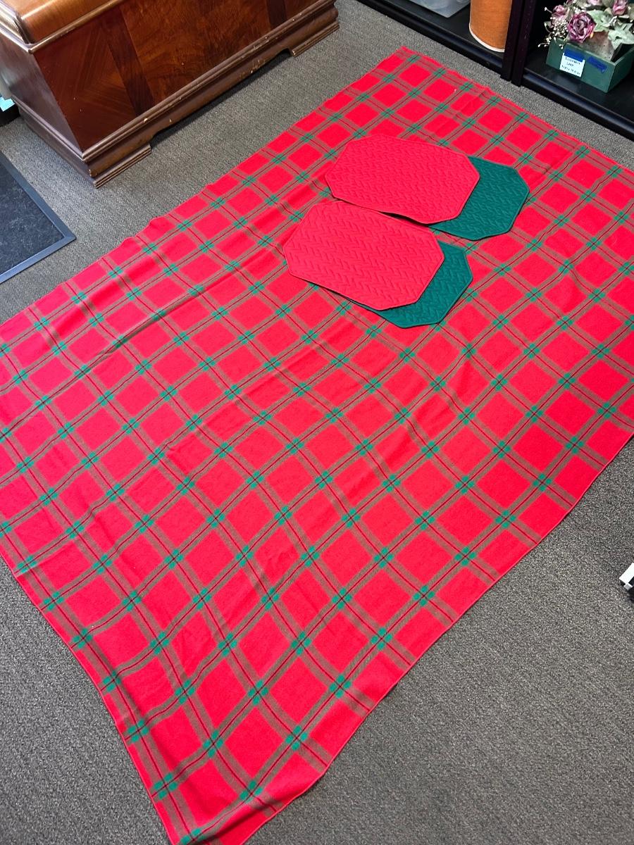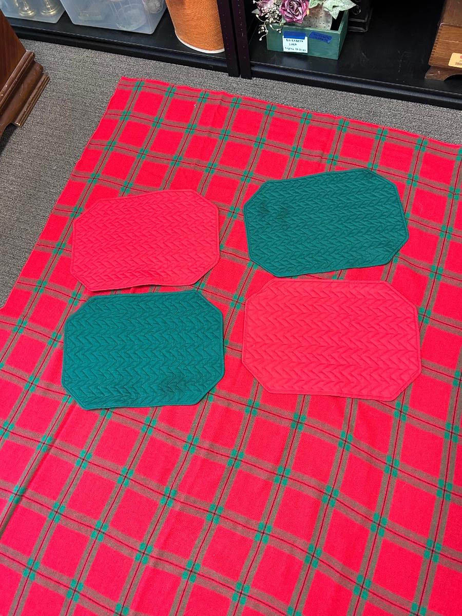 Red and Green Plaid Christmas Holiday Tablecloth and Four Placemats. Tablecloth in good condition. About 5'x6'. Placemats are in used condition. The camera picked up some spots on the green ones but they do not show up as much in person.