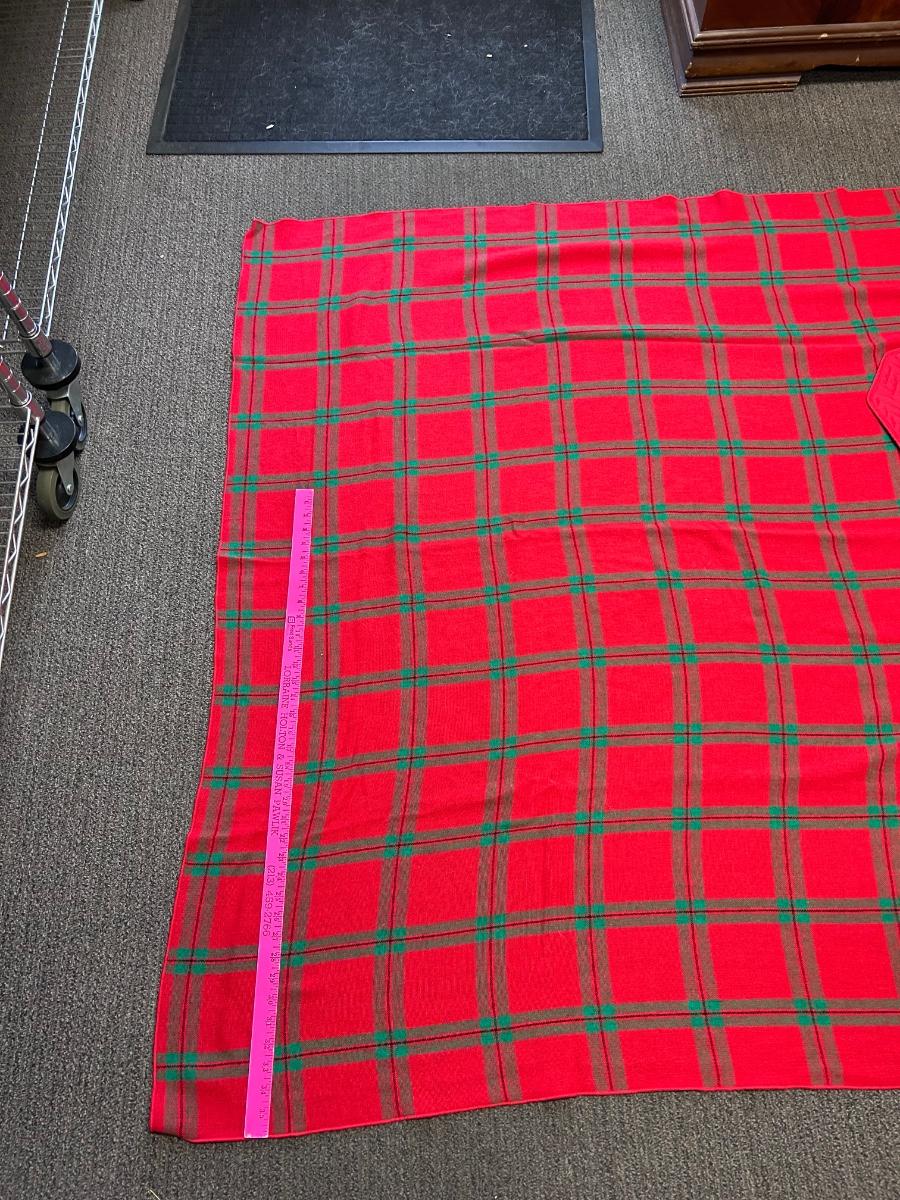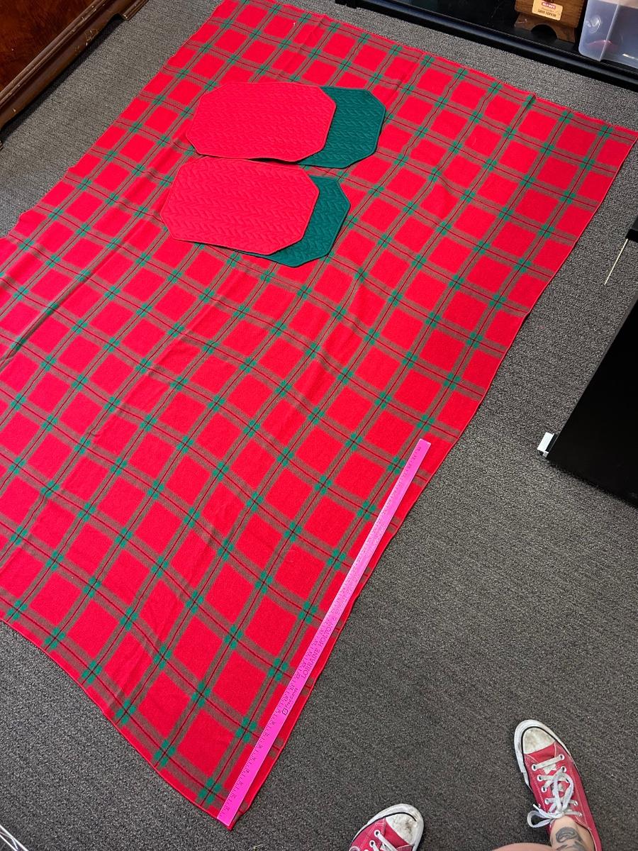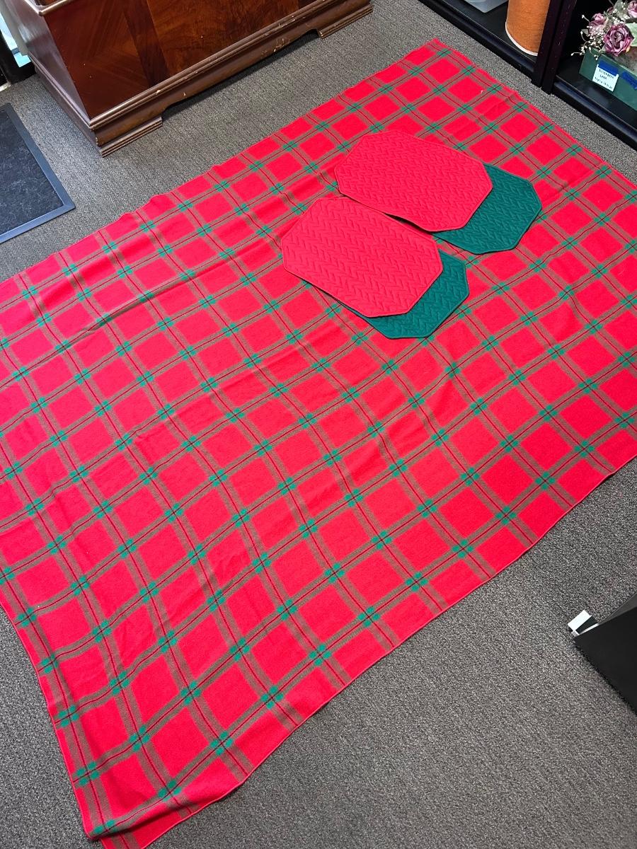 Red and Green Plaid Christmas Holiday Tablecloth and Four Placemats. Tablecloth in good condition. About 5'x6'. Placemats are in used condition. The camera picked up some spots on the green ones but they do not show up as much in person.
