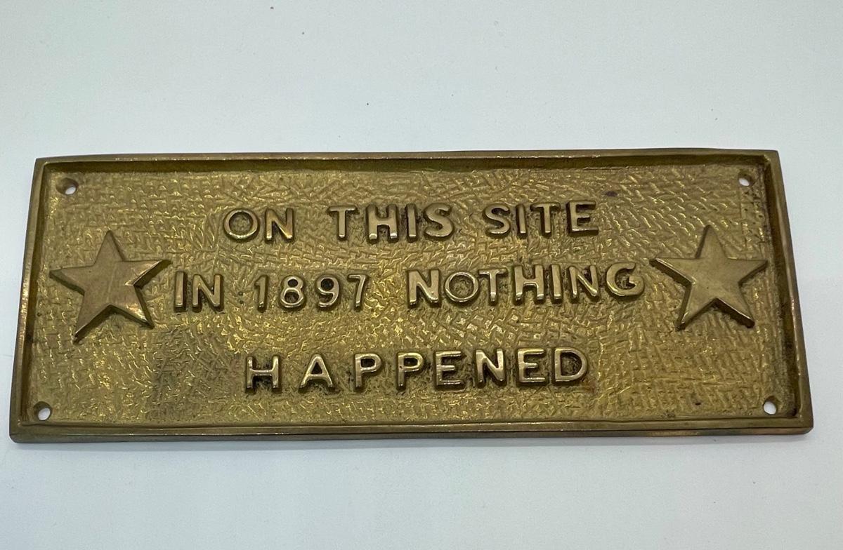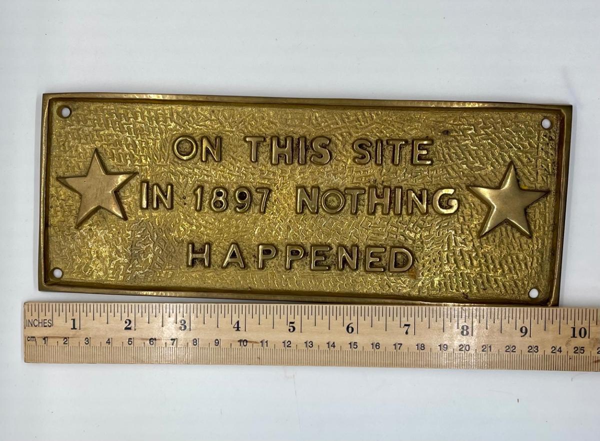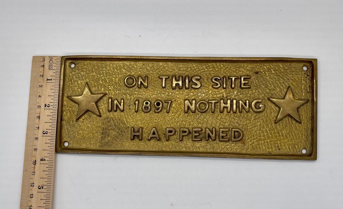 Vintage Solid Brass Sign Plaque ON THIS SITE IN 1897 NOTHING HAPPENED