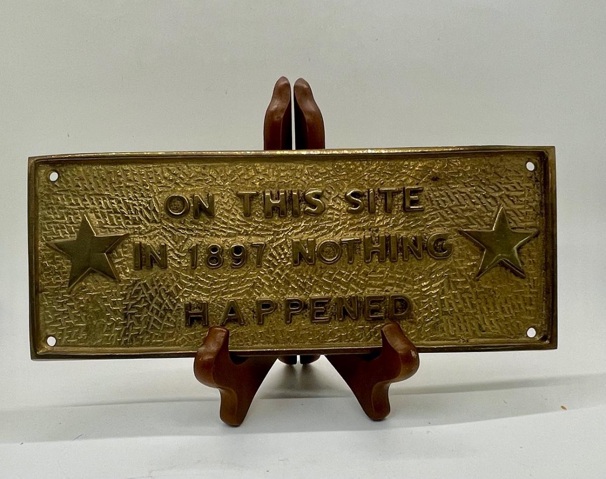 Brass Humorous On This Site Sign, spoofs real signs of famous signs. Reads "On this site in 1897, Nothing Happened".