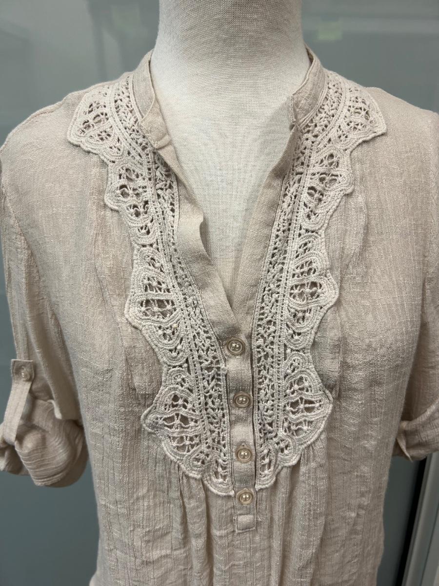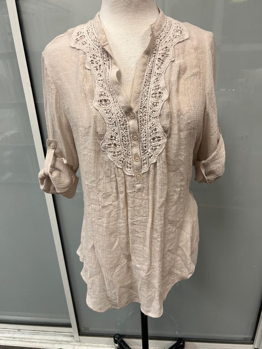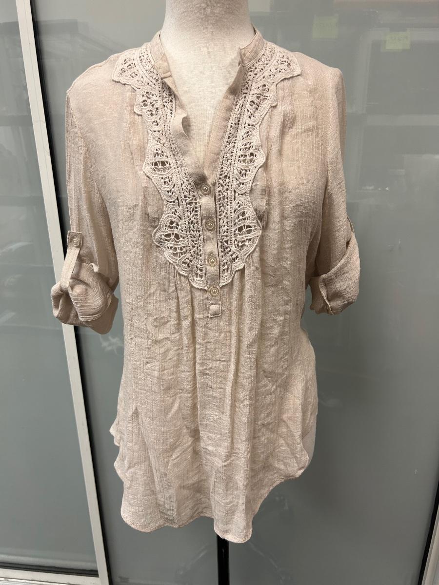Beige Lightweight Airy Lace Applique Blouse Spence Medium. In good condition. Sleeves can be worn rolled or unrolled.