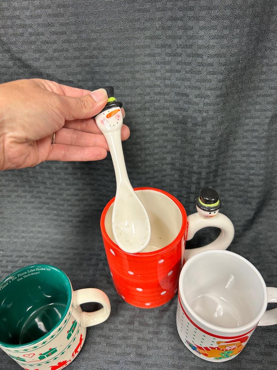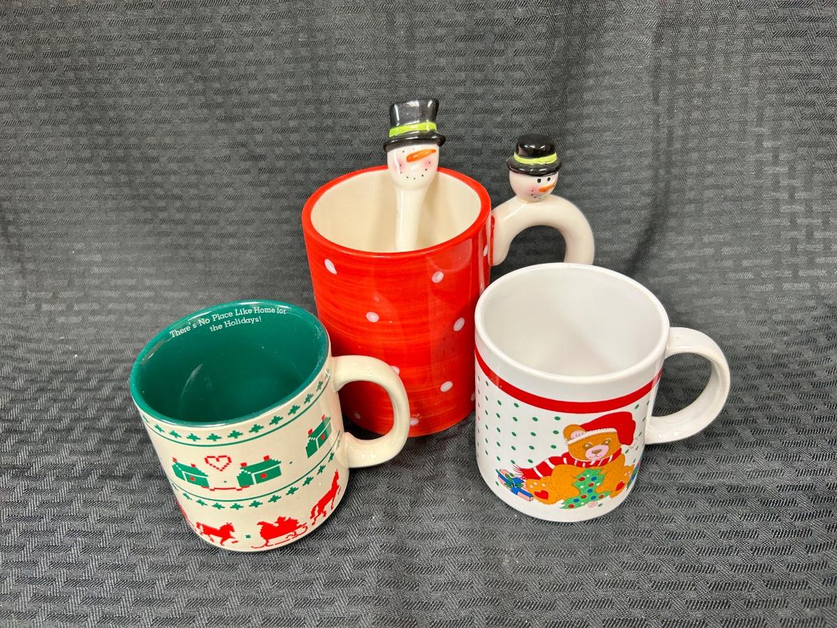 Lot of Three Novelty Christmas Holiday Coffee Cup Cocoa Mugs. In good used condition.