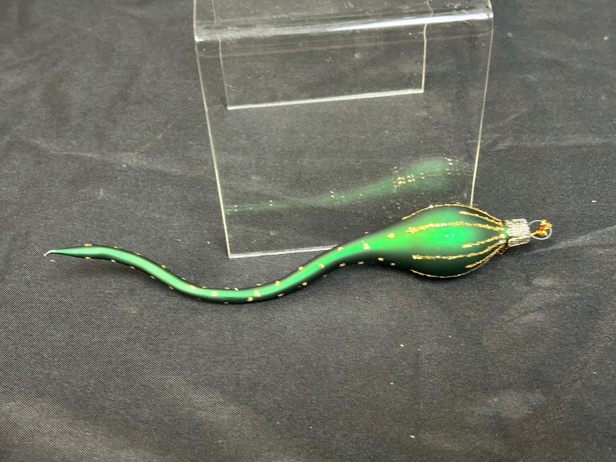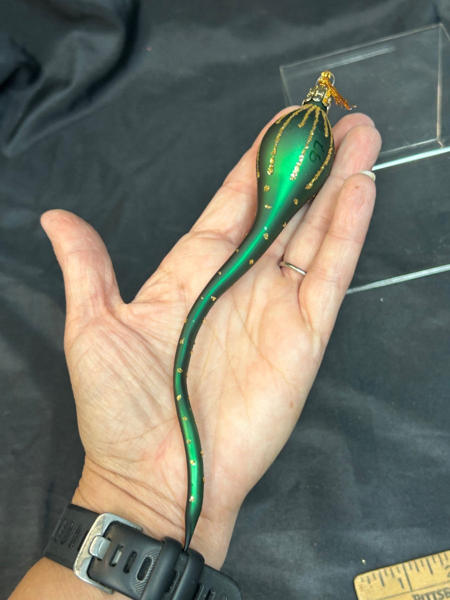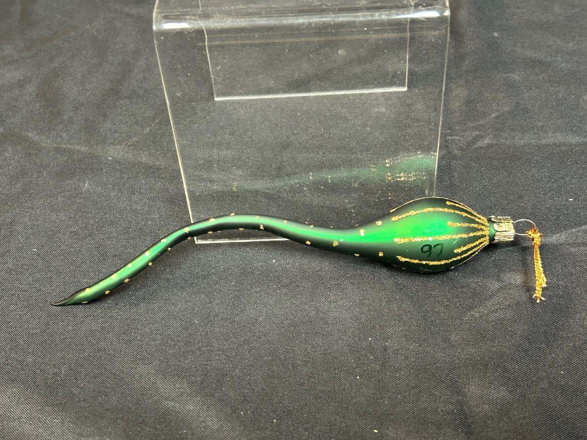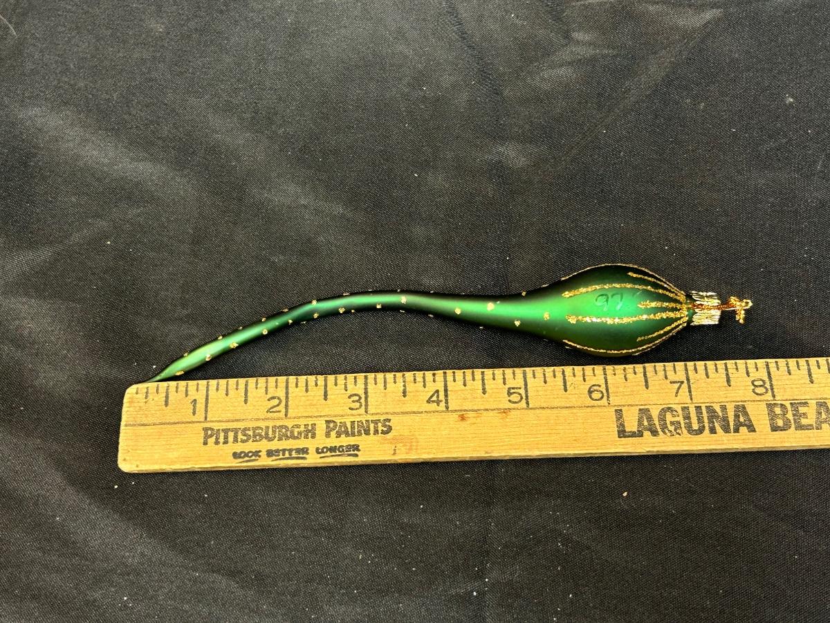 Green with Gold Glitter Blown Glass Stretched Christmas Tree Ornament. Previous owner got ornament in 1997, date was written on it. About 8" length.