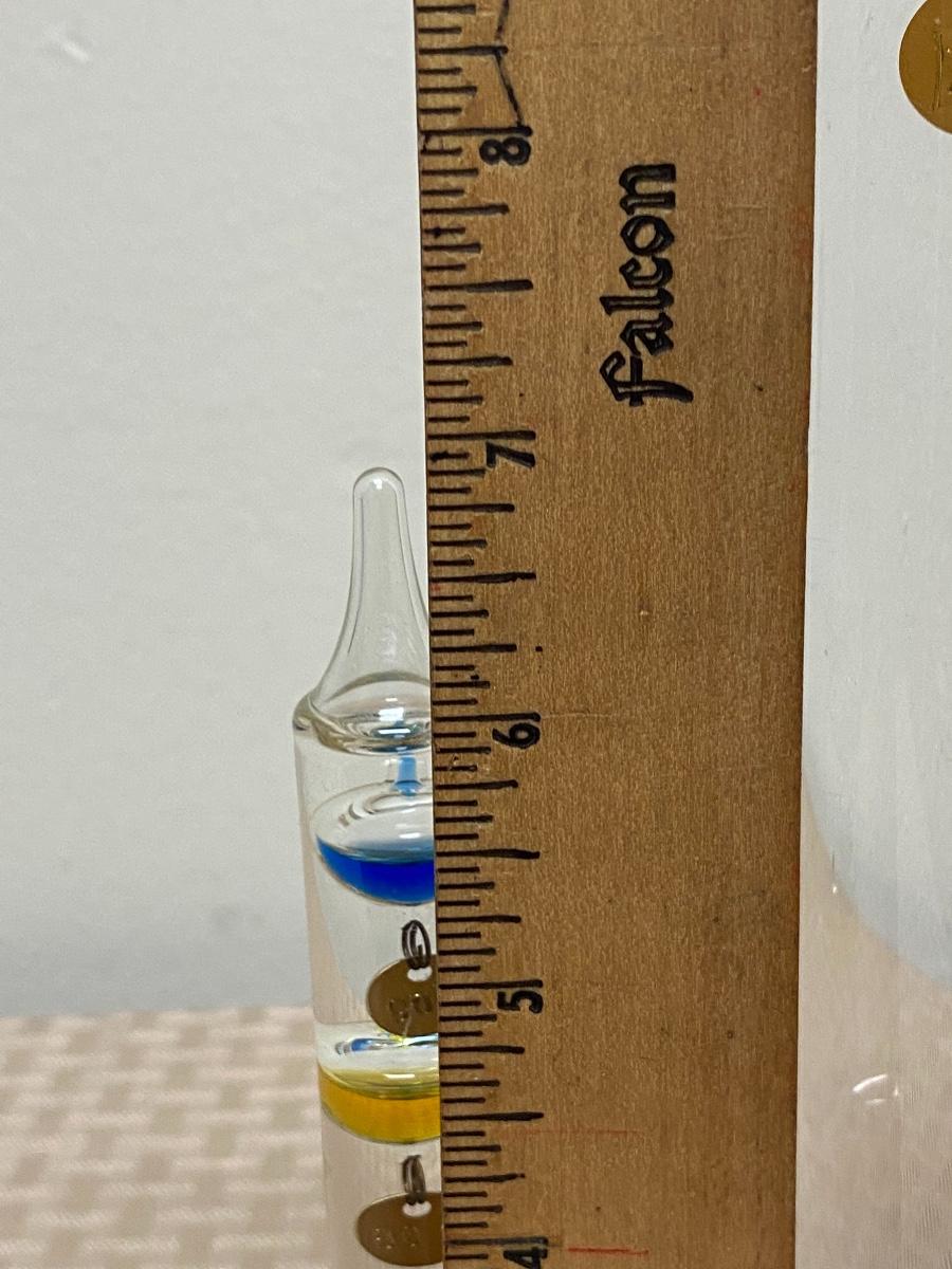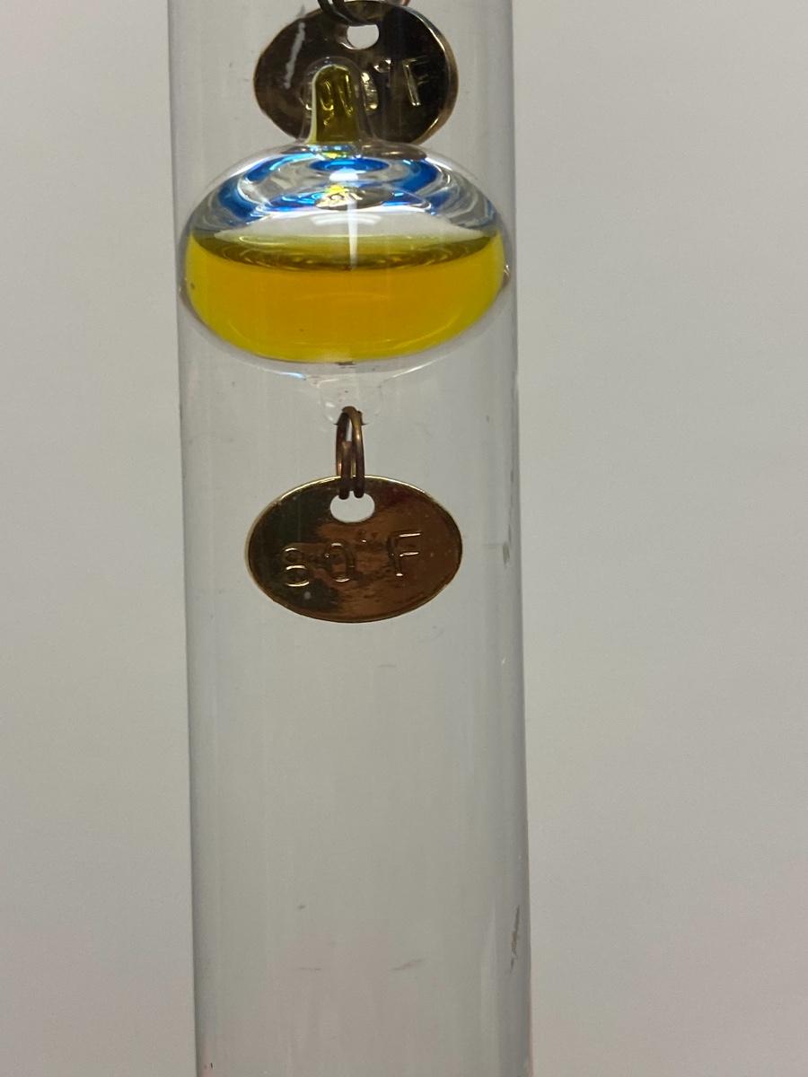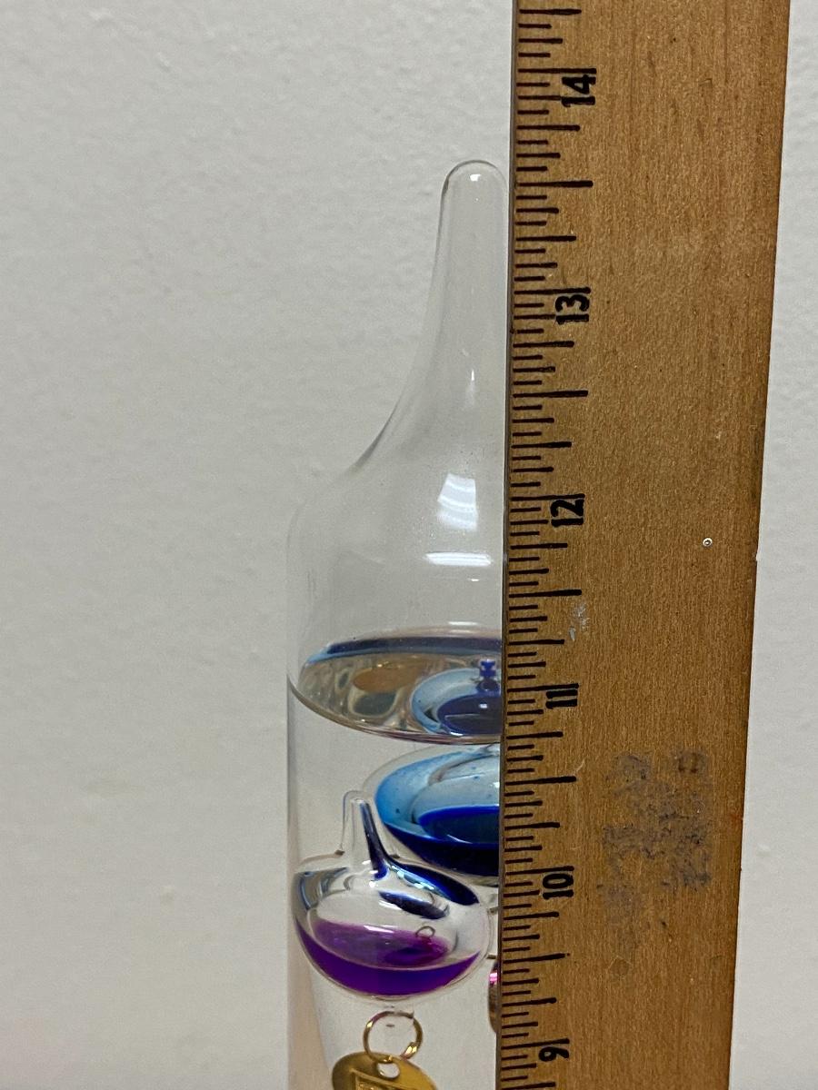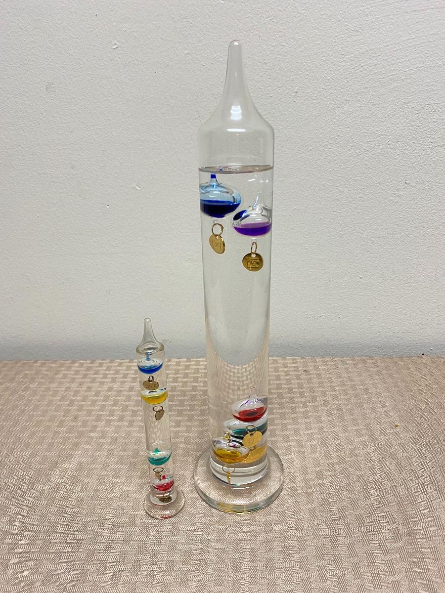 Pair of Bubble Glass Galileo Table Top Thermometers. Small one is 7" size, has Fahrenheit and Celsius reading on tag. Large one is about 13.5" and only had Fahrenheit reading on tag.