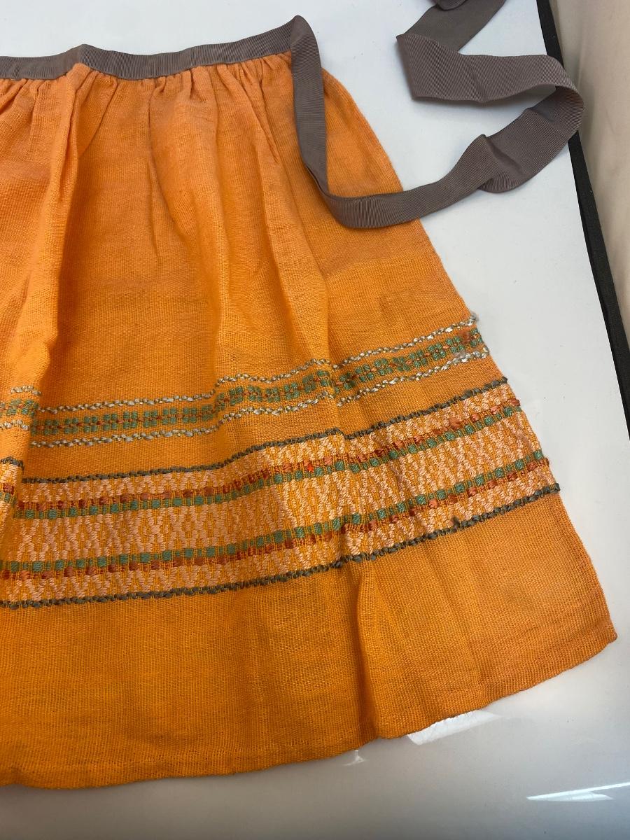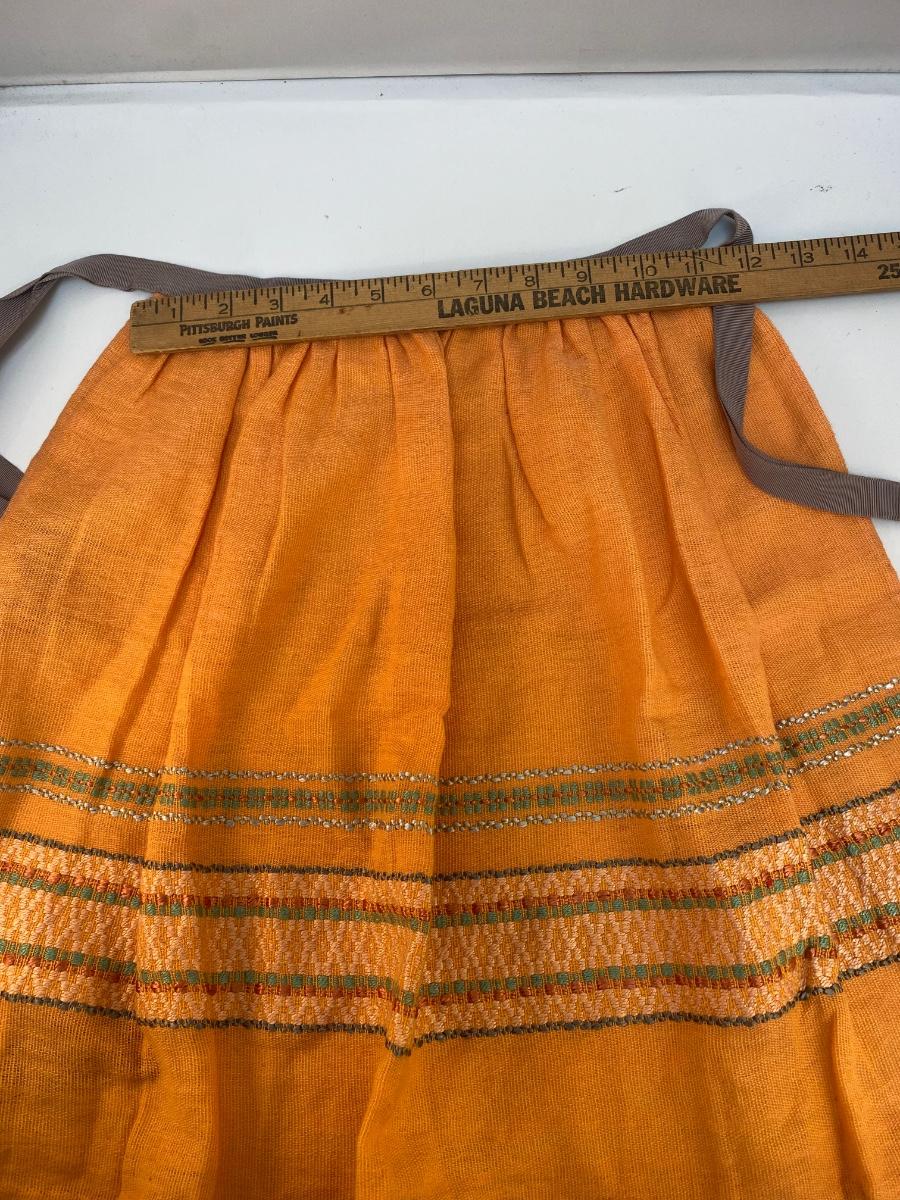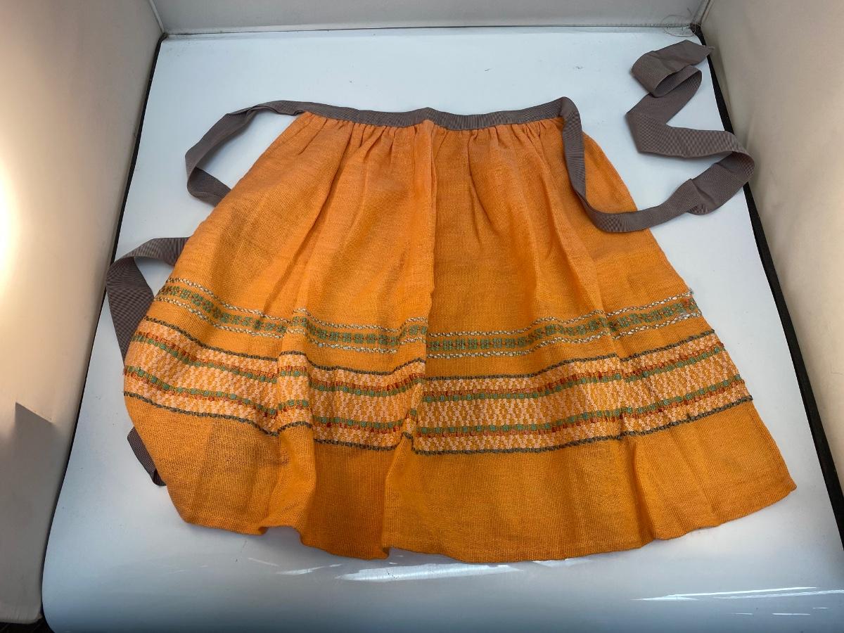 Vintage Orange Half Apron with Colorful Stitched Design. In good condition. No pockets.