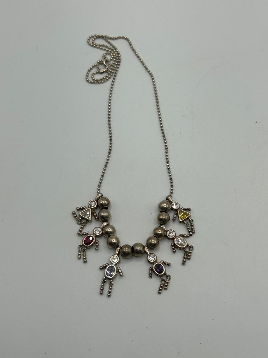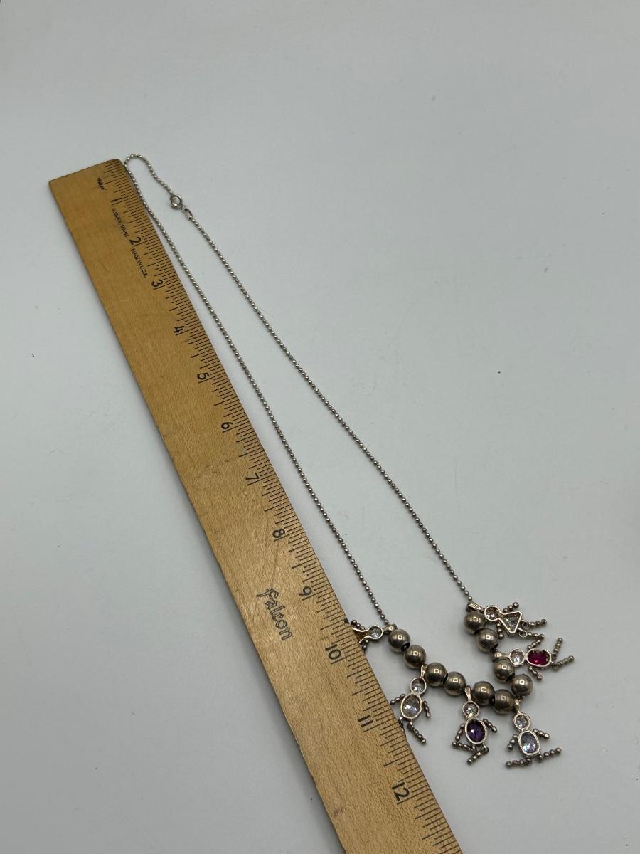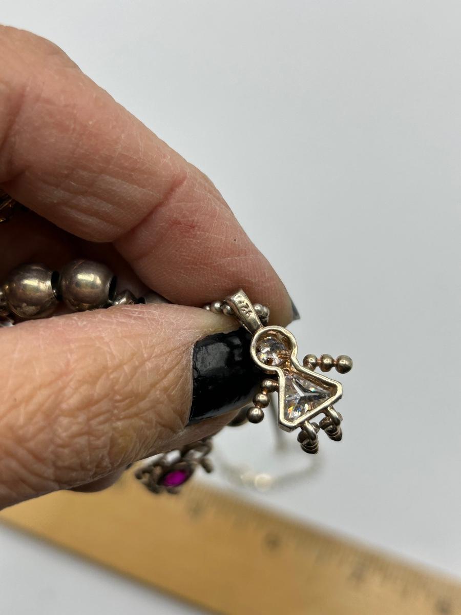 Sterling Silver Mother's Grandmother's Birthstone Charm Necklace. Has 6 boy/girl charms with gemstone bodies. Some pieces are marked sterling. Great for repurposing.