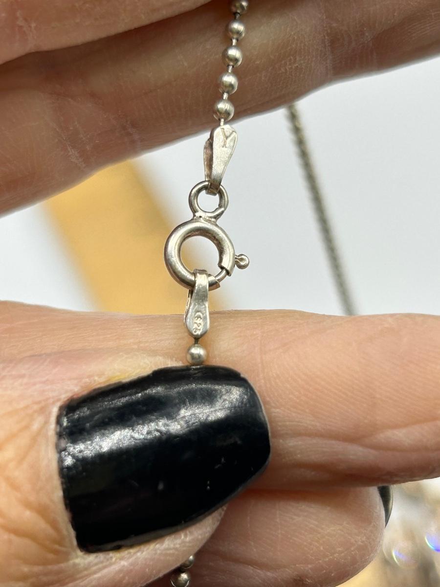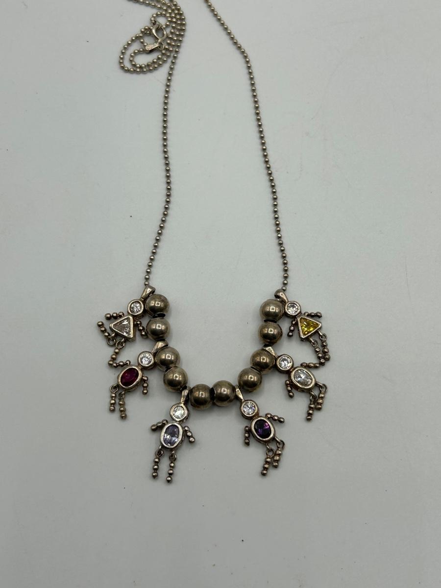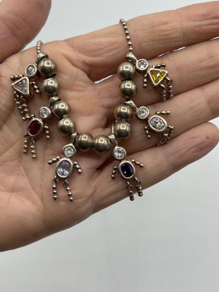 Sterling Silver Mother's Grandmother's Birthstone Charm Necklace. Has 6 boy/girl charms with gemstone bodies. Some pieces are marked sterling. Great for repurposing.