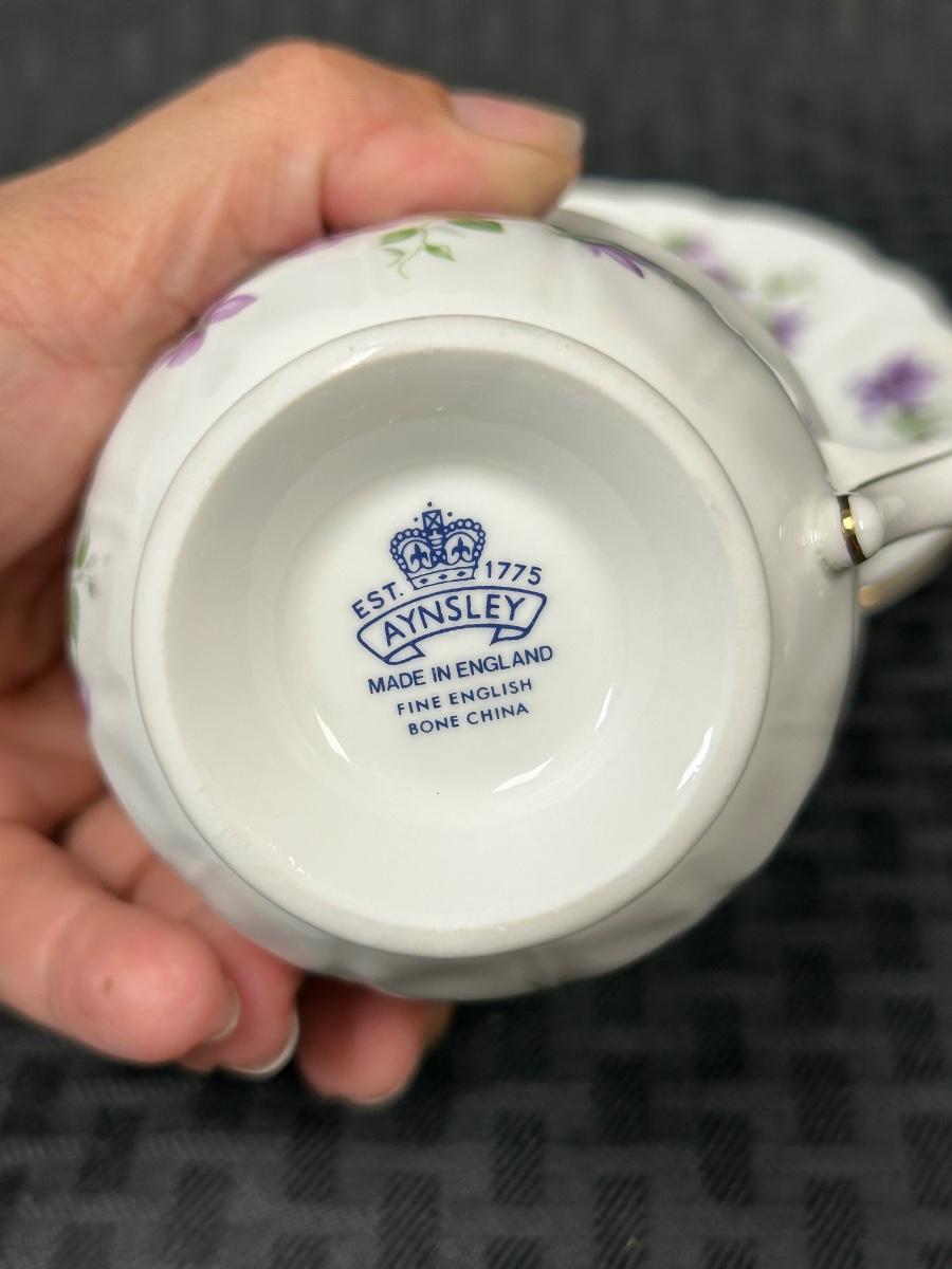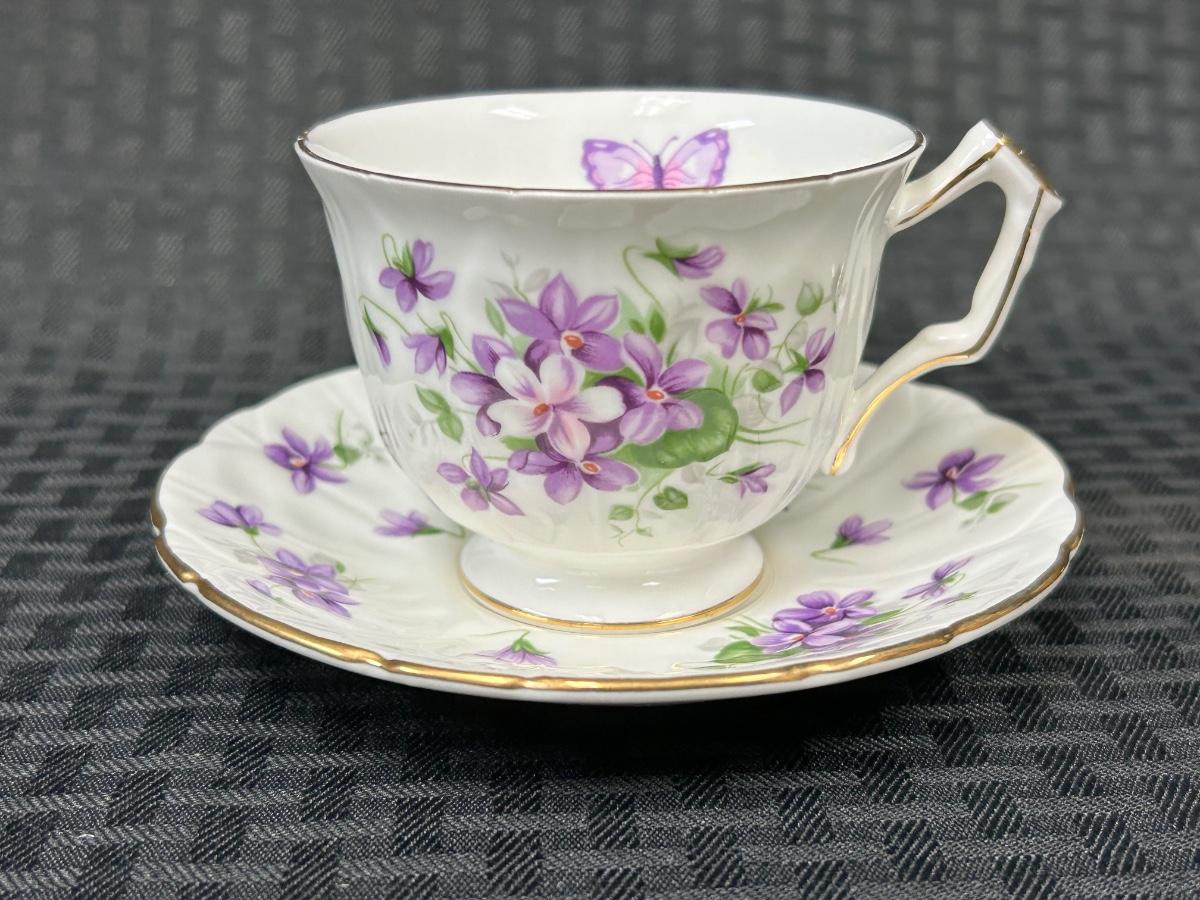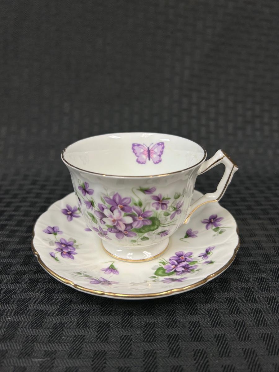 Vintage Aynsley Bone China Purple Floral & Butterfly Teacup and Saucer. In good vintage condition. Cup does have some faint staining inside.