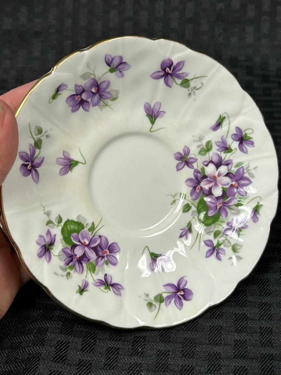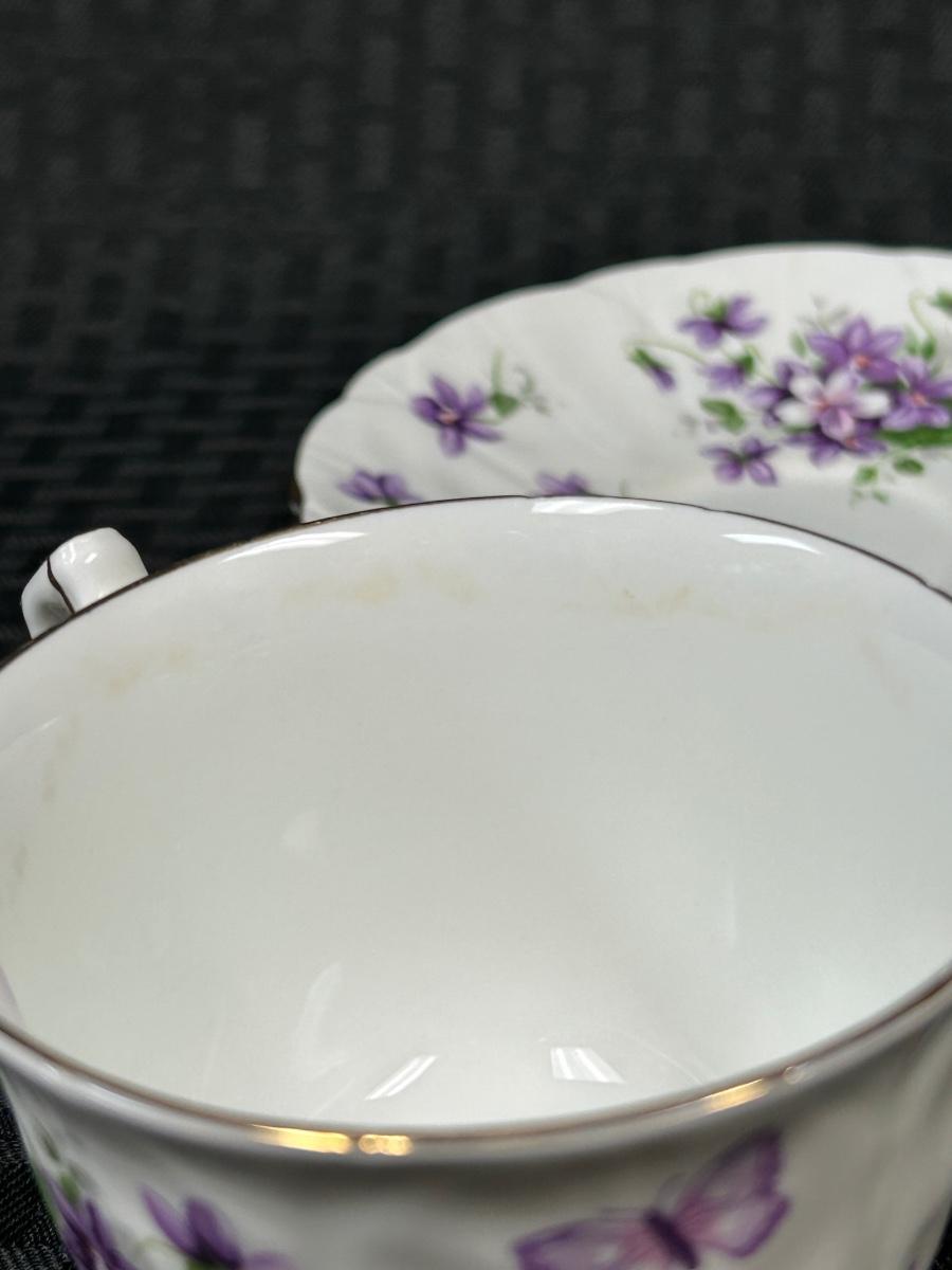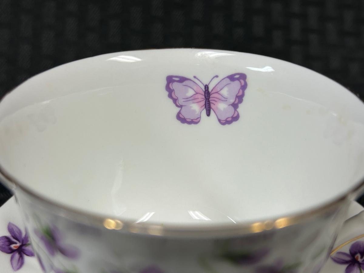 Vintage Aynsley Bone China Purple Floral & Butterfly Teacup and Saucer. In good vintage condition. Cup does have some faint staining inside.