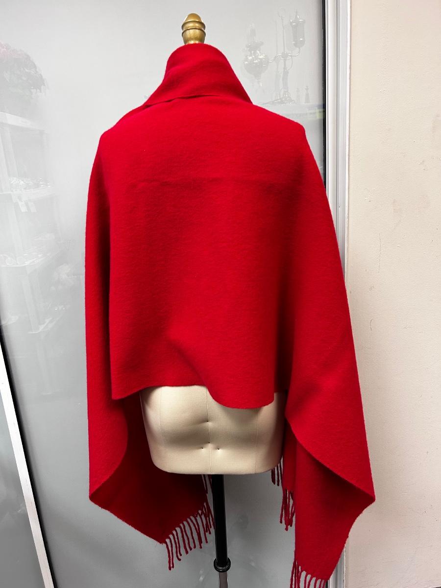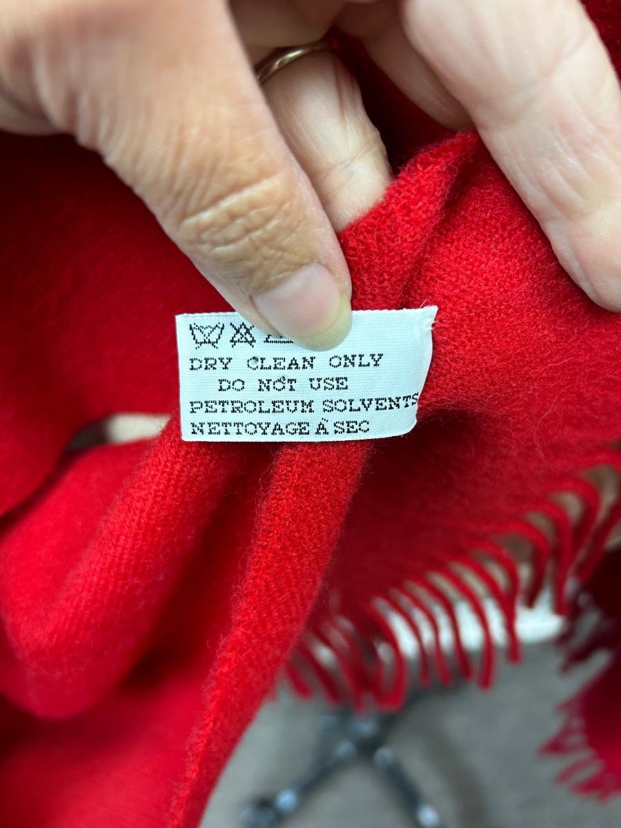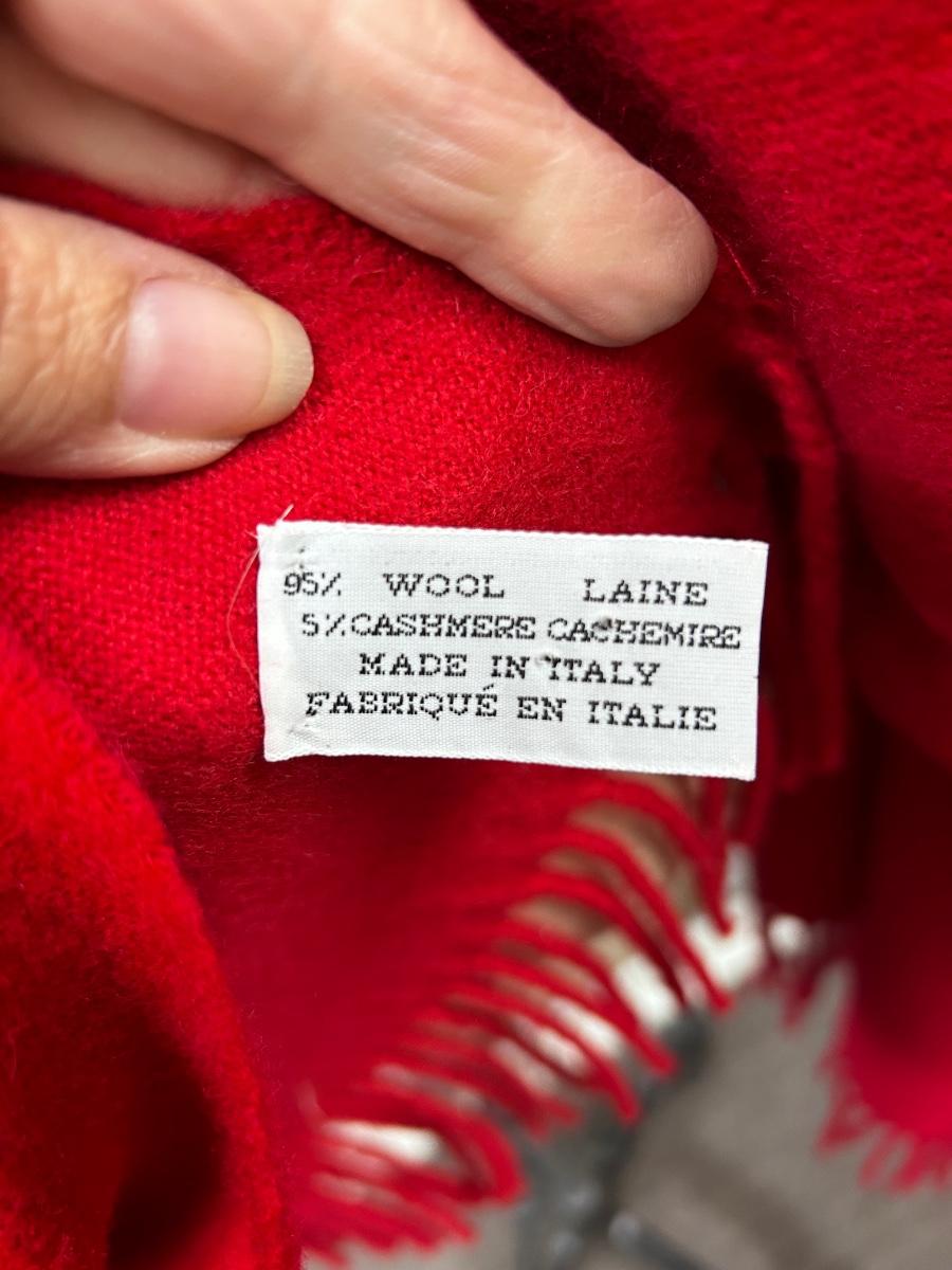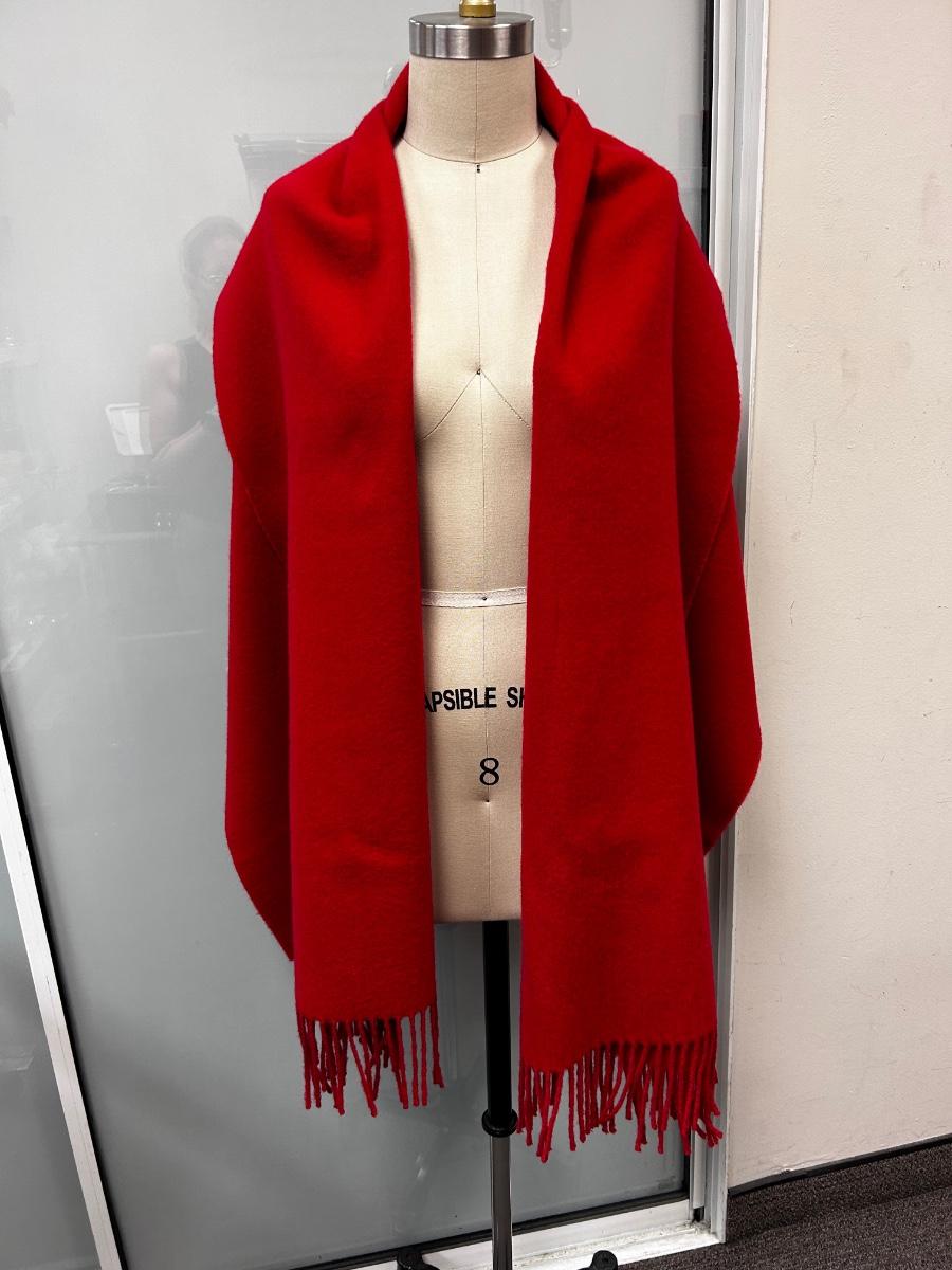 Large Wool Cashmere Blend Scarf Shoulder Wrap Red Fringed Edge. In good condition. About 6' length and 24" wide.