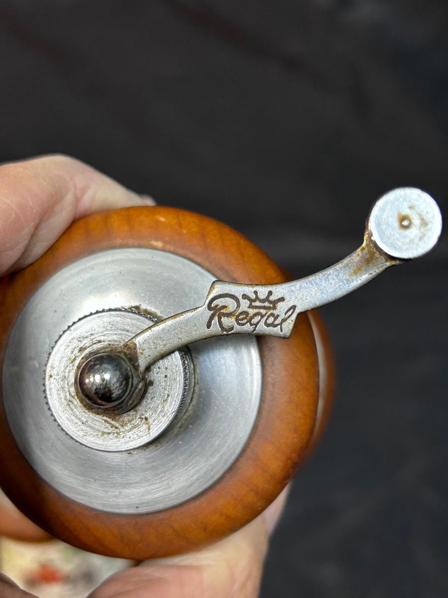 Vintage Wood and Ceramic Salt Shaker & Pepper Grinder Old Time Automobile Pattern. In good used condition, need a light cleaning.