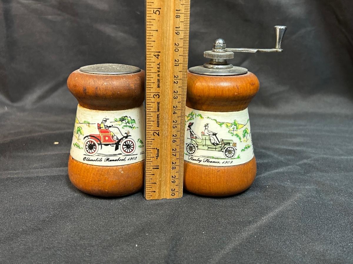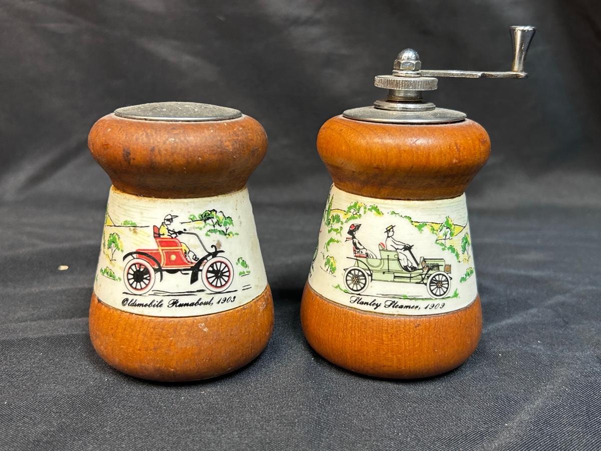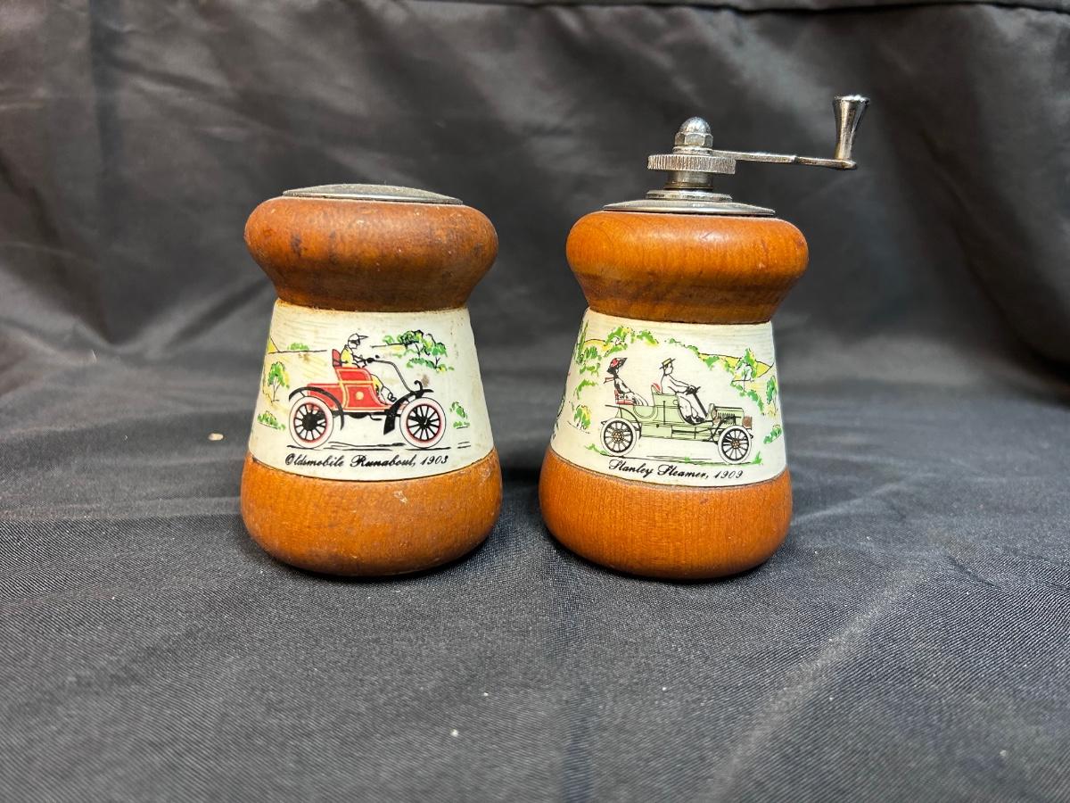 Vintage Wood and Ceramic Salt Shaker & Pepper Grinder Old Time Automobile Pattern