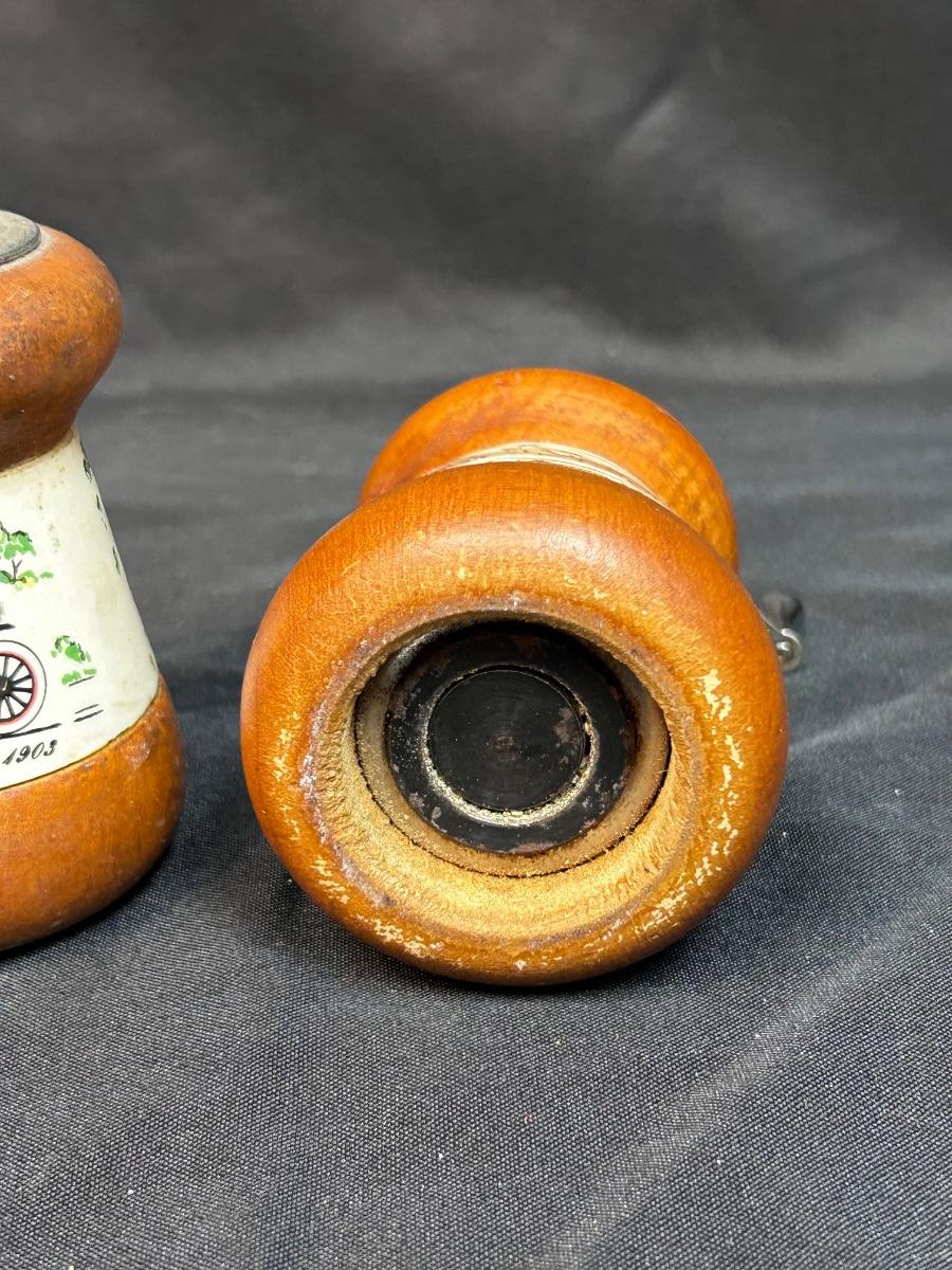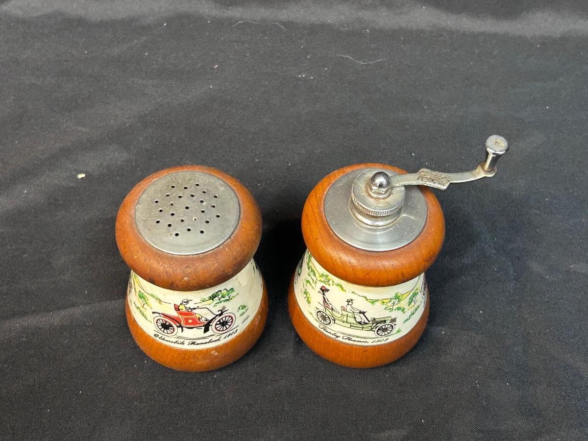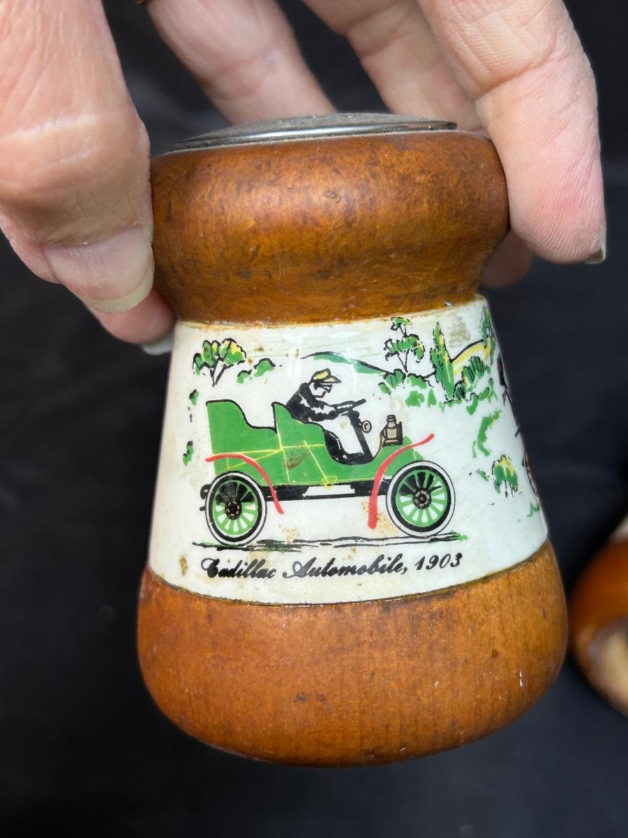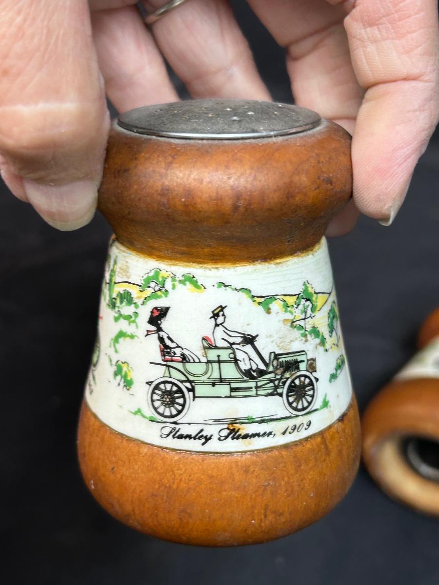 Vintage Wood and Ceramic Salt Shaker & Pepper Grinder Old Time Automobile Pattern