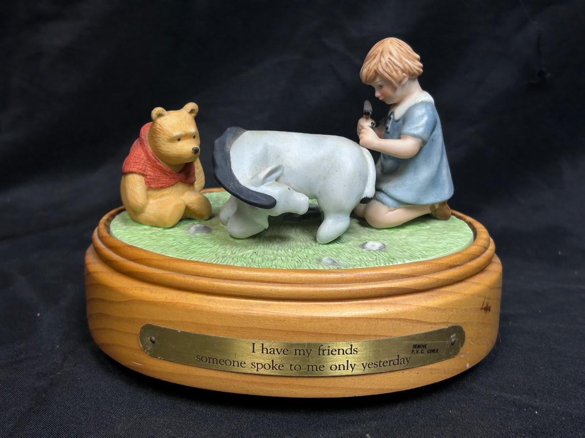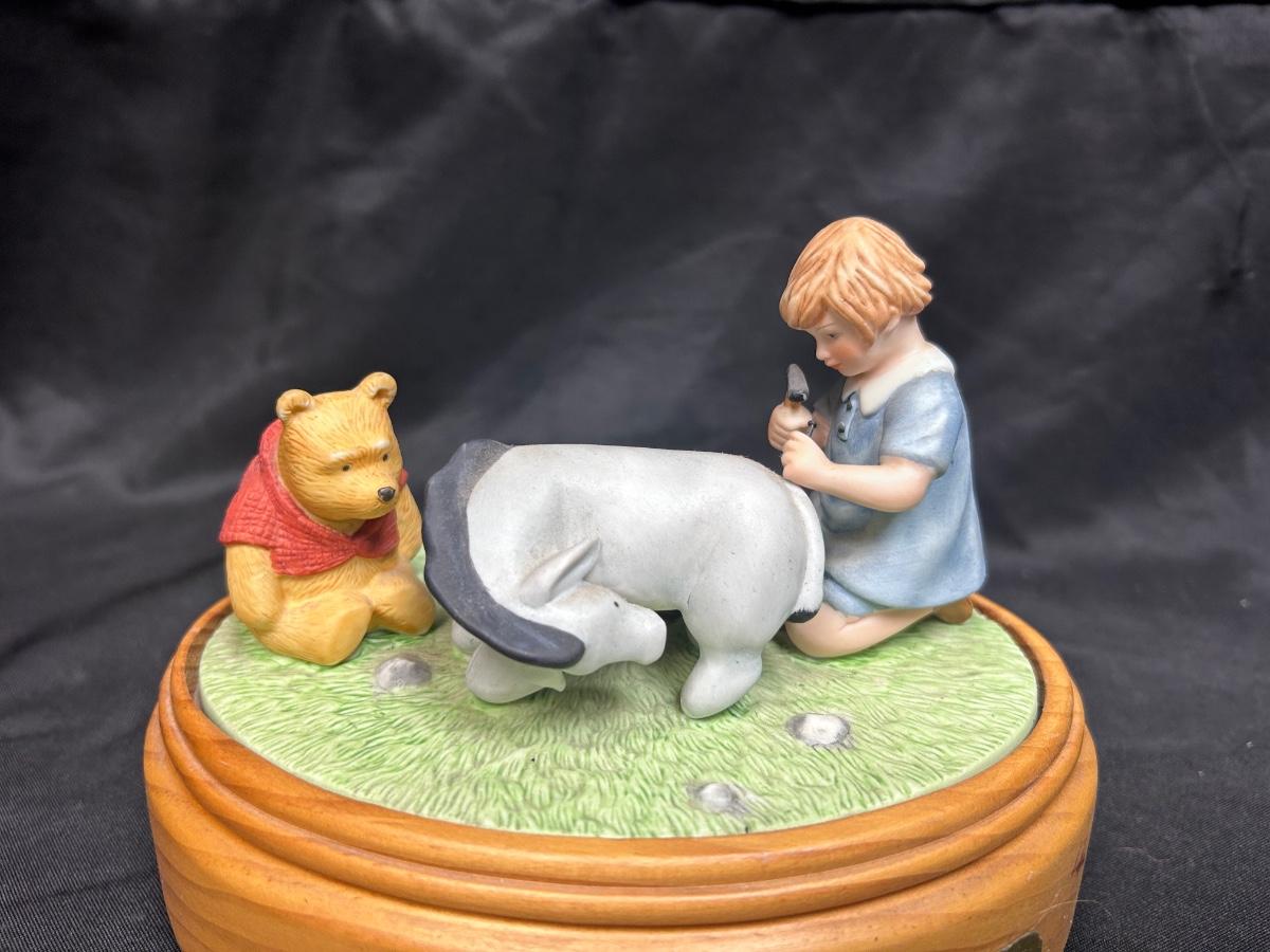 Winnie the Pooh Music Box Porcelain on Wood Base. In good condition. Features Winnie the pooh, Eeyore, and Christopher Robin. Music box plays but unsure of song.