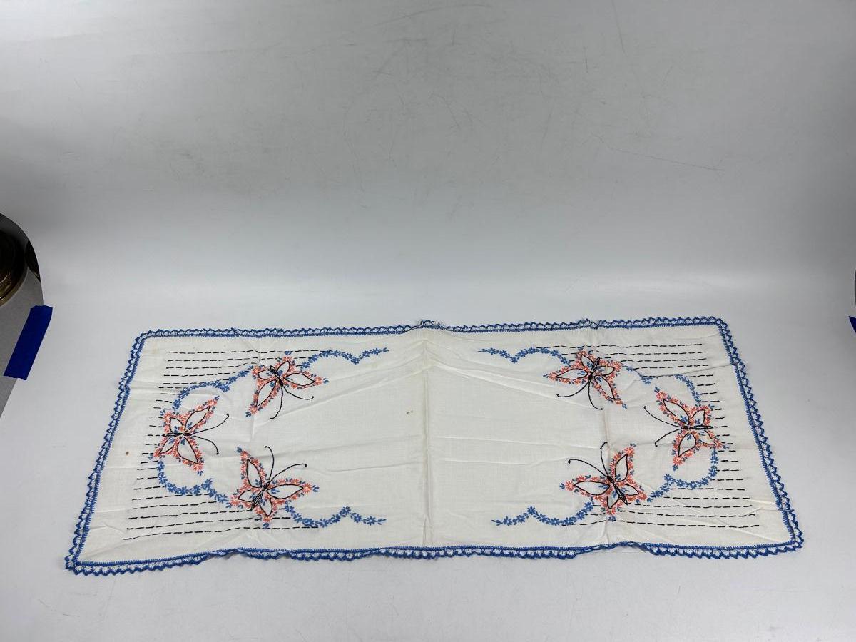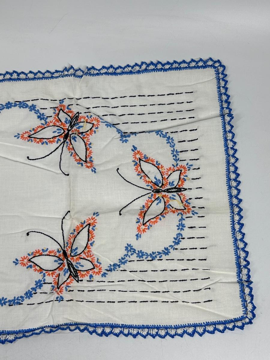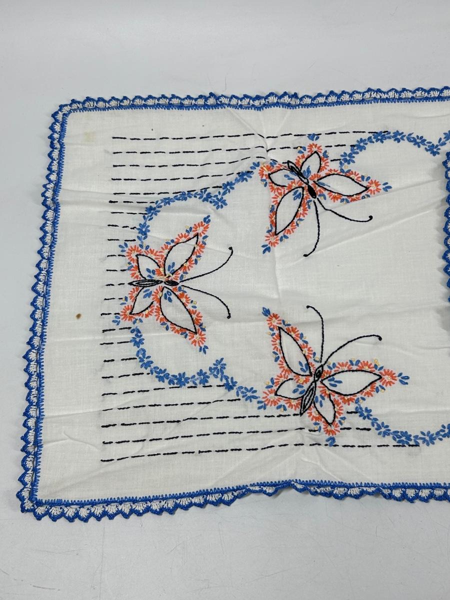 Vintage Blue Edge Embroidered Butterfly Table Runner Doily Set. In vintage condition. Some light discoloration a tiny spot near edge.