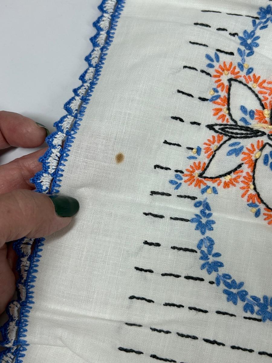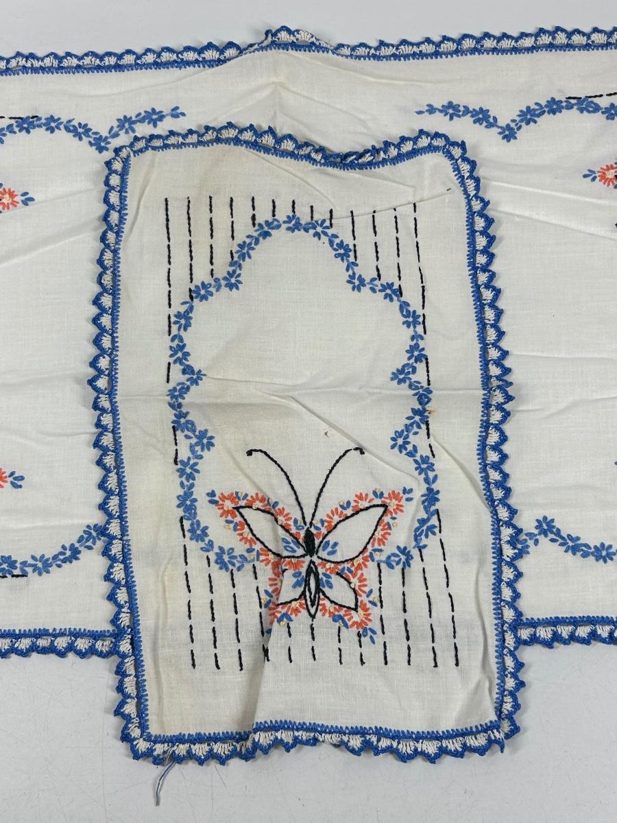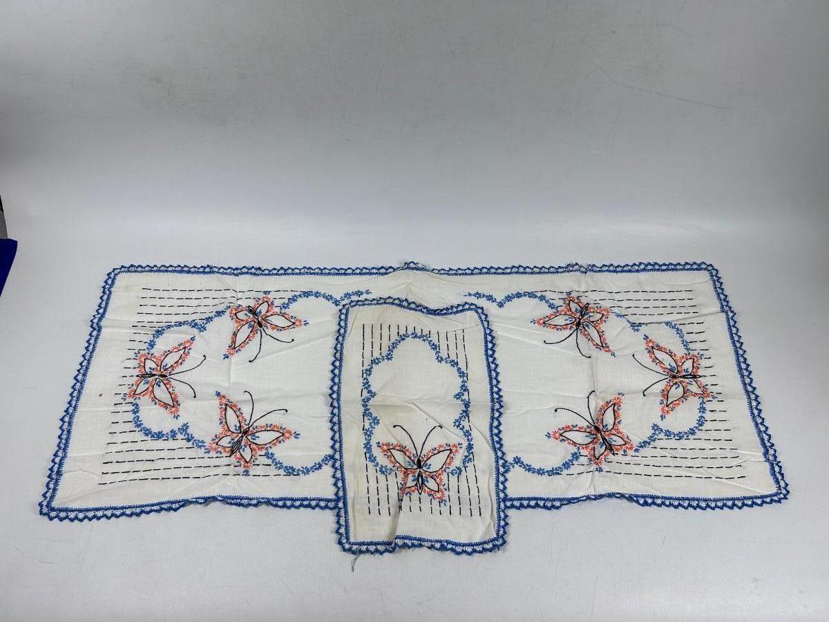 Vintage Blue Edge Embroidered Butterfly Table Runner Doily Set. In vintage condition. Some light discoloration a tiny spot near edge.