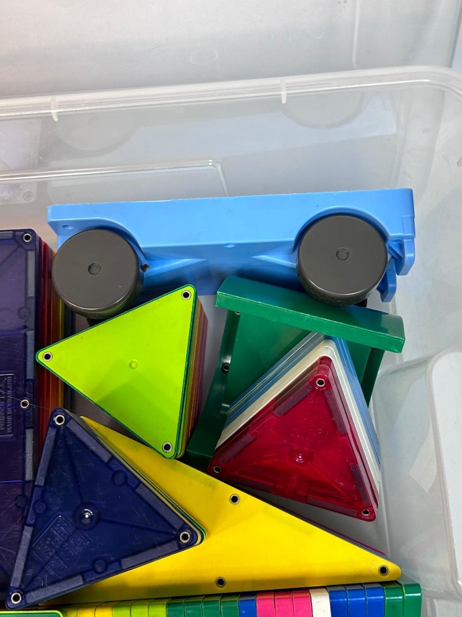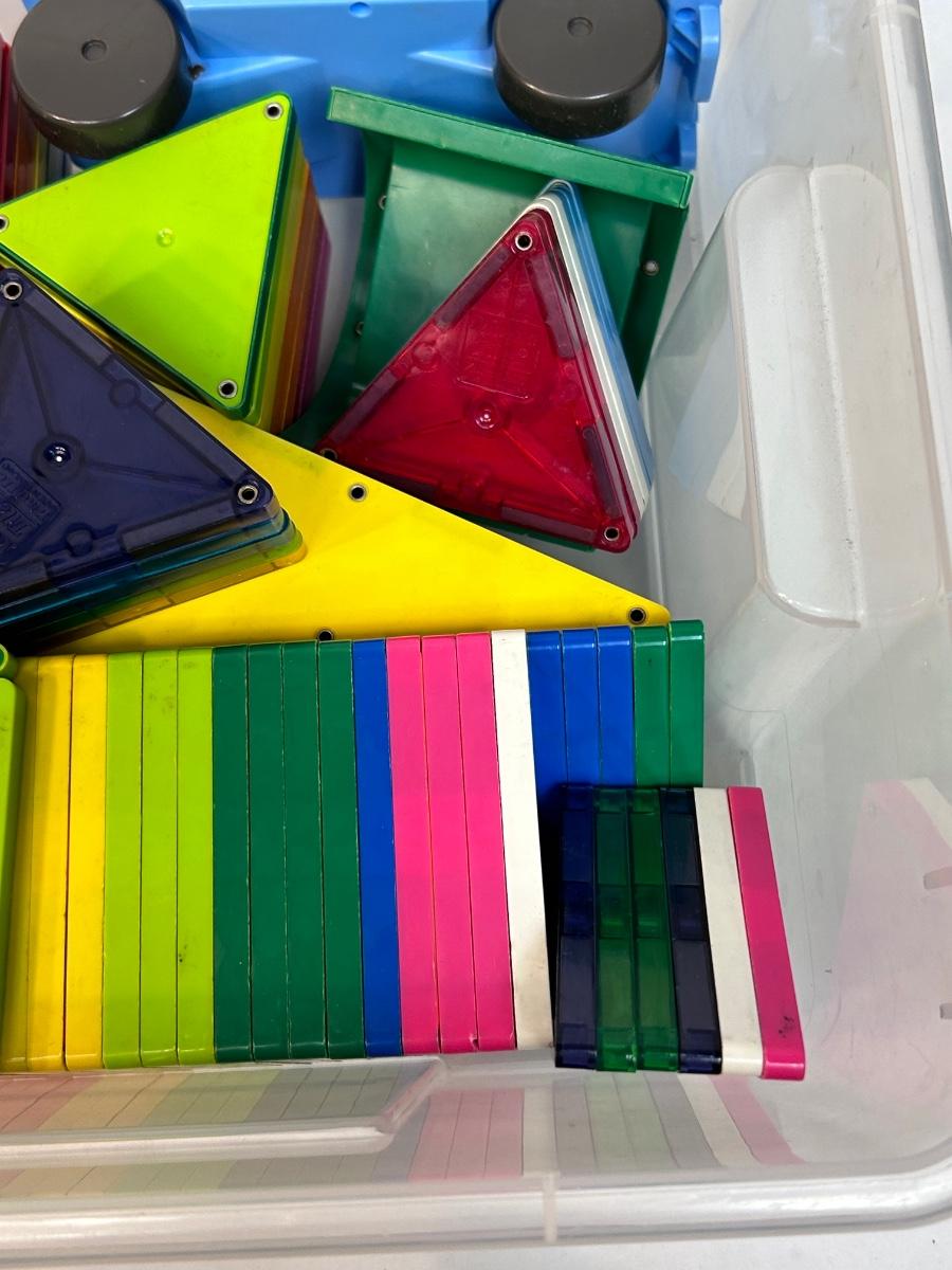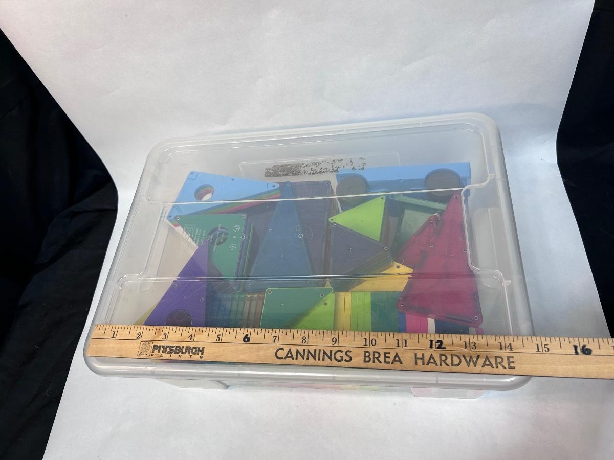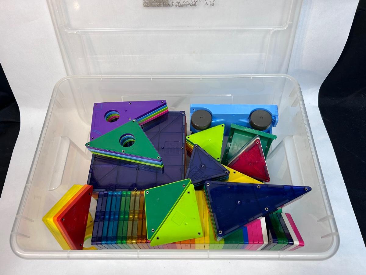 Large Lot of Magna Tiles Plastic Magnetic Building Blocks. Contain magnets, not recommend for small children. Large container of various sized Magna Tiles.