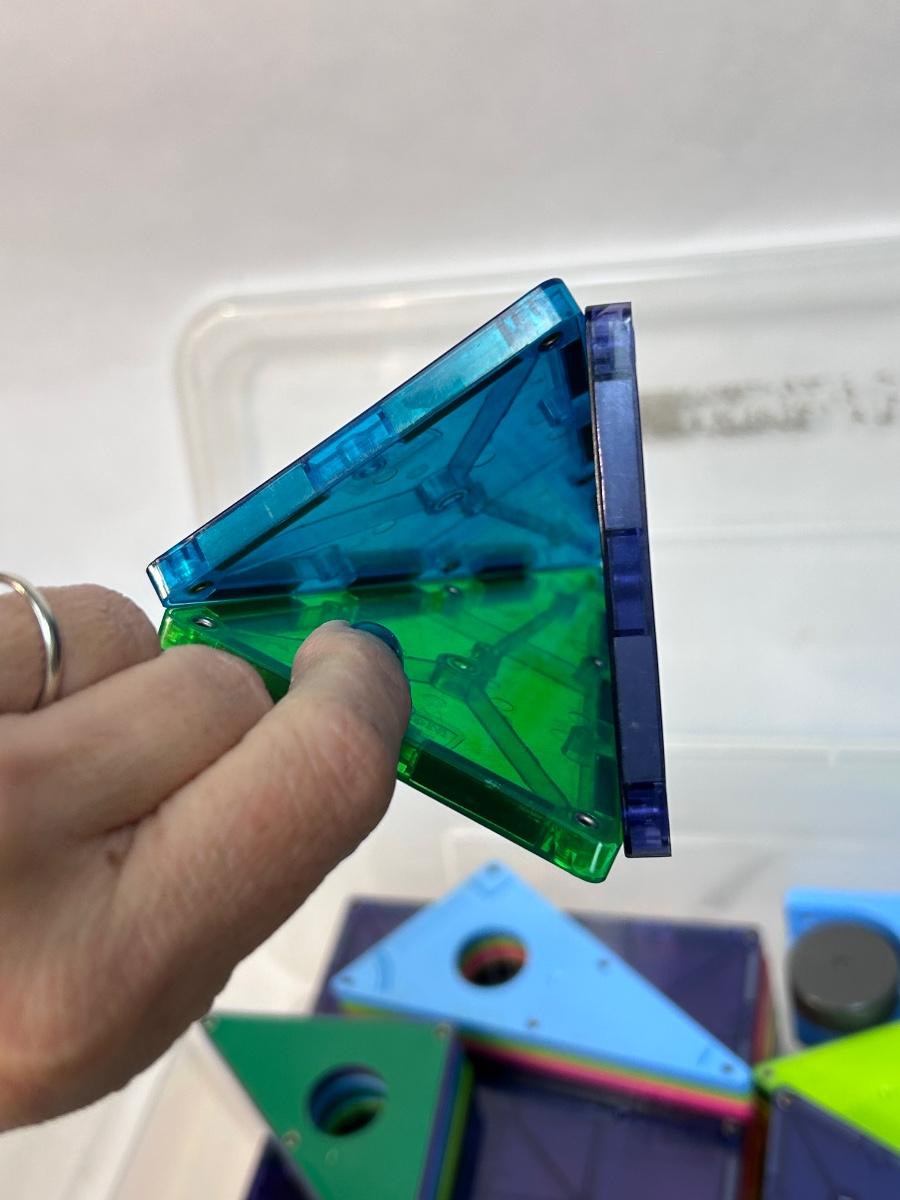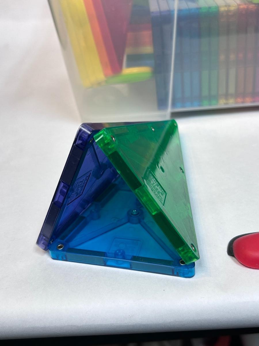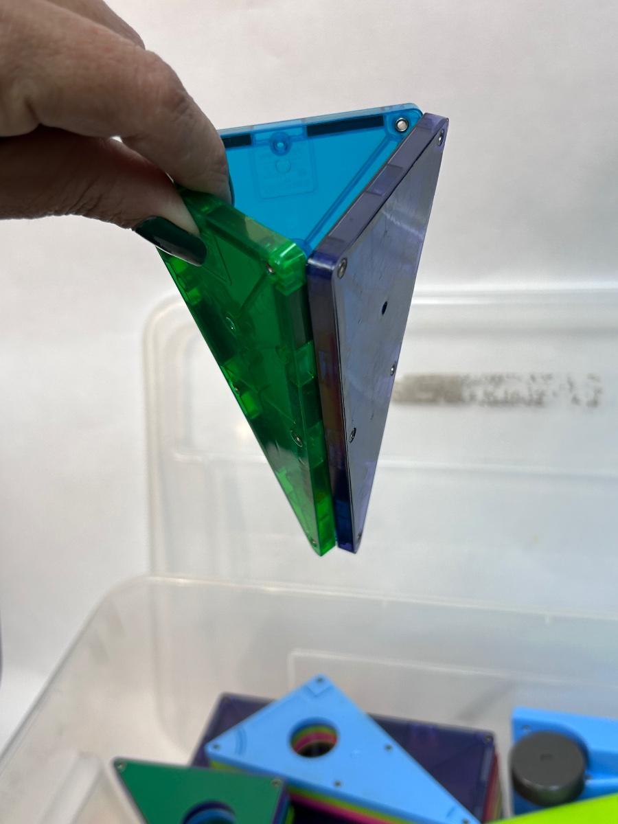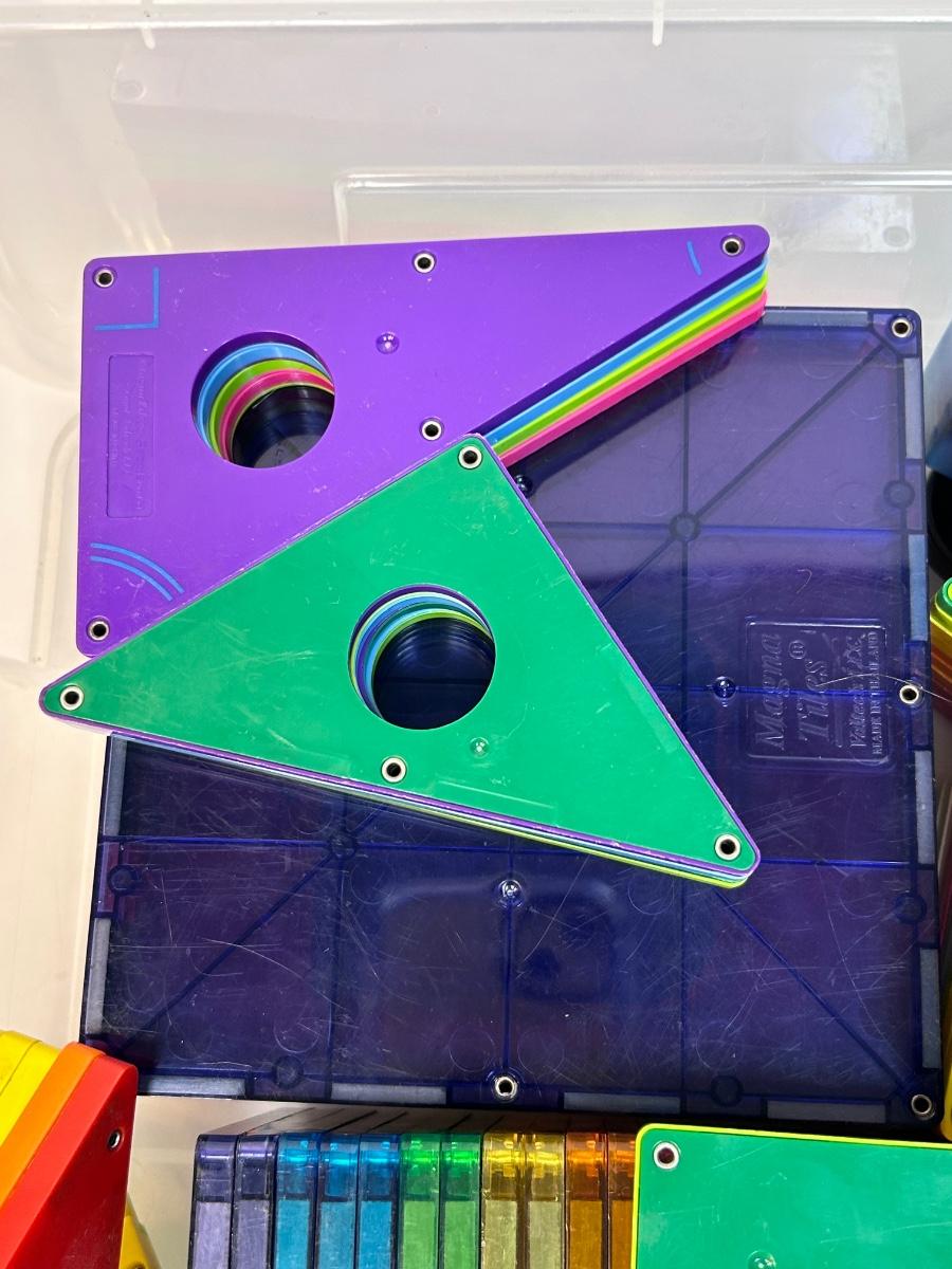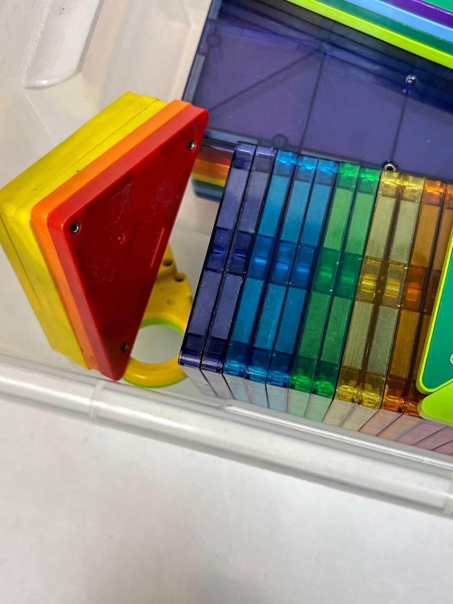 Large Lot of Magna Tiles Plastic Magnetic Building Blocks. Contain magnets, not recommend for small children. Large container of various sized Magna Tiles.