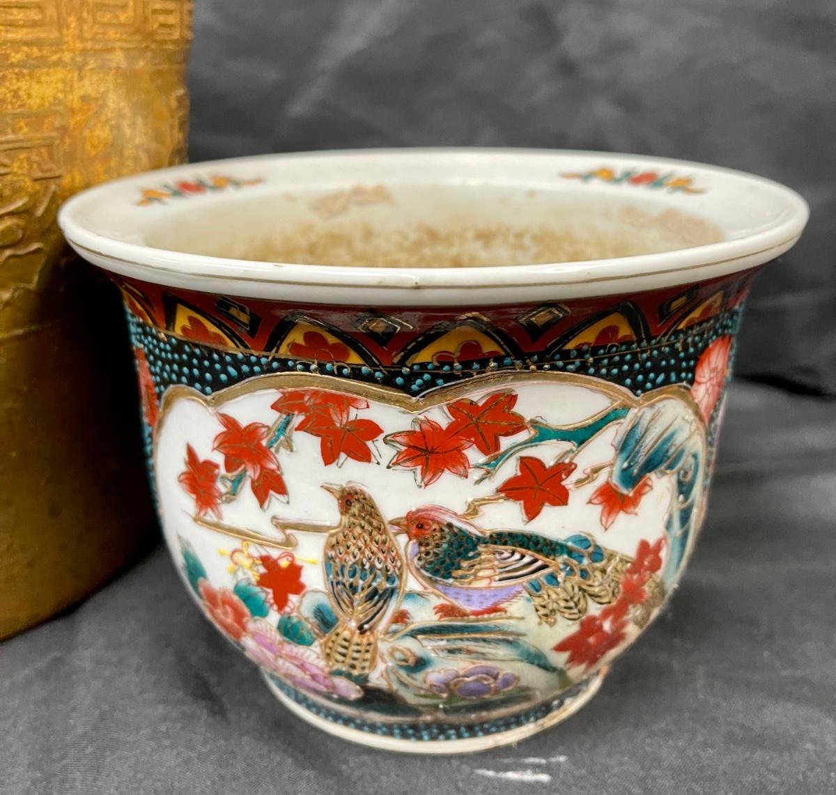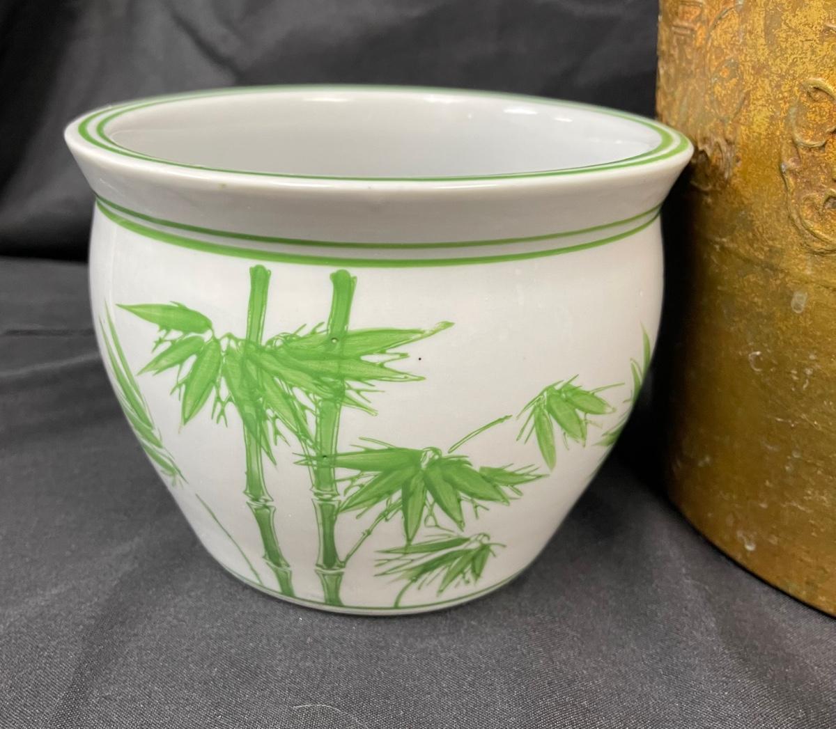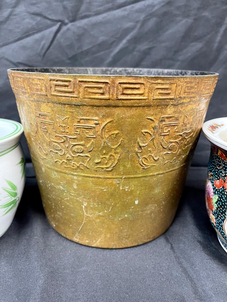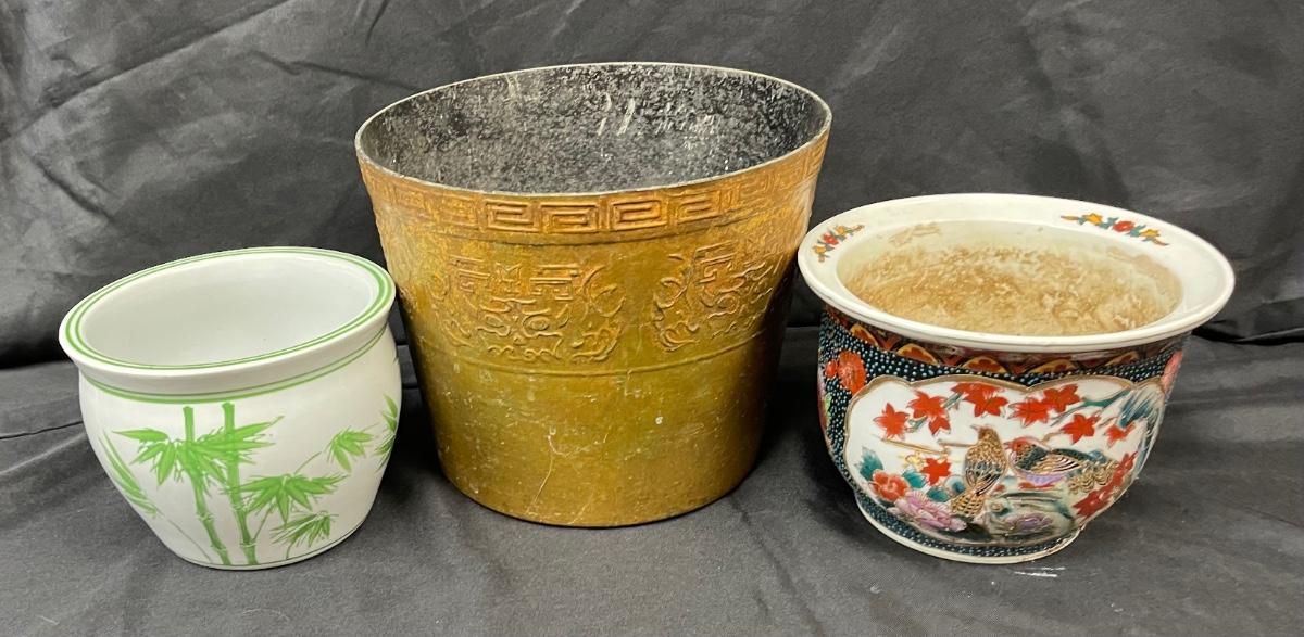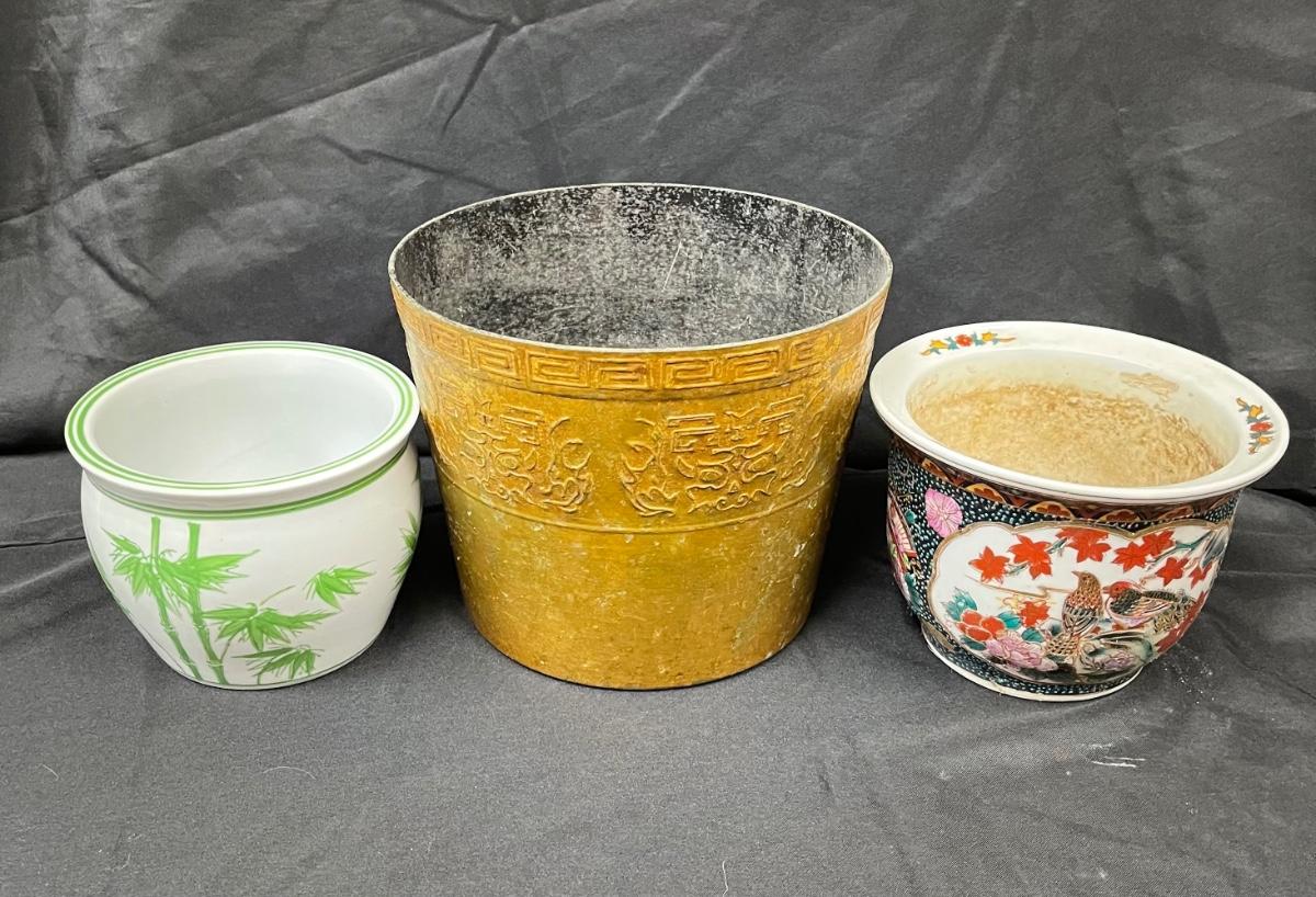 Lot of Three Previously Used Planter Pots Asian Motif Bamboo Greek Key