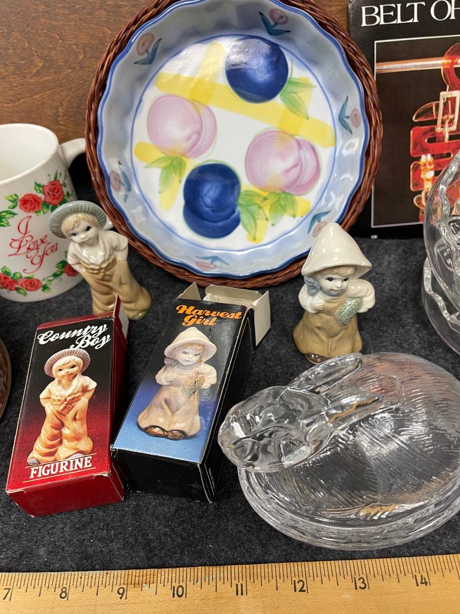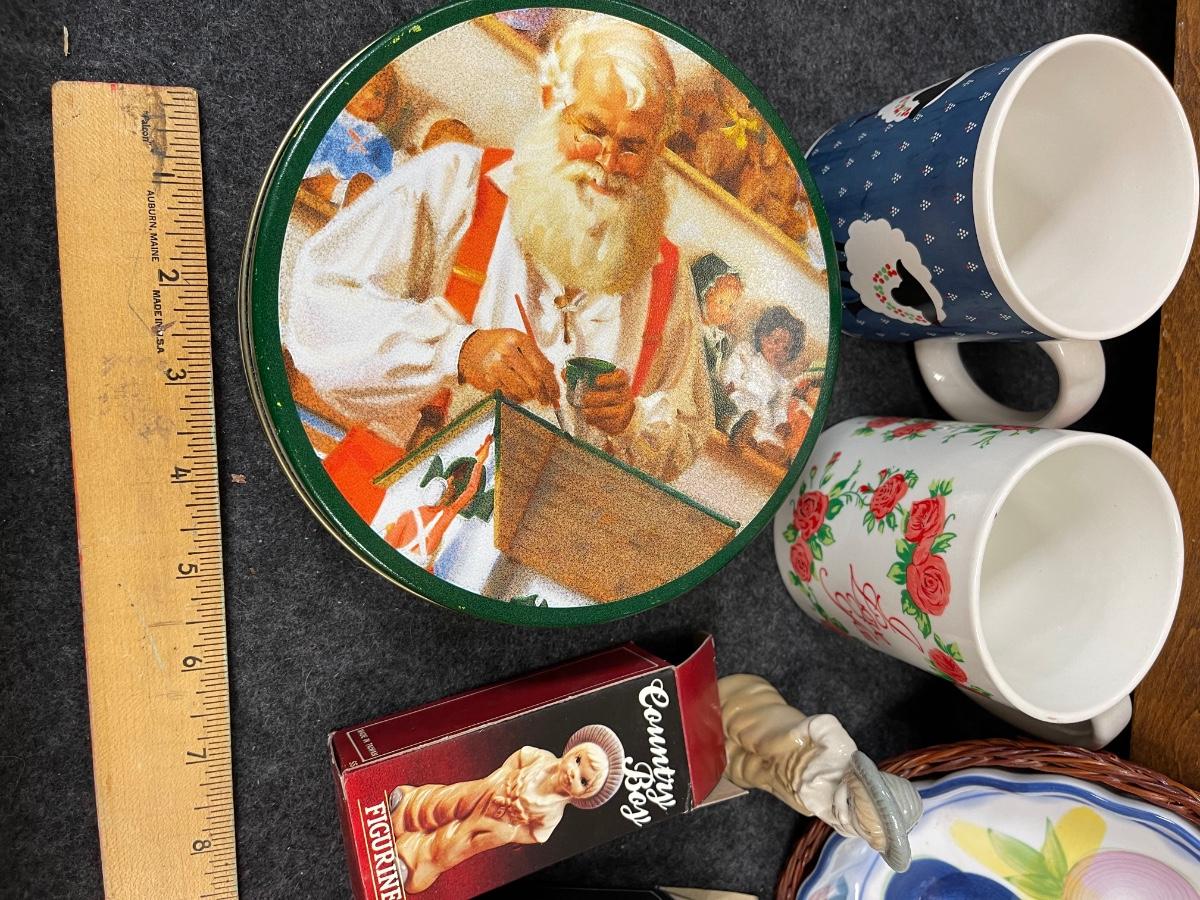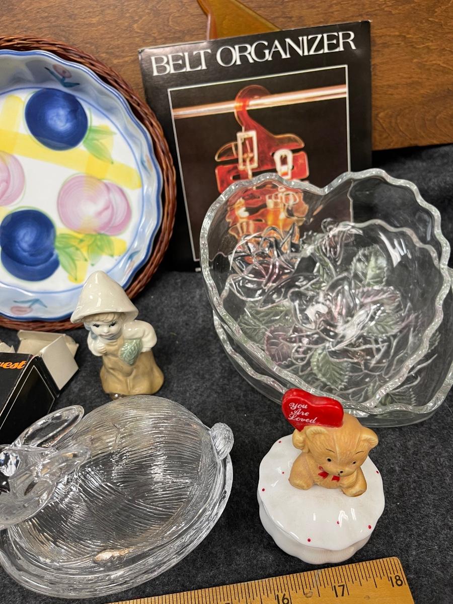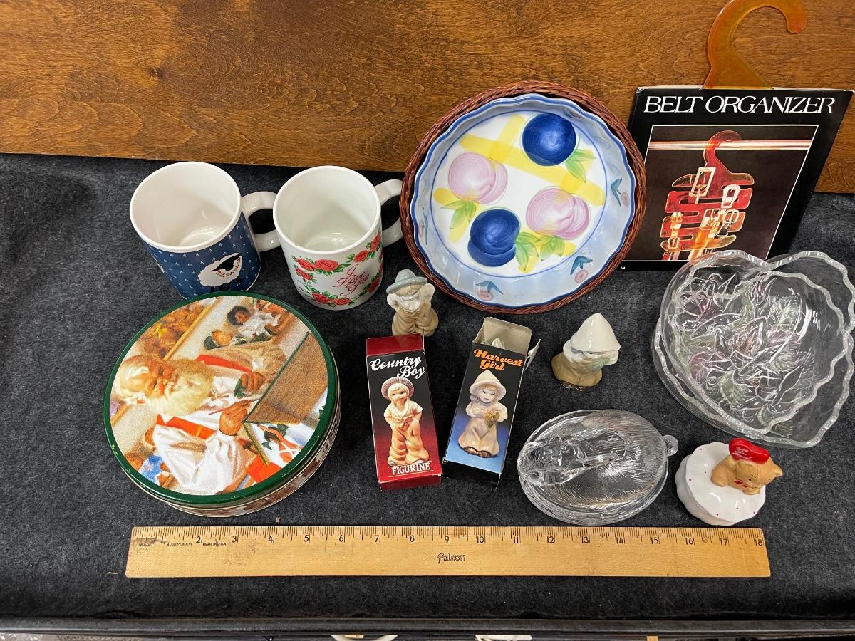 Coffee mugs, ceramic dish inside basket, tin can, 2 figurines, Glass Chicken on nest, 2 heart shaped glass dishes, tie organizer, and porcelain trinket dish with bear on the top.