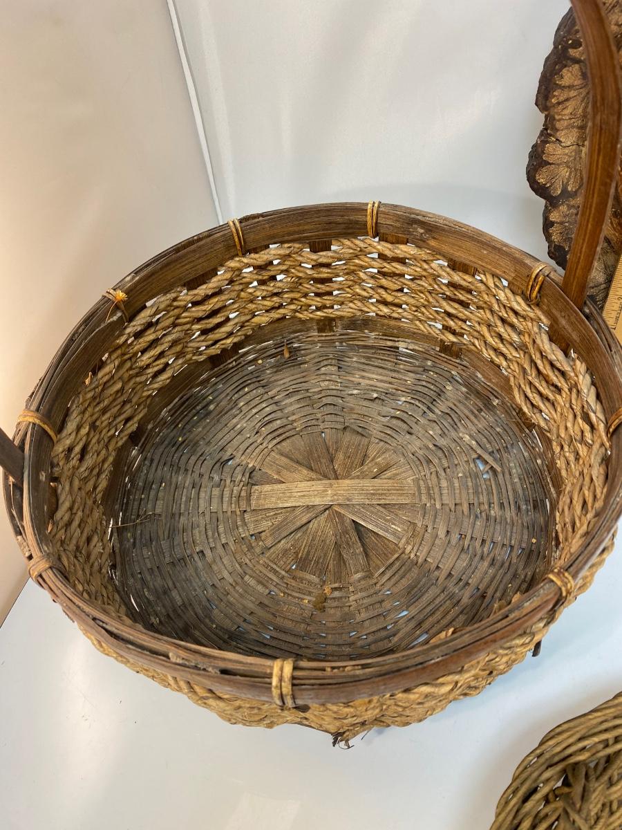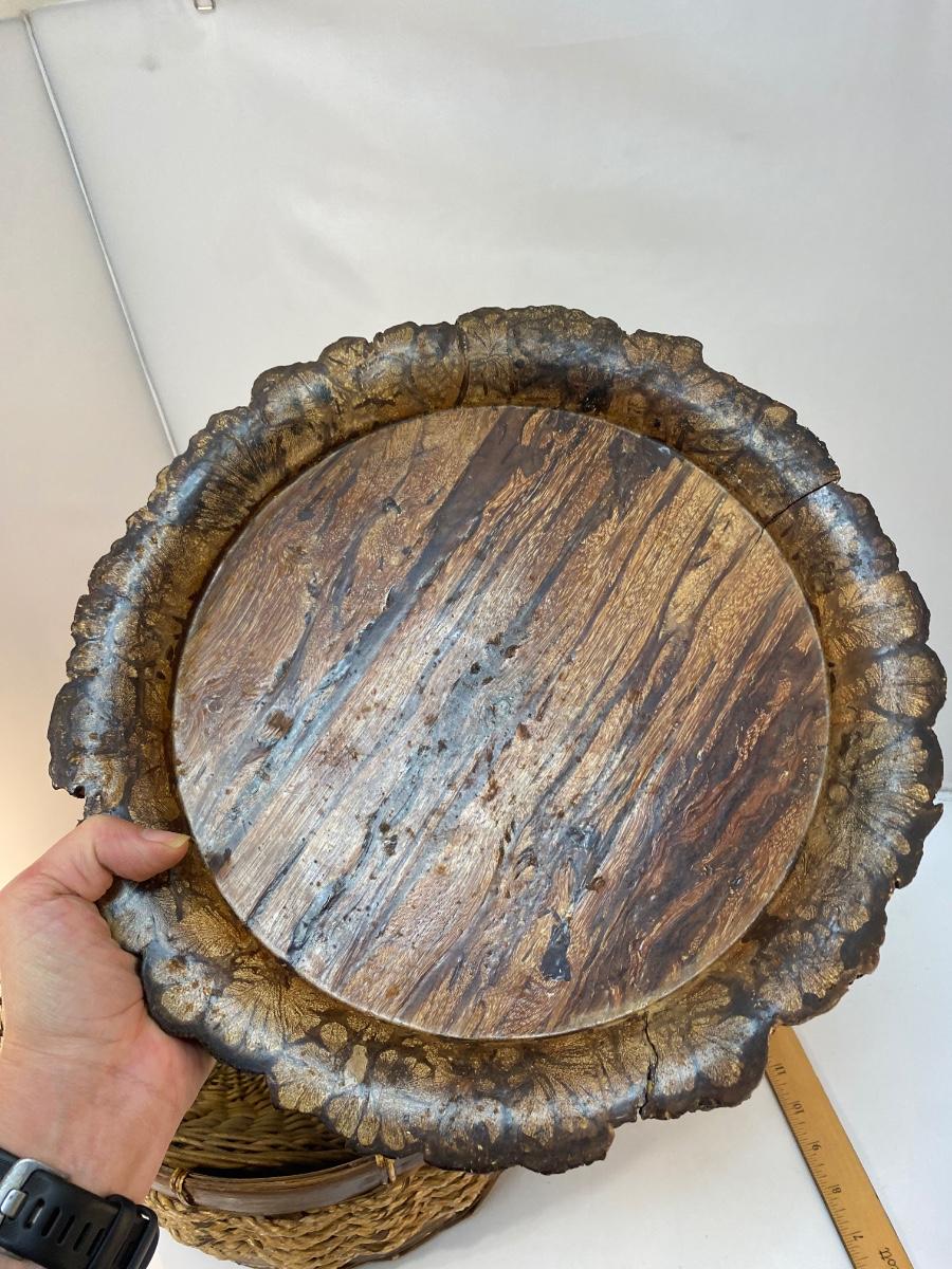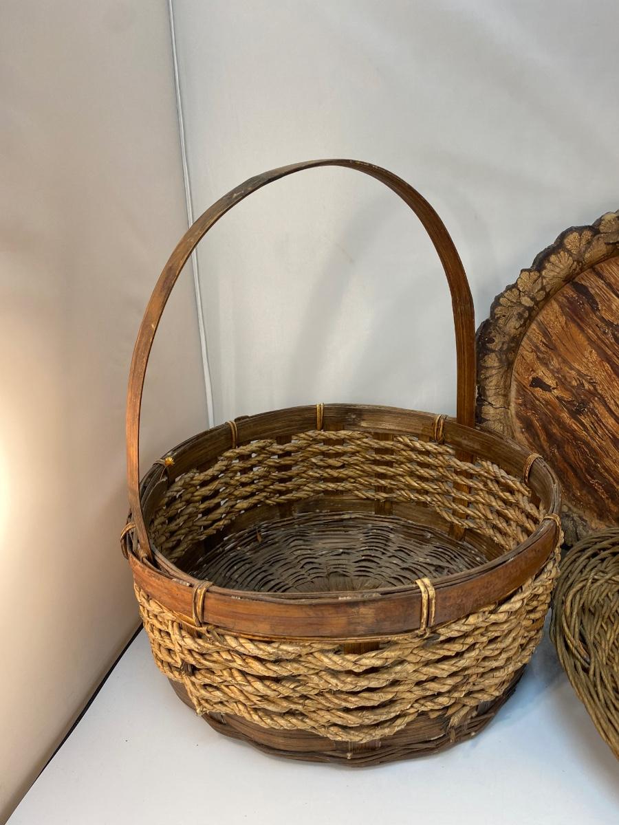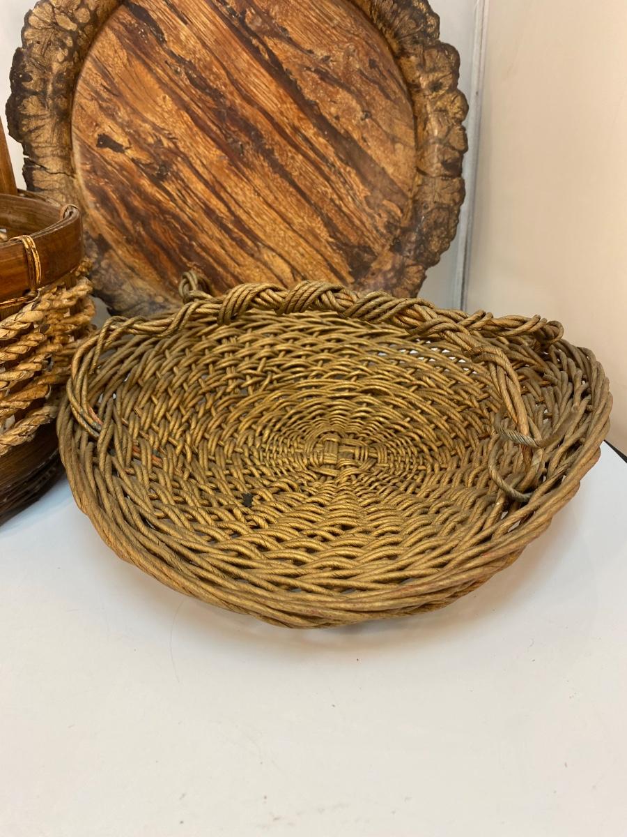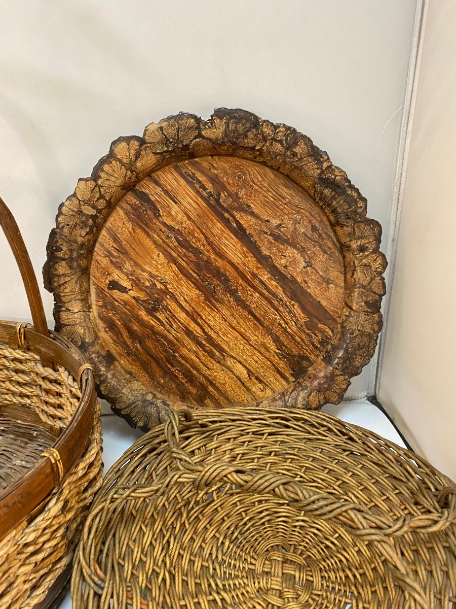 Rustic Home Decor Item Lot Baskets and Wood Stump Log Rough Edge Tray. Everything in fair/good previously used condition. Some signs of age giving them more of an aged rustic look. Wood tray looks like a veneer covered center and bottom not a finished wood.