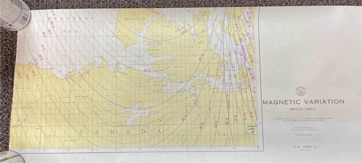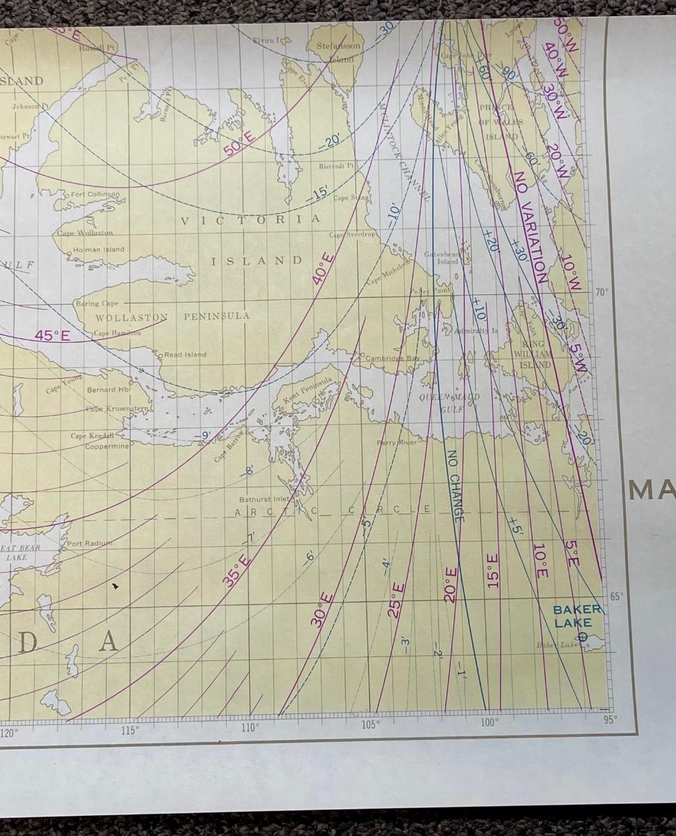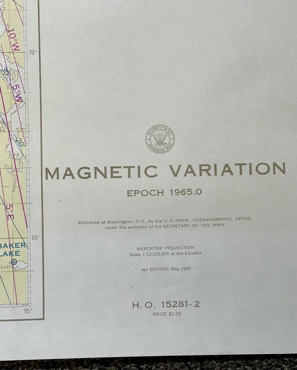 Shows magnet variation in Canada and the Other Canadian Territories. Published in 1965 by the US Naval Oceanographic Office. Mercator Projection style, approx 30" long.