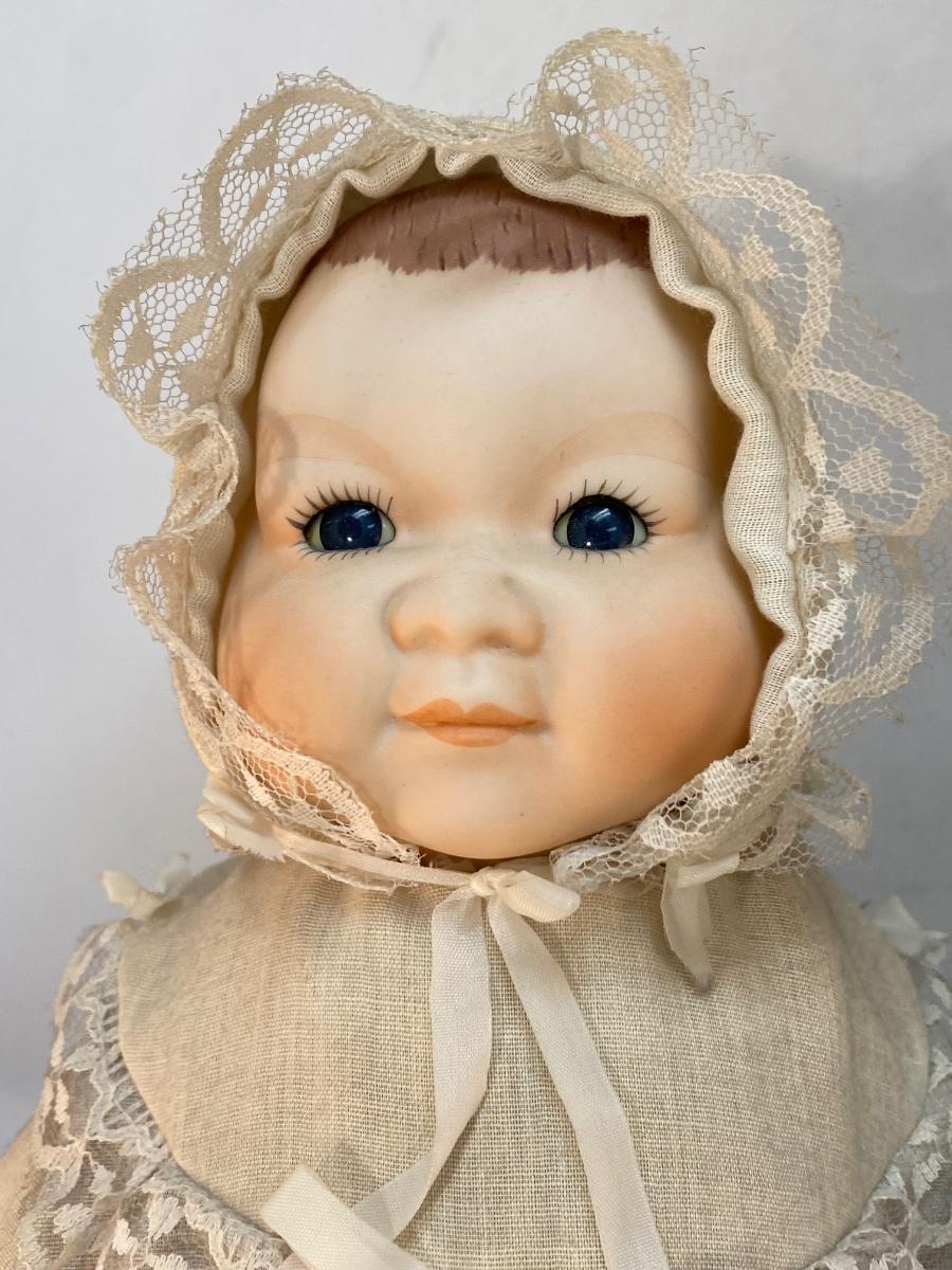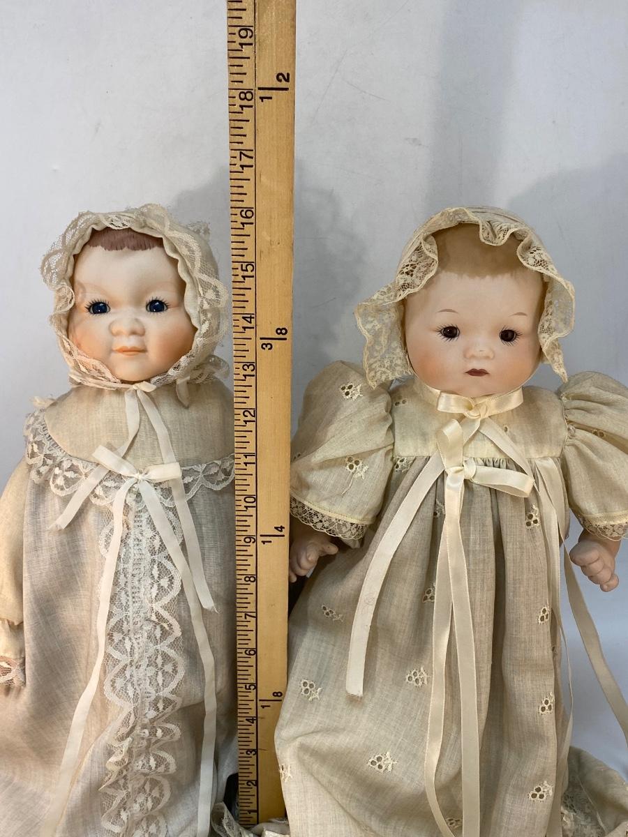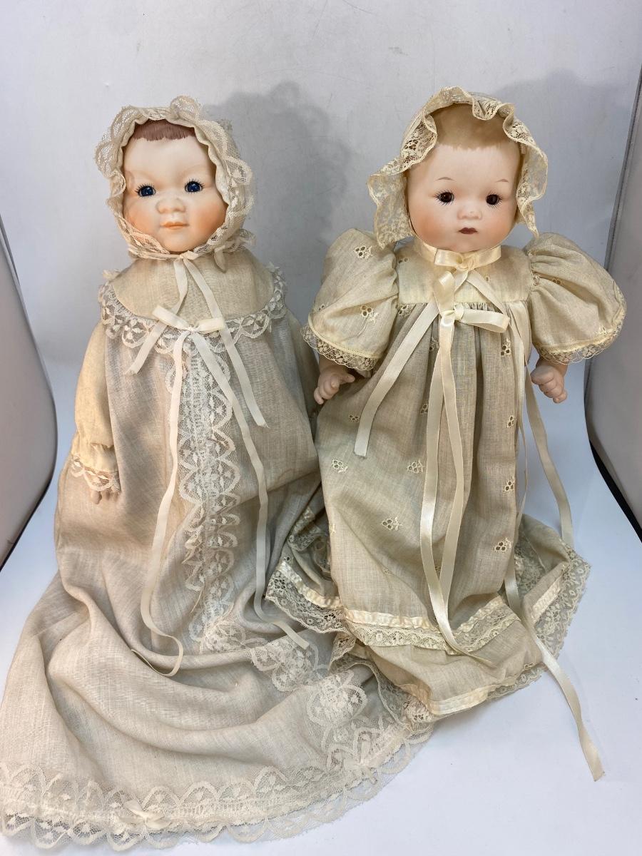 Pair of Vintage Bisque Porcelain Musical Lullaby Music Box Baby Dolls. Dolls in good condition, both work. They are dusty and clothes discolored from years of display, need a little TLC.
