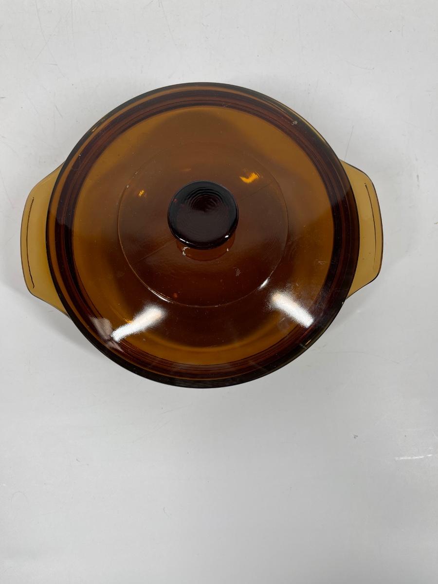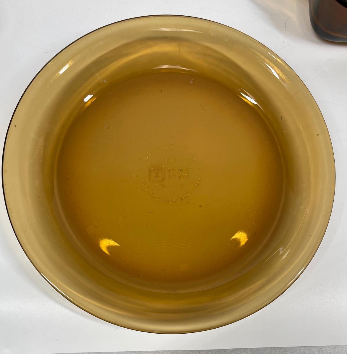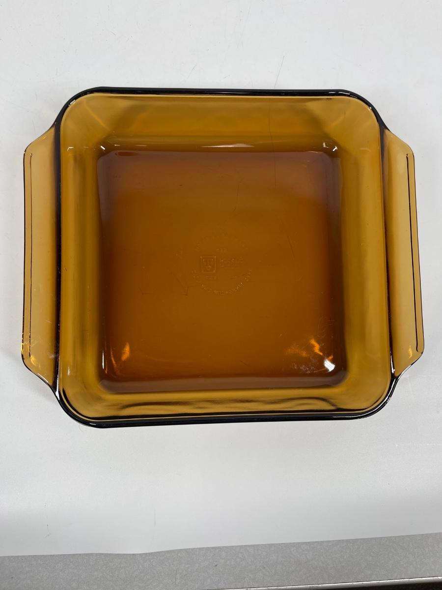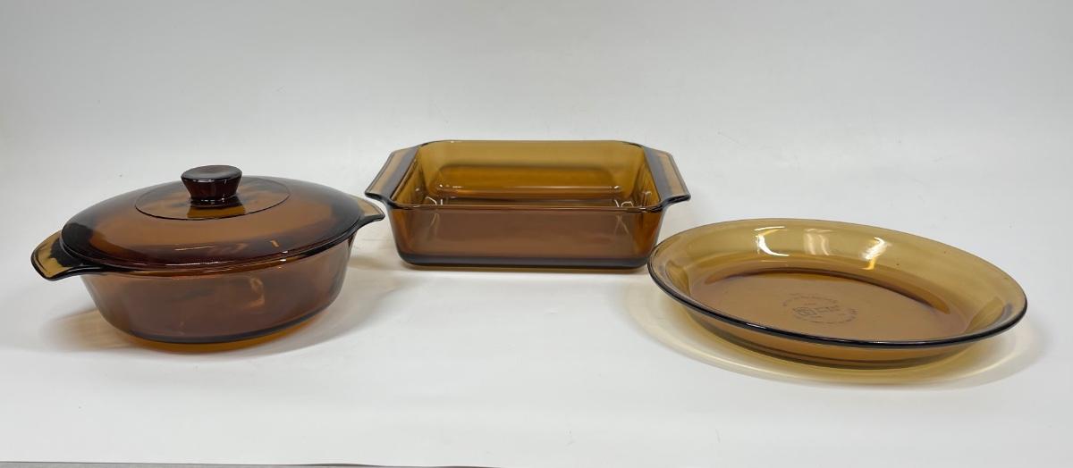 Set of Three Anchor Hocking Amber Glass Cookware Bakeware Pie Plate Loaf Pan Casserole Dish with Lid
