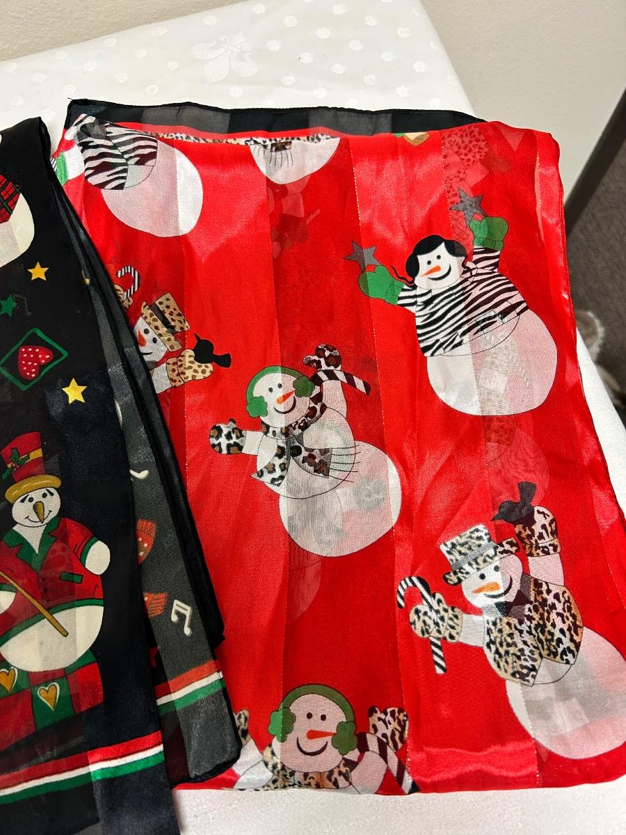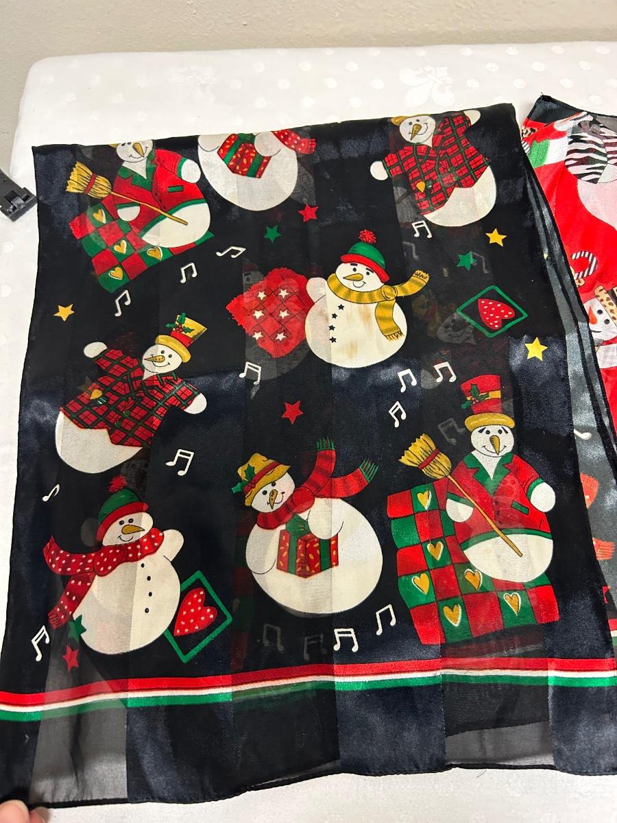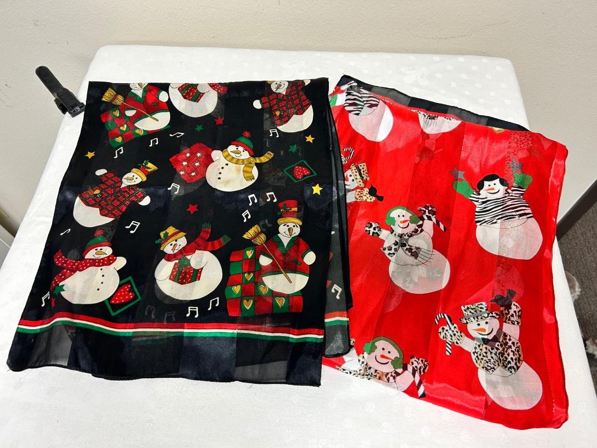 Pair of Snowman Holiday Christmas Scarves Hair Neck Scarf. No tags. I don't think they are silk, maybe polyester. Long about 4' length and 12" wide.