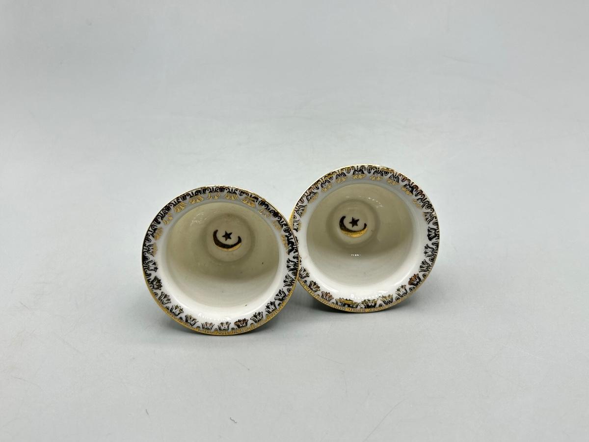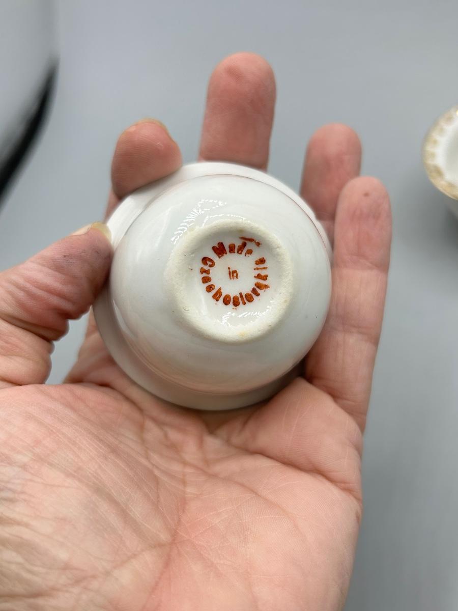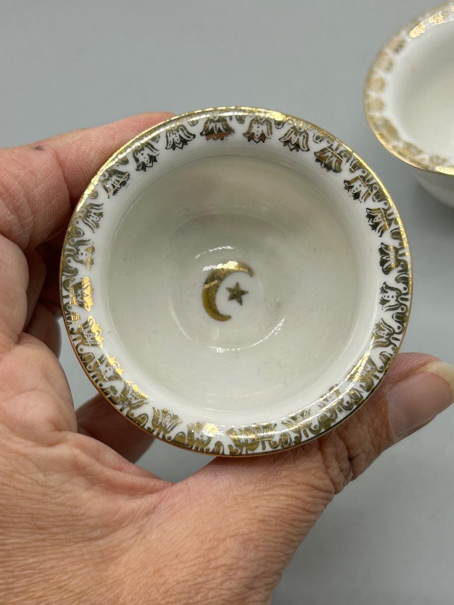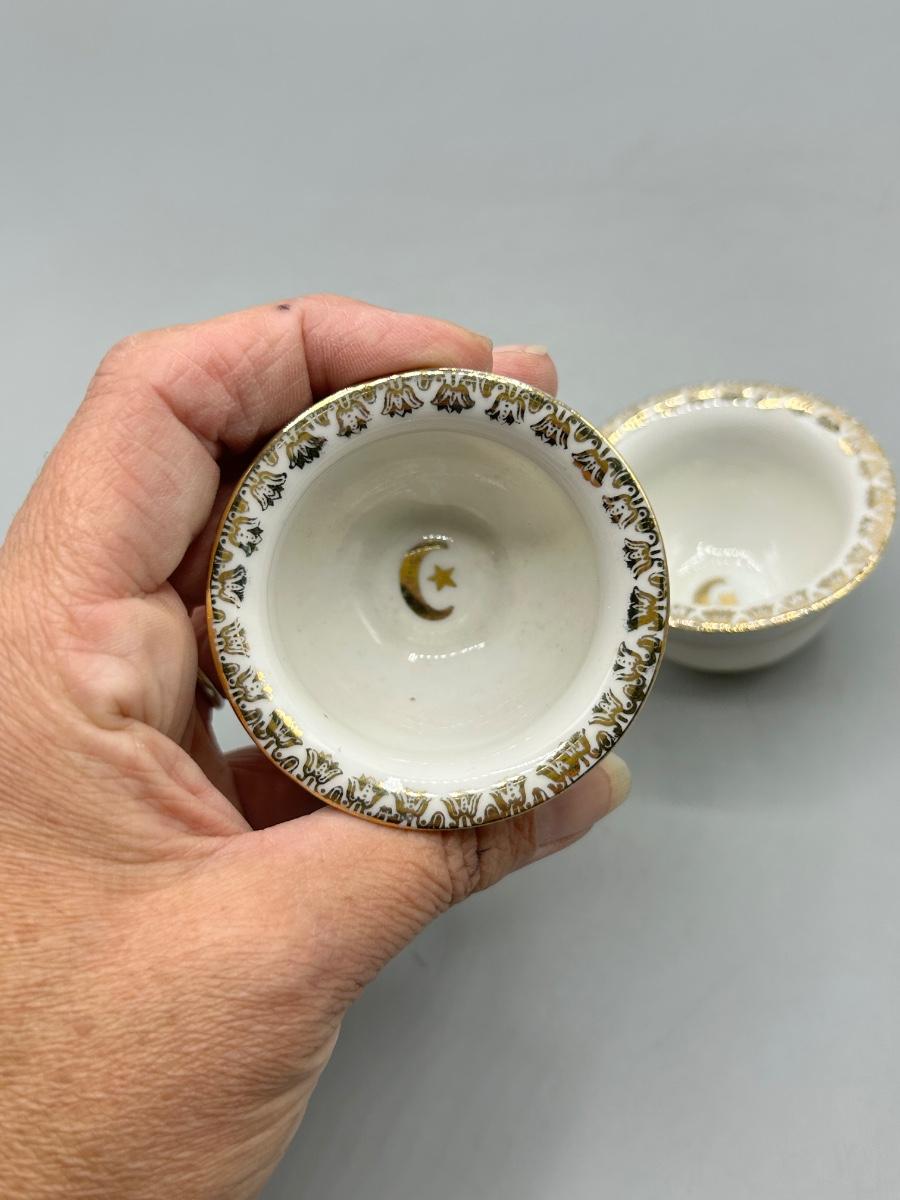 Pair of Small Vintage White with Gold Ceramic Egg Cup Handless Demitasse Teacup Bowl Czechoslovakia. In good vintage condition, light wear no chips. Crescent moon with star inside bottom.
